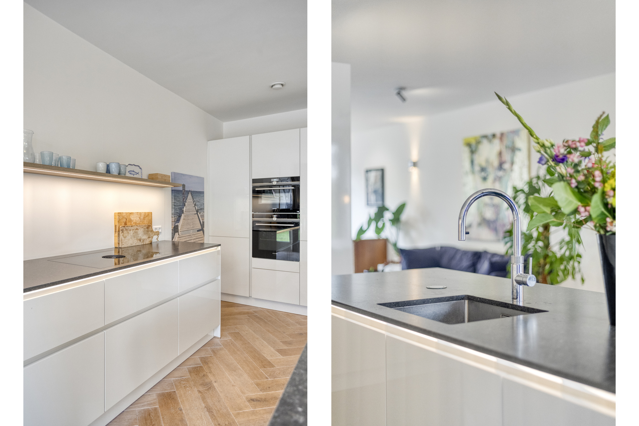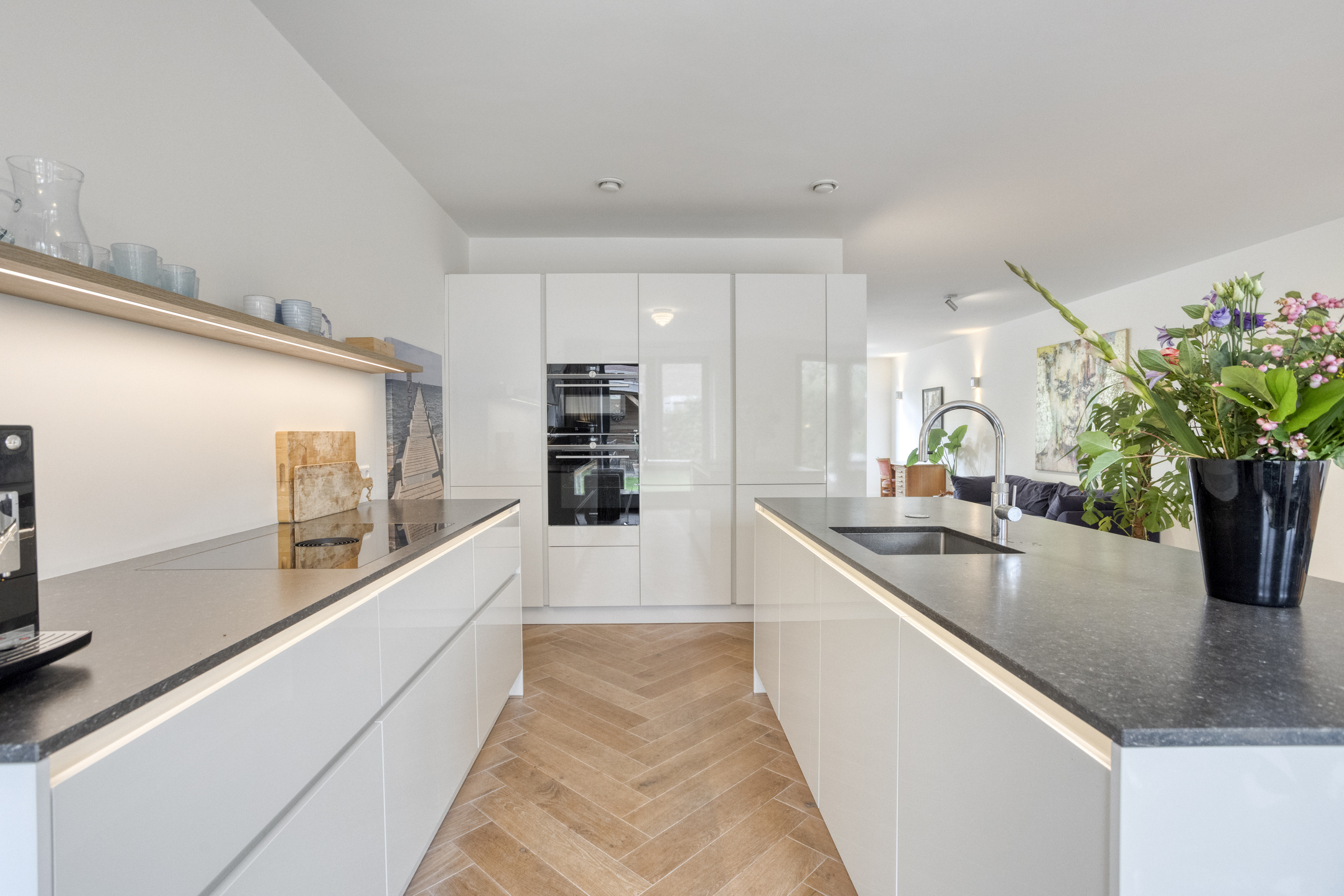 Ground floor: Entrance hall with modern toilet and cloakroom under the stairs. At the front, a bright and spacious L-shaped living room. At the rear, a generous kitchen-diner with cooking island and luxurious built-in appliances (double oven, wine fridge, stove with Bora extractor system, Quooker) and two sets of French doors leading to the garden.