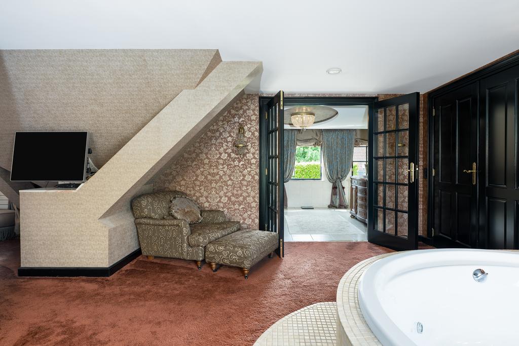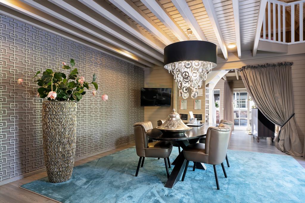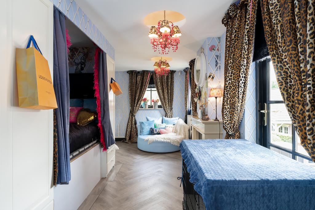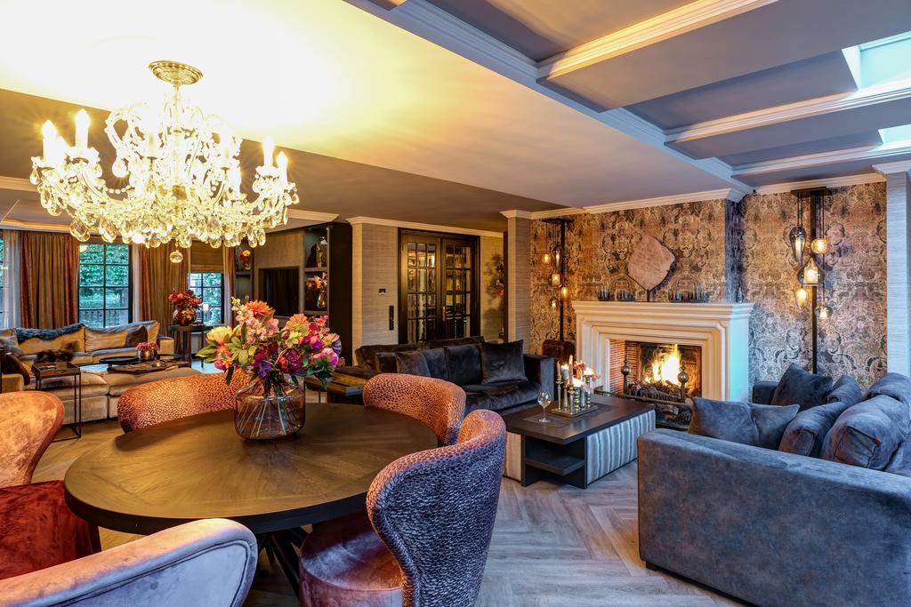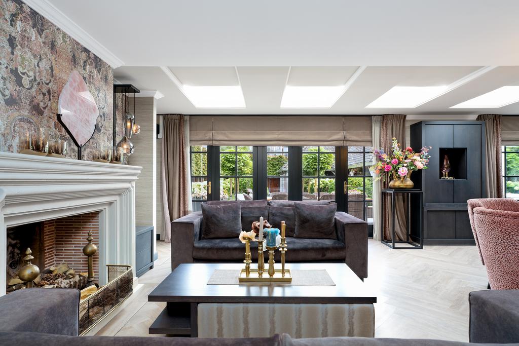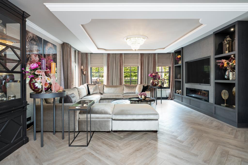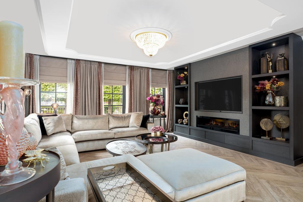 From the moment you step inside, it is clear that this is no ordinary home. The grandeur of the villa is accentuated by high-end finishes such as herringbone parquet floors, Italian marble bathrooms, luxurious window treatments, and handcrafted built-in wardrobes. The spacious living room features a stylish cinewall with a large flatscreen TV and an atmospheric fireplace (Anneke Dekkers).