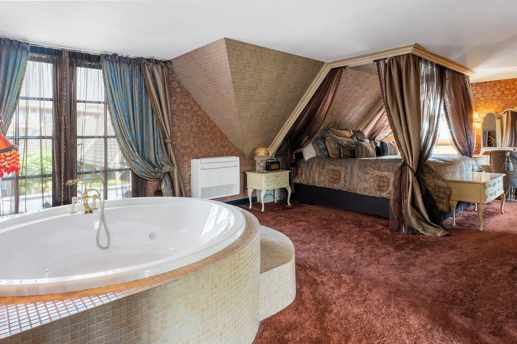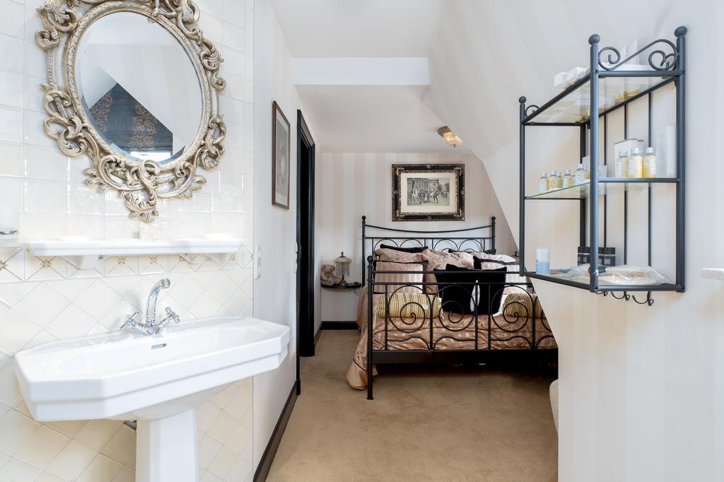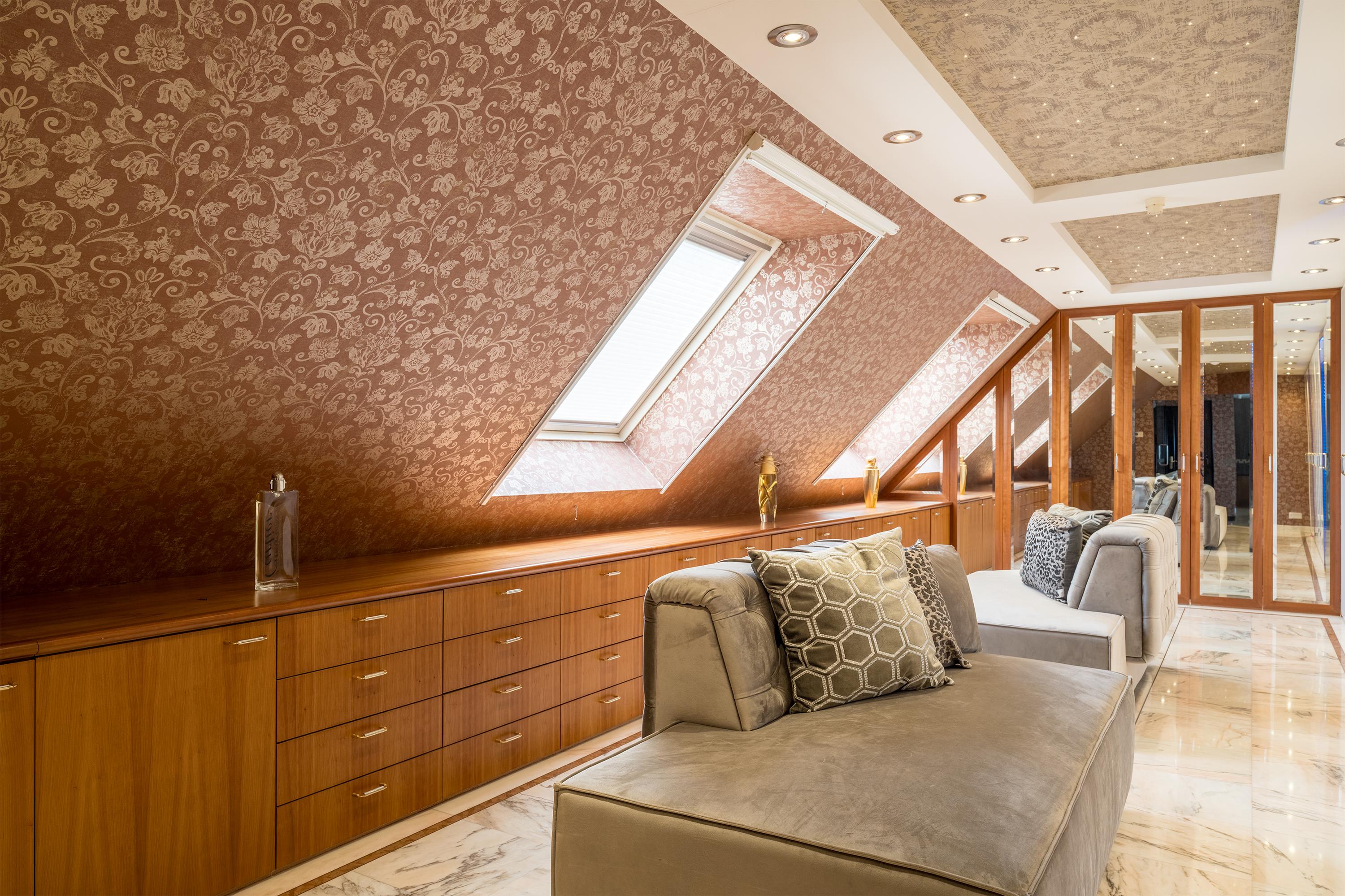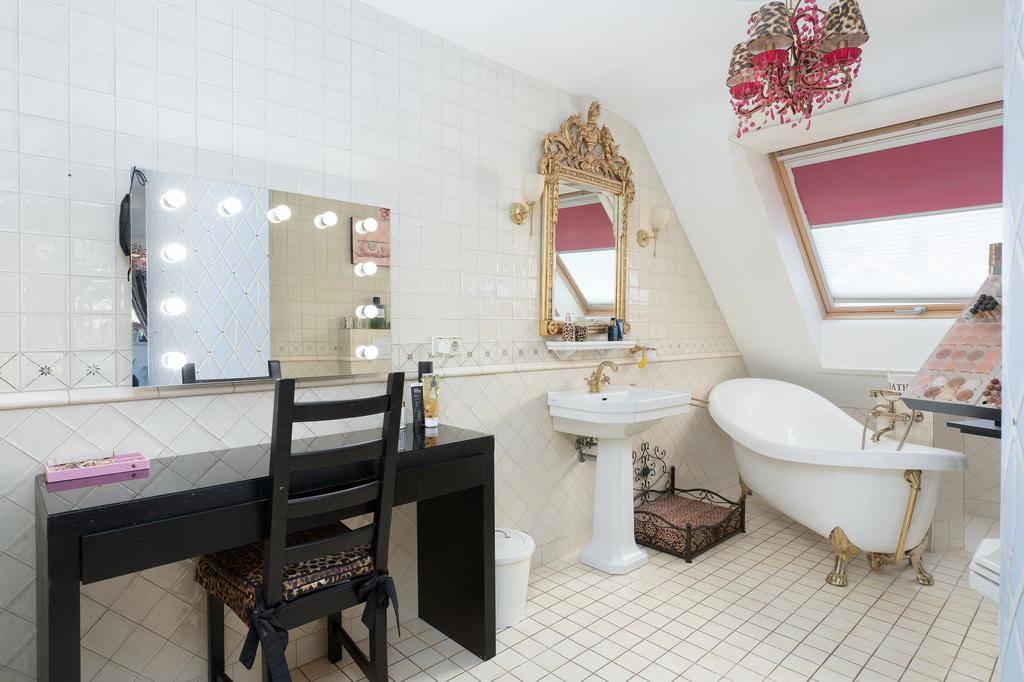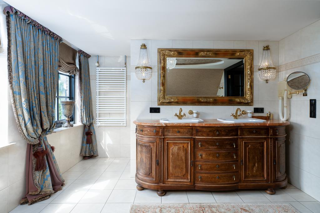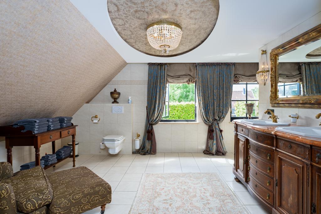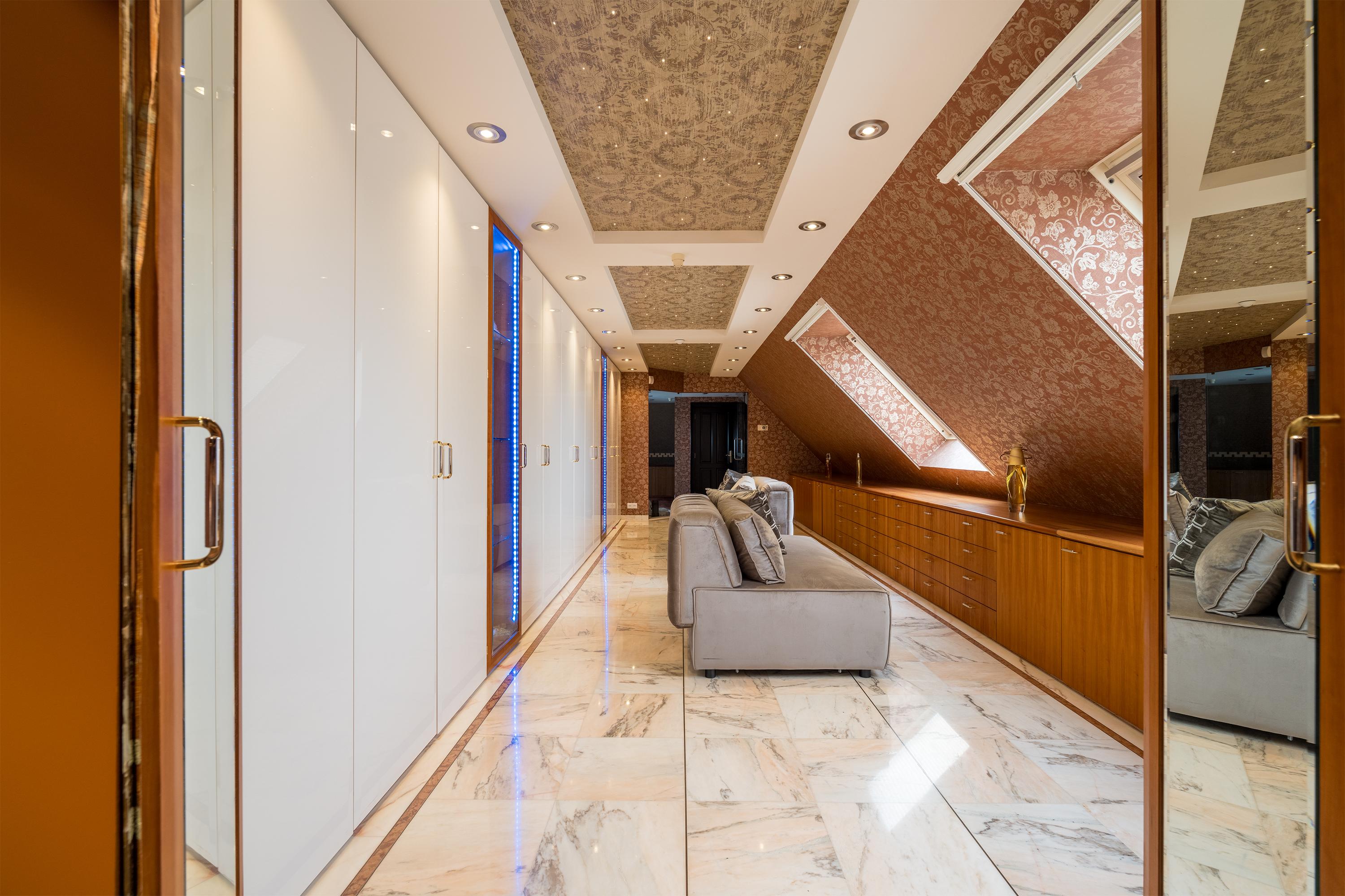 The first floor boasts three spacious bedrooms, each with a private bathroom. The master suite is in a league of its own, featuring a freestanding round bathtub, an en-suite bathroom with a toilet, an exclusive antique vanity (Pander) with double sinks, and a spacious walk-in shower. The suite also has direct access to the wellness area on the ground floor via a private staircase. A true eye-catcher is the impressive 50 m² walk-in closet, complete with a custom wardrobe system, mirrors, atmospheric lighting, and a marble floor. All bedrooms are equipped with air conditioning.