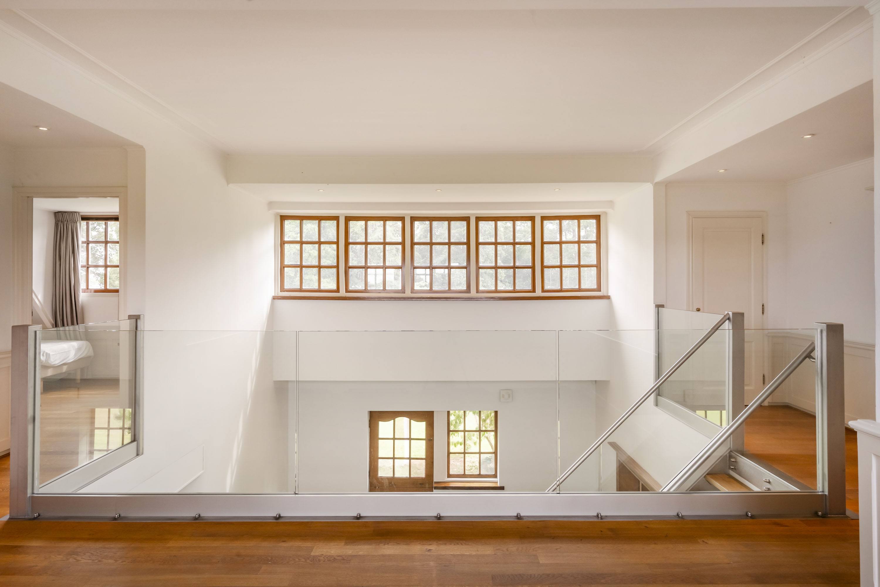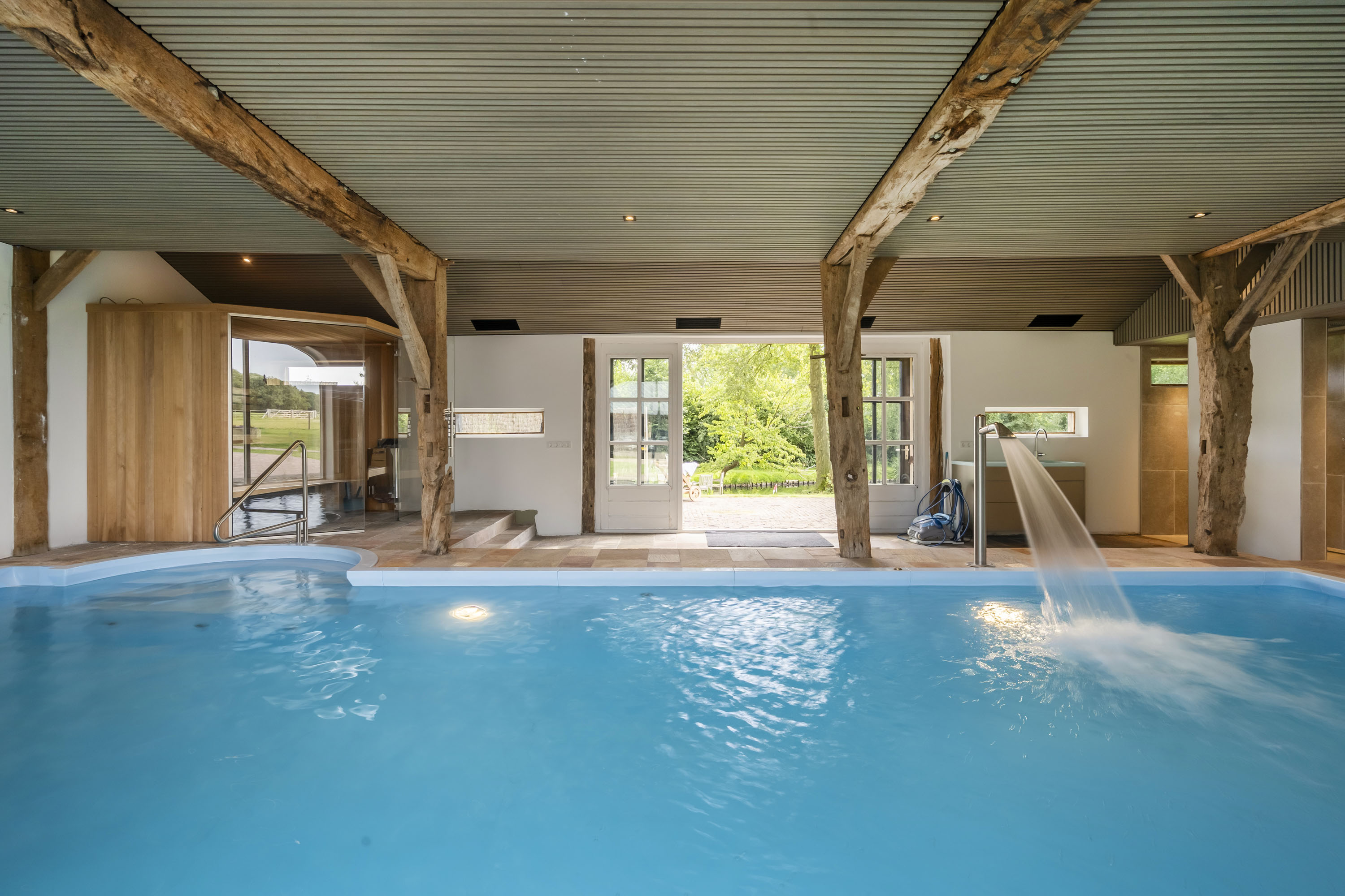 Interiors evoke restrained luxury: a live-in kitchen clad in stone and steel, living spaces under solid oak floors, and bedrooms offering privacy and comfort. The master suite features an ensuite bathroom with a steam shower cabin. Subtle grandeur flows through the conservatory and continues outdoors, where terraces, lawns, and mature trees embrace the home in a timeless landscape. The estate includes a private wellness outbuilding with an indoor pool, sauna, expansive gym area, and jacuzzi terrace, amplifying its sense of sanctuary.