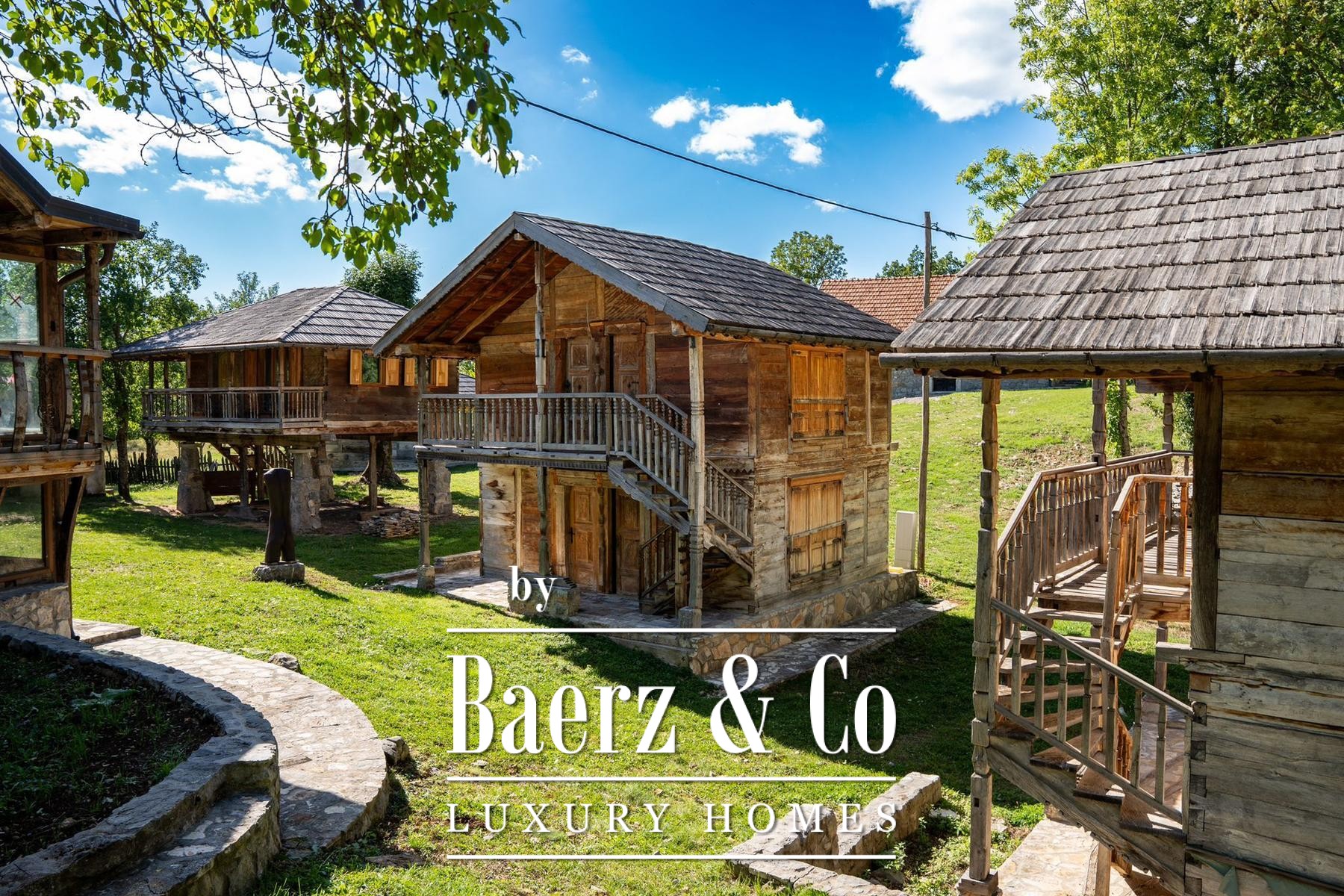 Estate for sale Plitvička Jezera presents a rare opportunity to acquire a fully gated 40,000 m² estate, composed of 11 meticulously renovated and stylistically cohesive houses. The property stands as a unified retreat, complete with controlled access and deep privacy. At its heart lie a main residence and a spacious communal house, equipped with a chef’s kitchen and generous dining area conceived for gatherings, corporate programs, or creative retreats. Nine additional guest houses, each offering two bedrooms with private bathrooms, provide a total minimum of 22 en-suite rooms suited for hosting up to 44 guests.