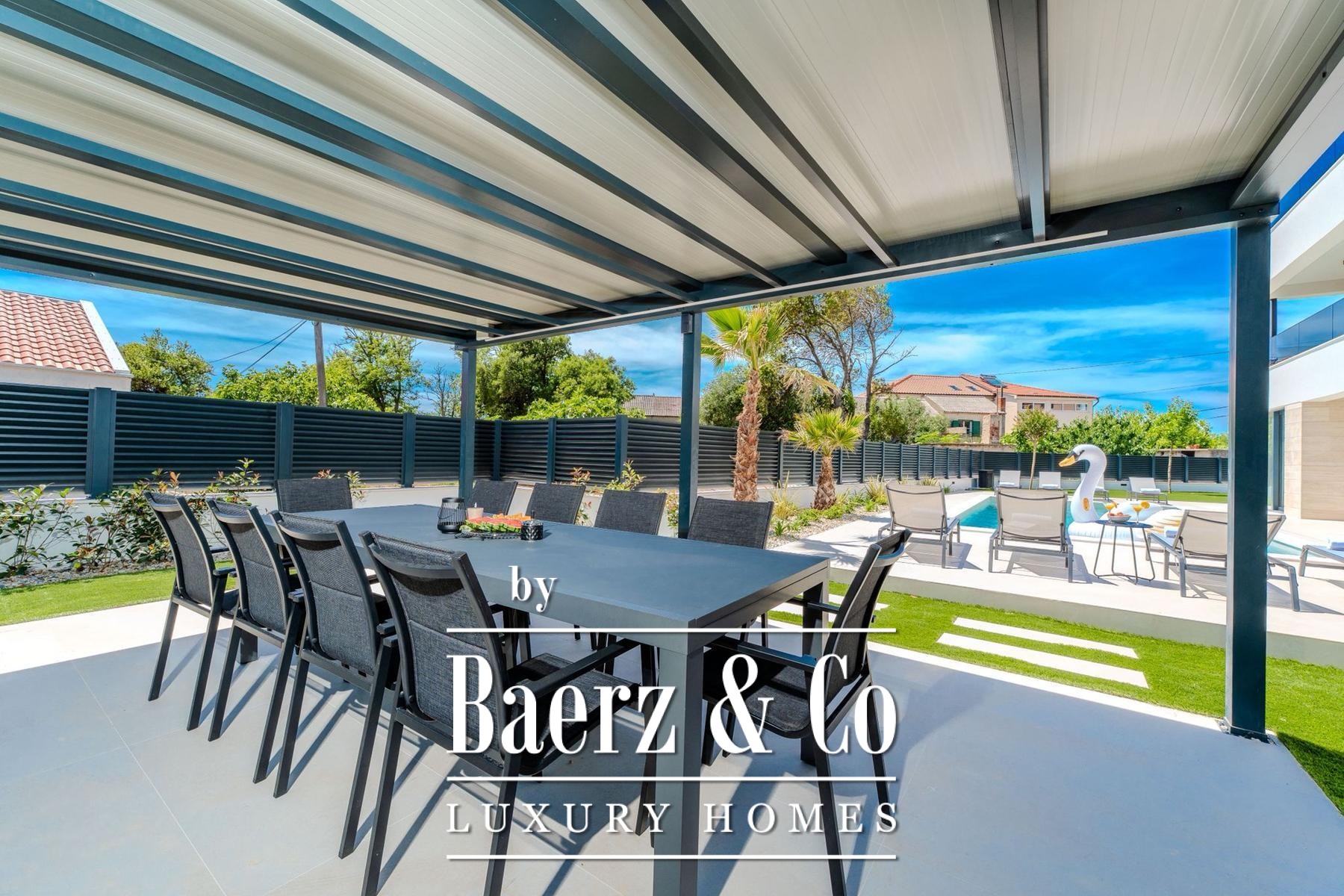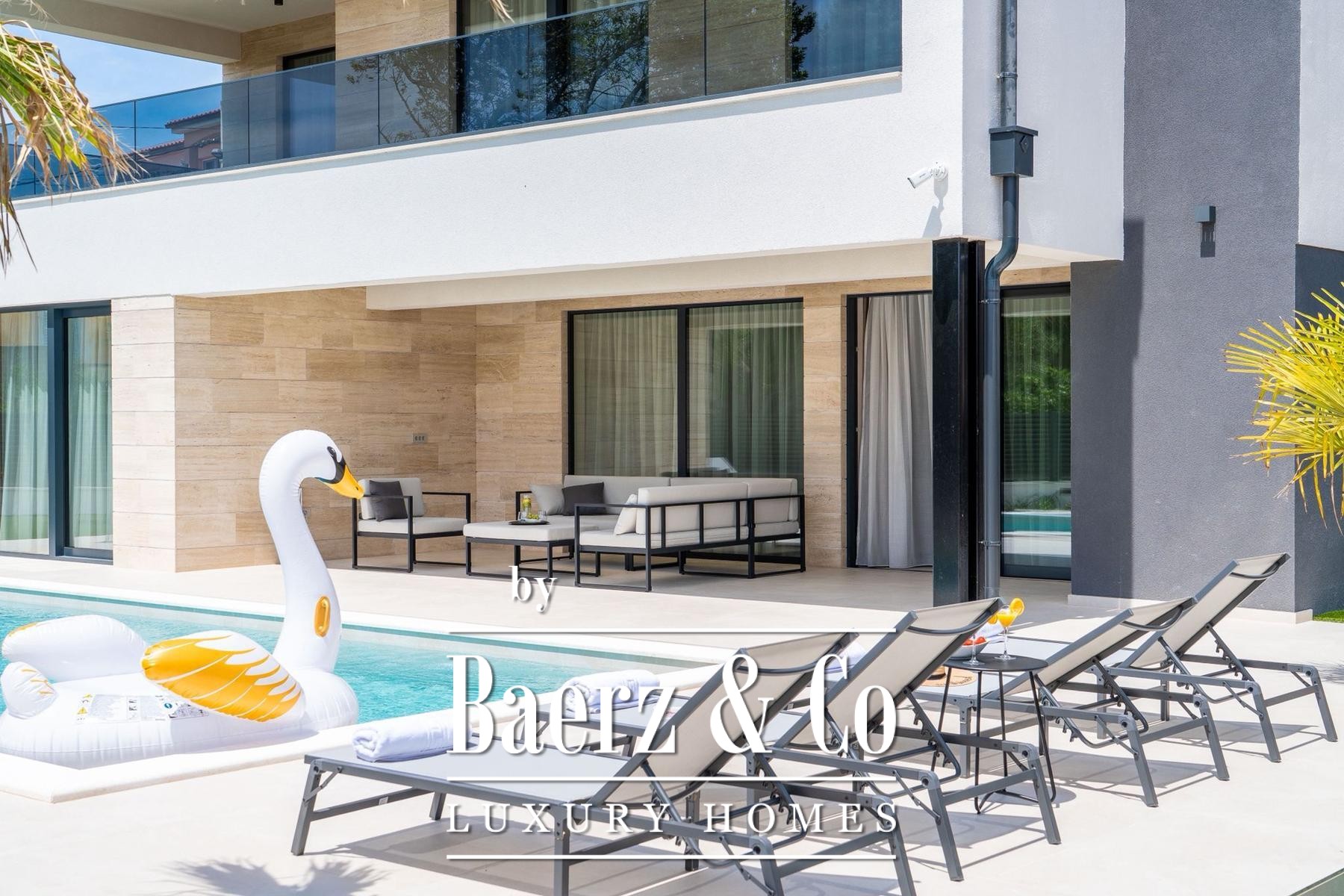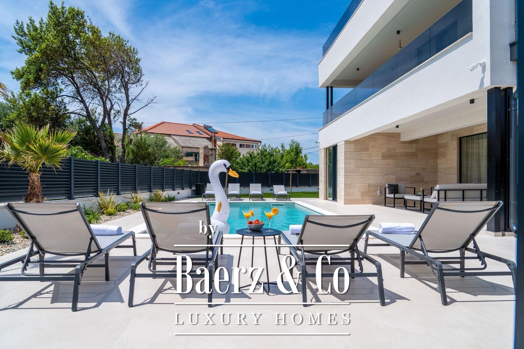 Covered and uncovered terraces extend the living spaces, combining Mediterranean sun with sheltered relaxation. The landscaped garden and sunbathing area convey privacy, while secure parking with video surveillance further enhances peace of mind. Mere steps from well-maintained beaches, this villa for sale in Privlaka aligns architectural elegance with Mediterranean leisure, equally suited for discreet family residence or luxury tourist rental. Each architectural detail reflects functionality and enduring quality, cultivating a setting of restraint, comfort, and light.