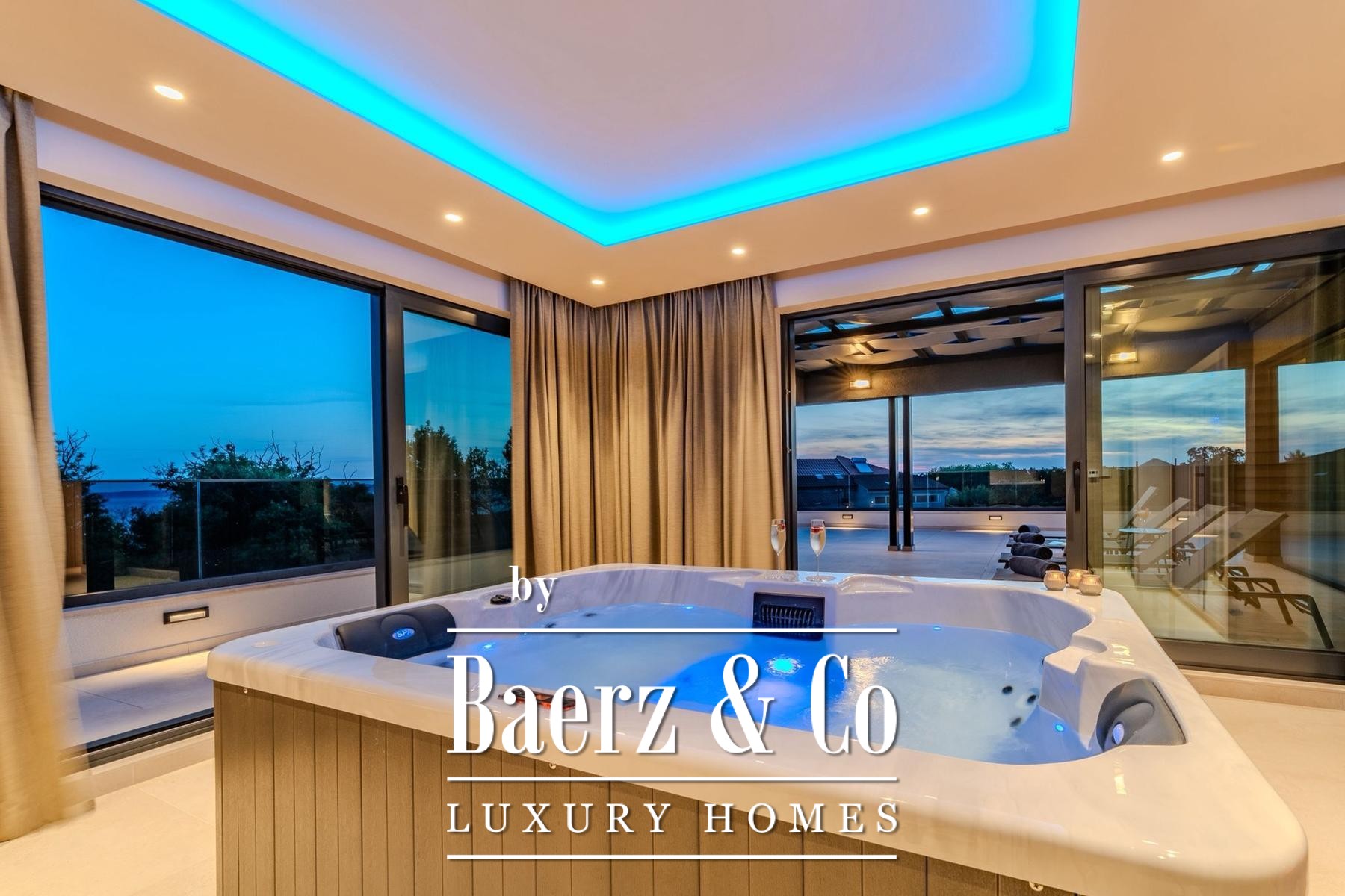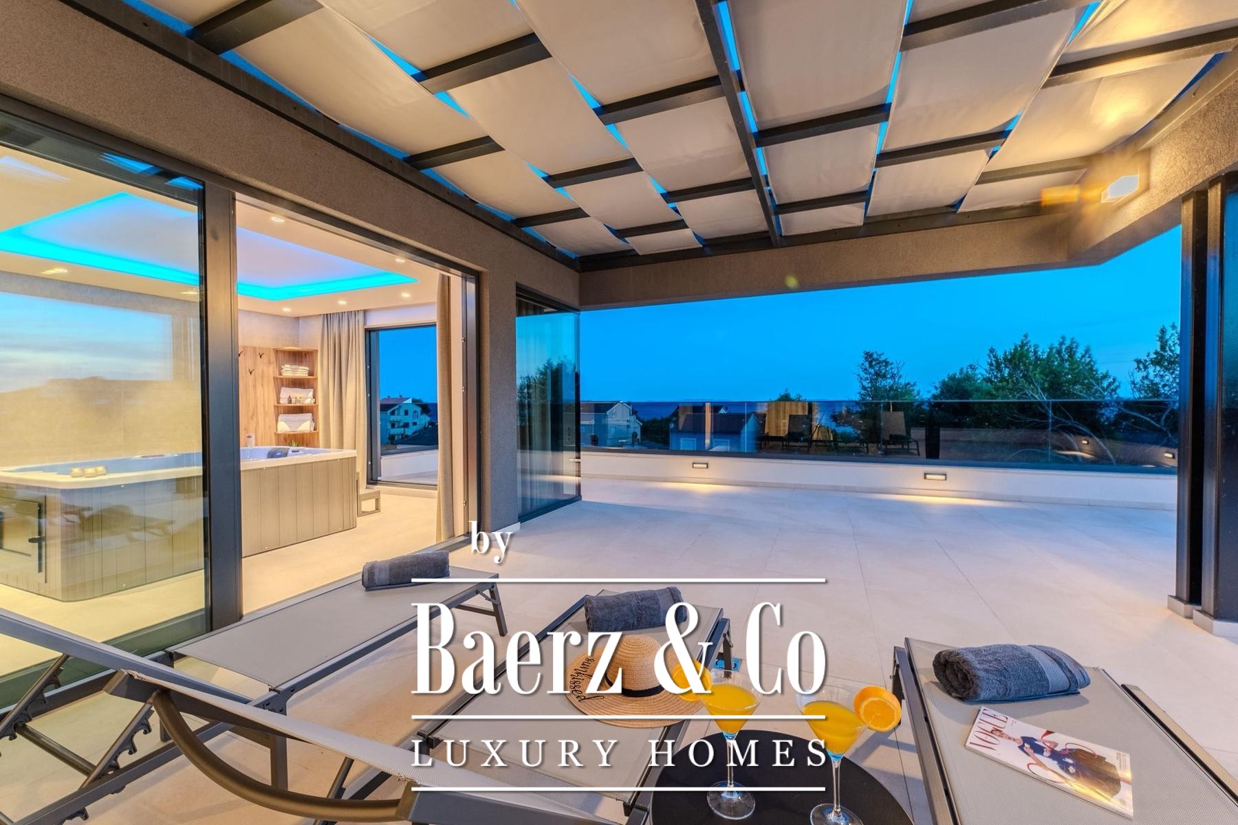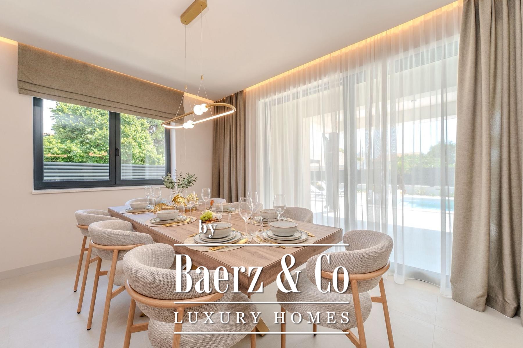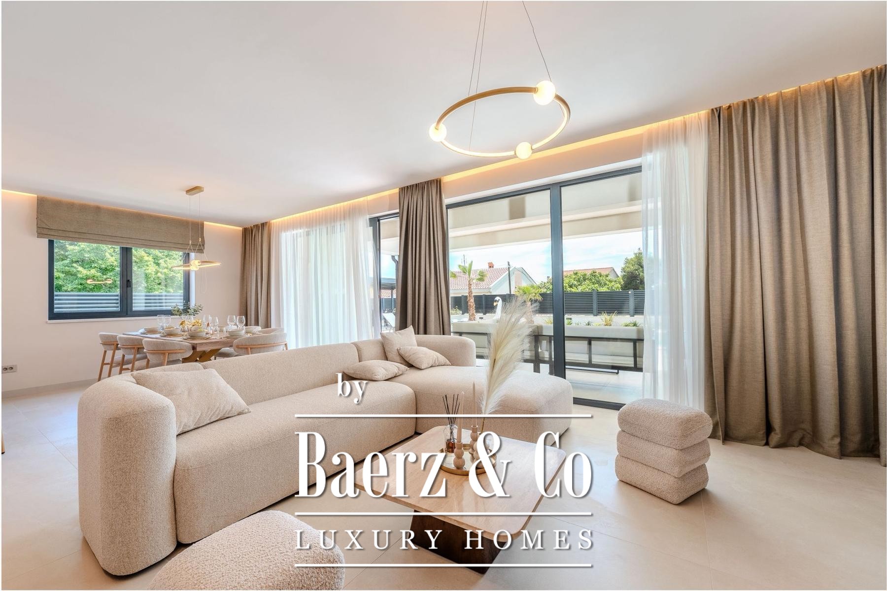 Covered and uncovered terraces extend the living spaces, combining Mediterranean sun with sheltered relaxation. The landscaped garden and sunbathing area convey privacy, while secure parking with video surveillance further enhances peace of mind. Mere steps from well-maintained beaches, this villa for sale in Privlaka aligns architectural elegance with Mediterranean leisure, equally suited for discreet family residence or luxury tourist rental. Each architectural detail reflects functionality and enduring quality, cultivating a setting of restraint, comfort, and light.