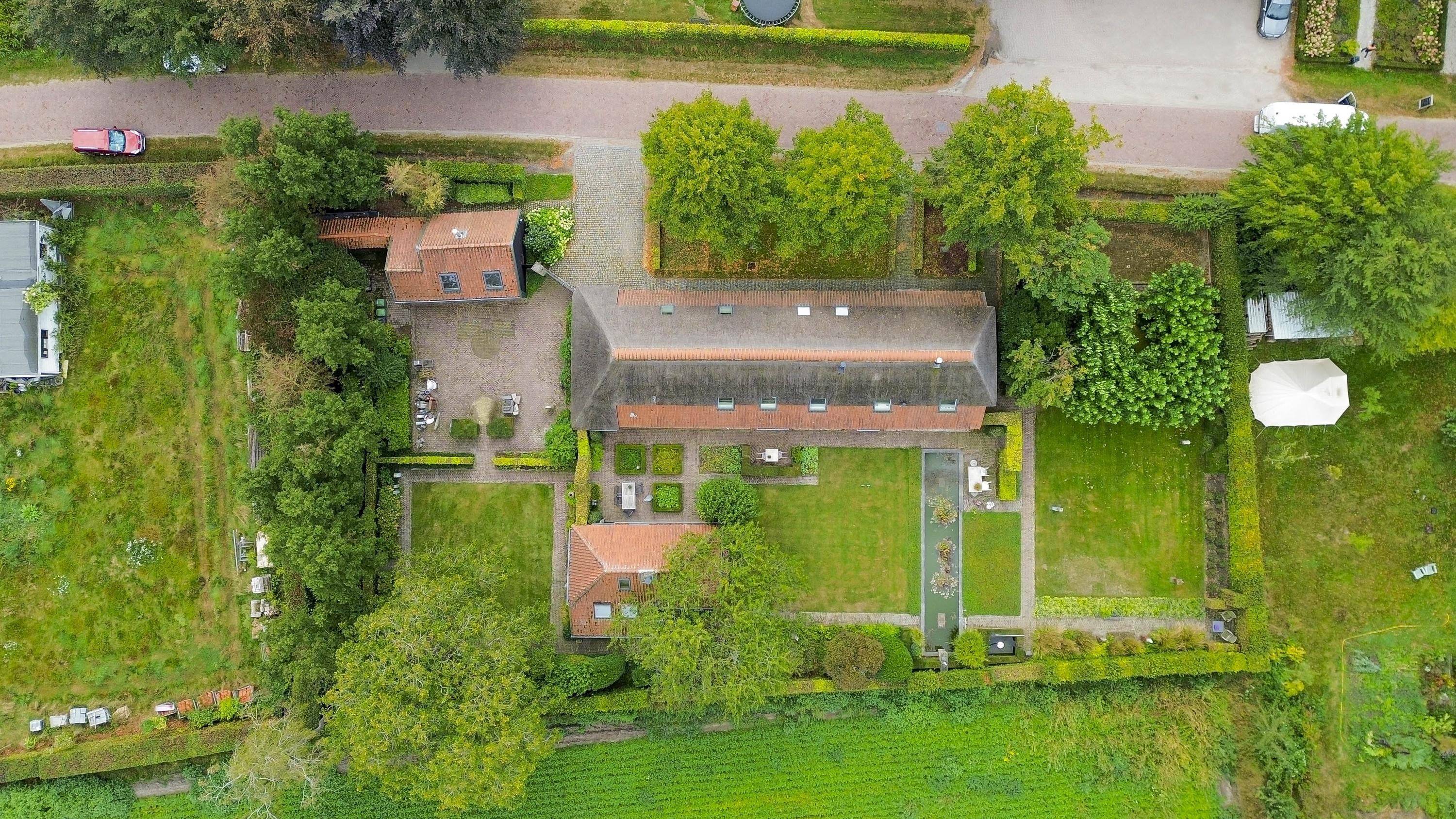 Behind the house and on the sides is a beautifully landscaped garden. On the left side is a nice, spacious area with a lawn, plant borders, old baked clinker paving, and various beech hedges. At the rear, you can enjoy a beautiful view, a large pond (with biological filter), a spacious lawn, plant borders, and mature vegetation. The garden is well laid out and well maintained. There is a double driveway on the right side of the property. The garden even offers the possibility of keeping small animals. There is also a section of the garden with a “lovers' lane.” To the left of the house is a landscaped jeu-de-boules court.