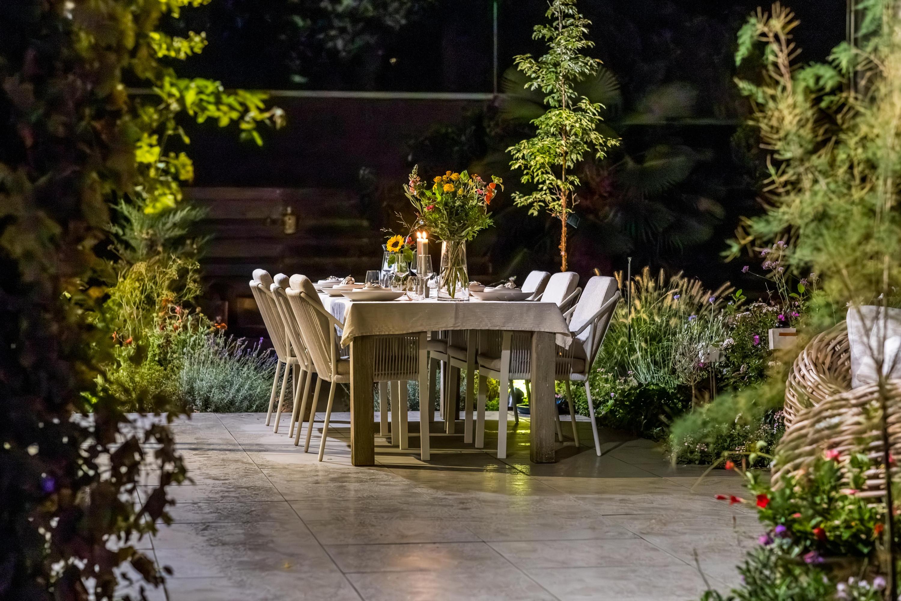 Spatial clarity is expressed through the garden-facing kitchen and living room, anchored by a sleek cooking island and fireplace, with sliding doors that open the space to sunlight and nature. Upstairs, the mezzanine connects four bedrooms, several with air conditioning and bespoke vanities, and a wood-burning fireplace in one suite.