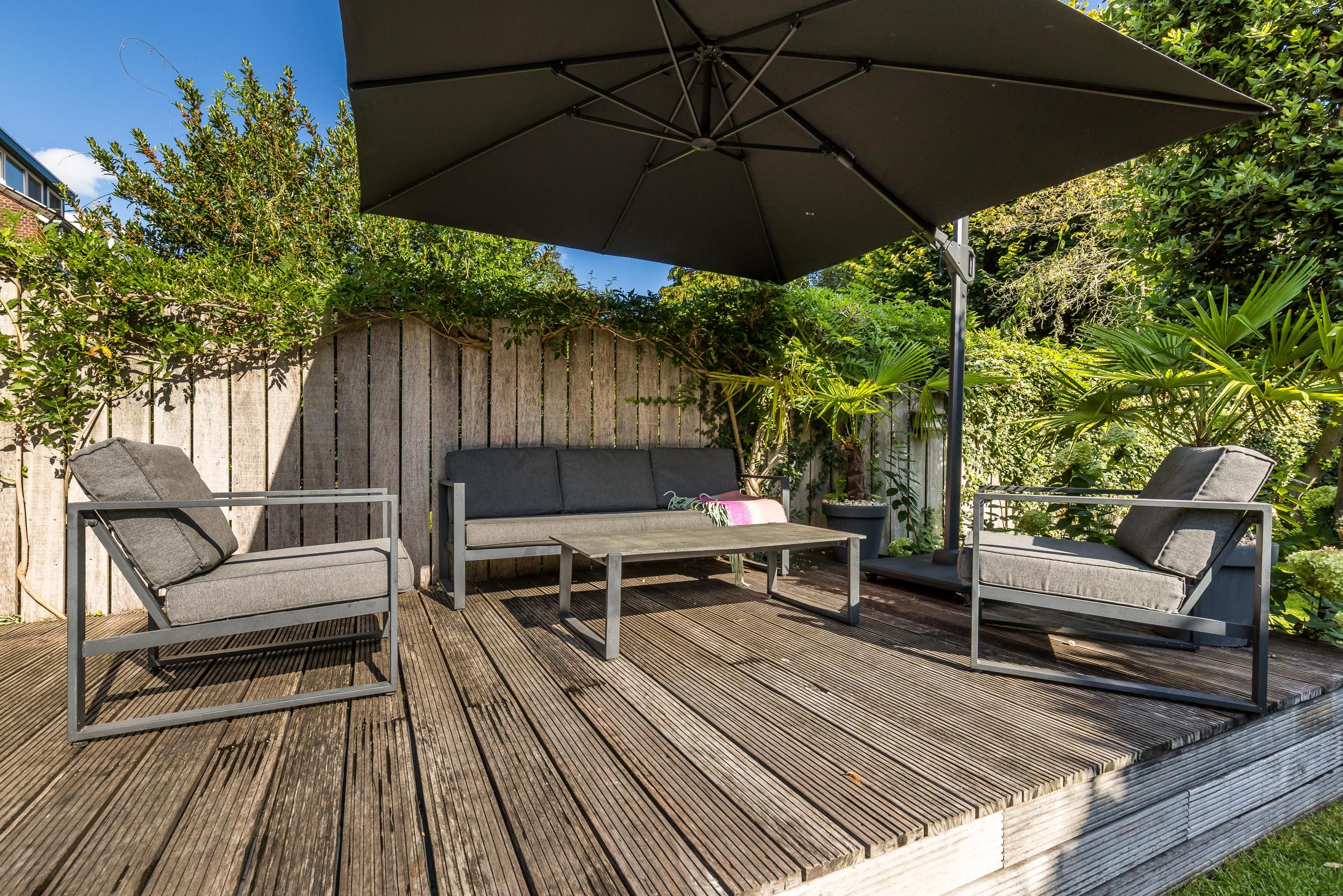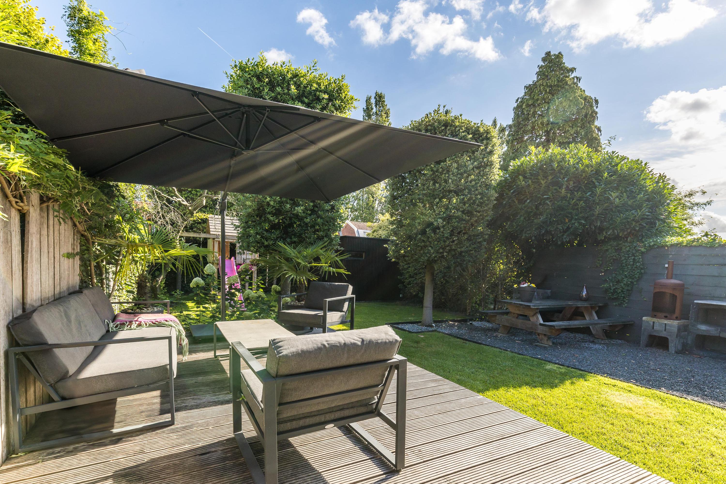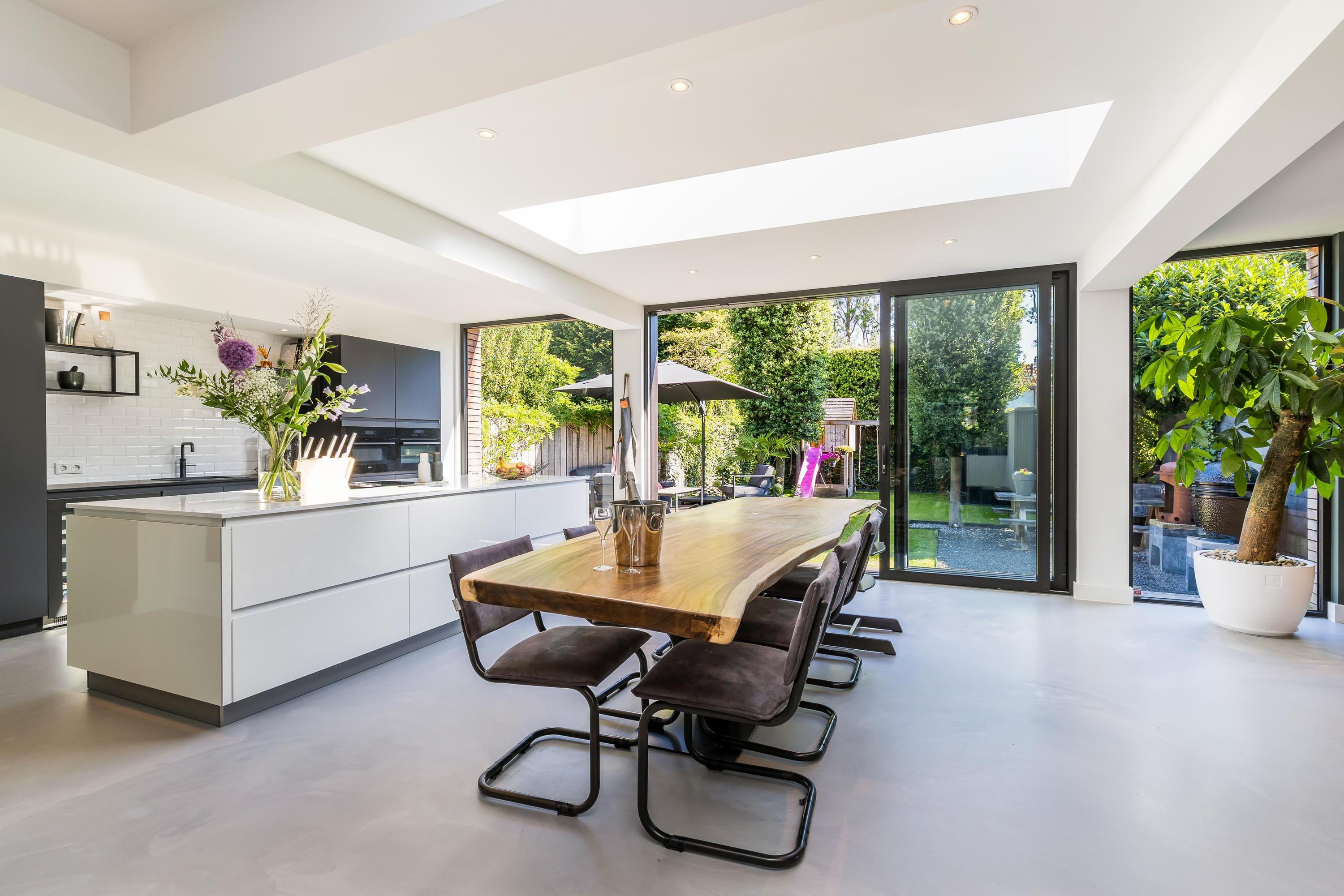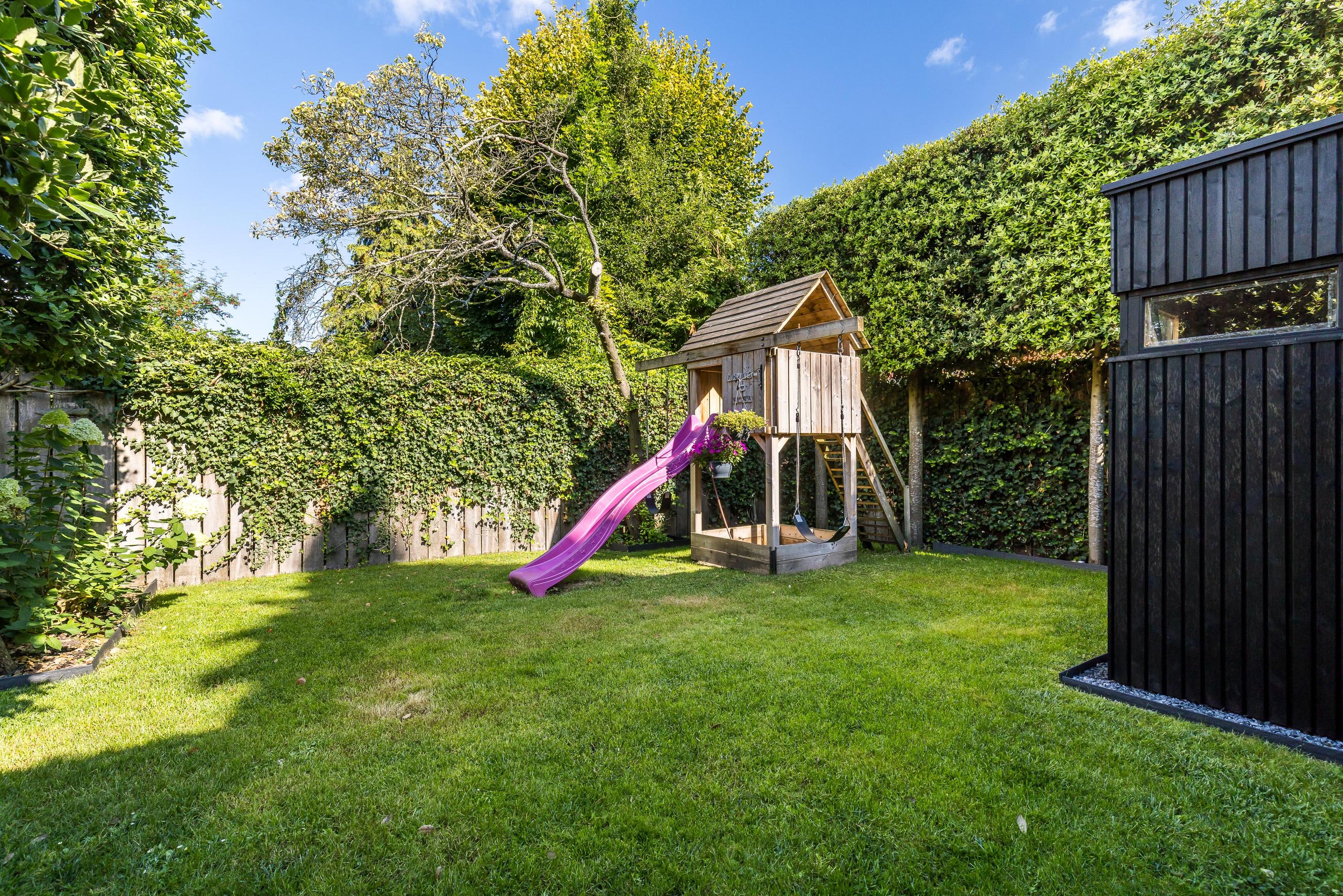 Light defines the interiors. A full-width glass façade with double sliding doors marries the large living space to a sunny, deep back garden, where privacy and child-friendly design coexist. The open kitchen is fitted with high-end appliances including a wine climate cabinet and connects easily to a practical utility room. Details such as double glazing, air conditioning, mechanical ventilation, fibre optic cable, alarm, and twelve solar panels installed in 2023 speak to modern comfort and energy consciousness.