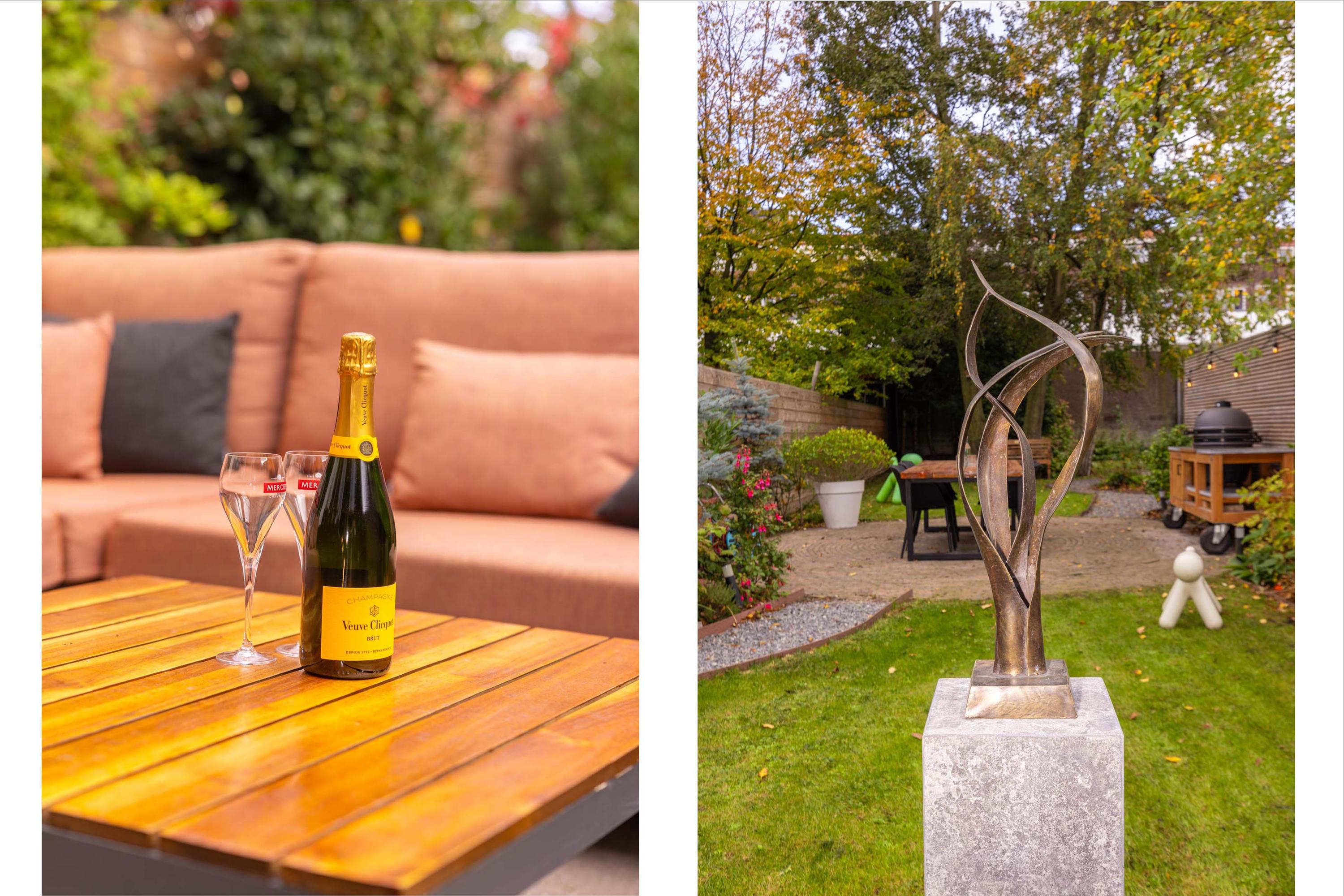 Representative entrance with high ceilings and original details. From the hallway, access to the modern guest toilet and the spacious living area with a beautiful oak floor. The open kitchen (renovated in 2022) forms the heart of the home and is equipped with a large cooking island, high-end built-in appliances including a steam oven and a (wine) climate cabinet. Adjacent is the bright conservatory with French doors opening onto the sunny rear garden, where indoor and outdoor living blend seamlessly.