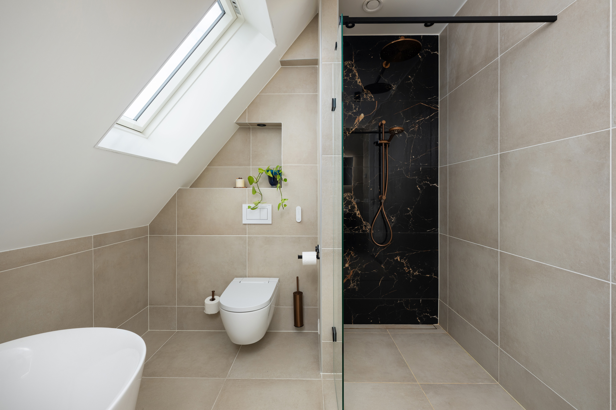 The home is sleekly finished and built with modern, sustainable technologies including a heat pump, solar panels, and underfloor heating/cooling.