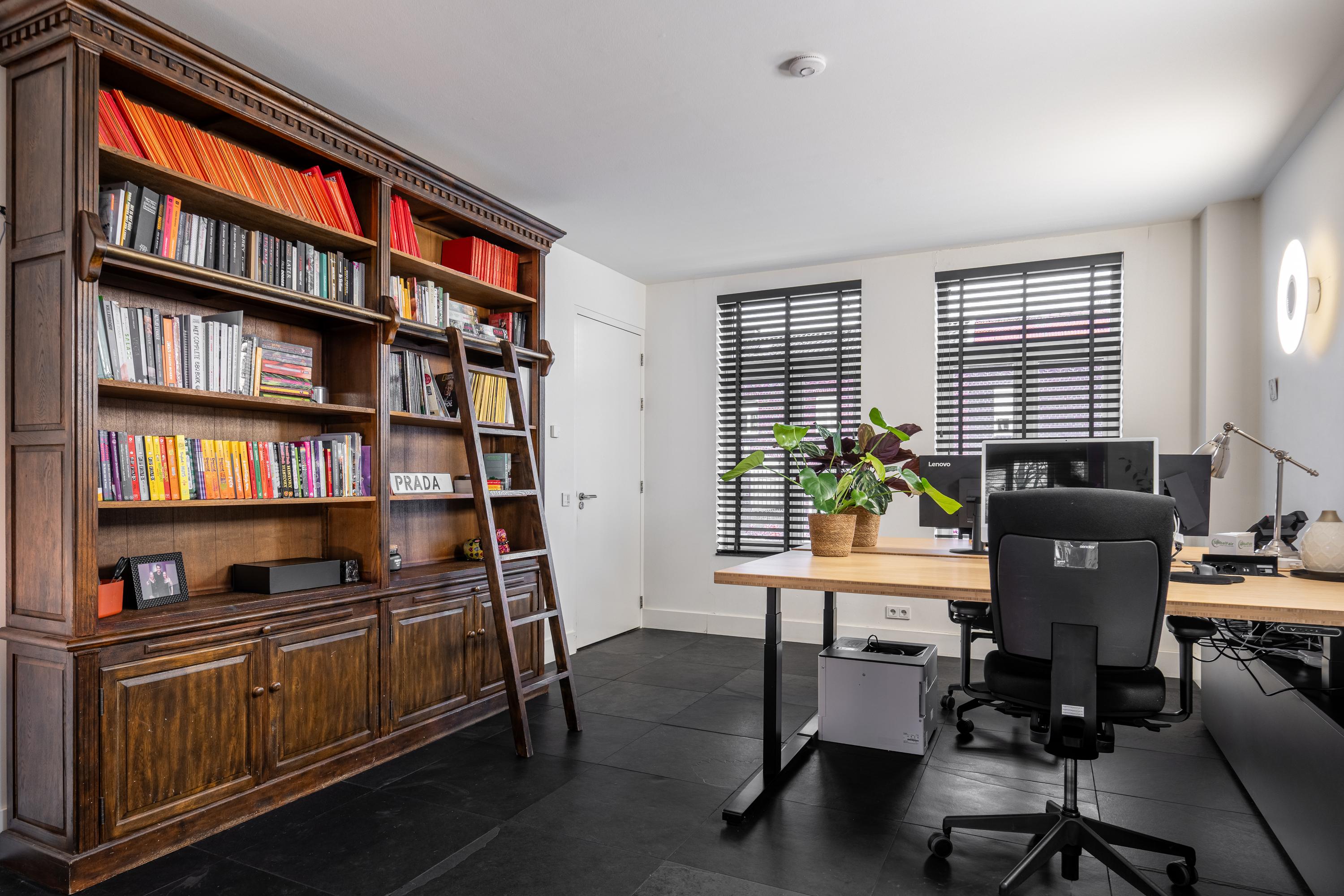 The impressive entrance/hallway offers plenty of space and access to the meter cupboard, toilet, cloakroom, utility room, and office space (approx. 21m²), which could potentially be added to the living room. A modern pivot door leads to the living area. The spacious living room with adjoining open kitchen (approx. 73m² in total) exudes atmosphere and luxury thanks to its cozy interior and optimal garden view. There is also a practical air conditioning system and an attractive decorative gas fireplace. The kitchen with spacious cupboards and island is equipped with various built-in appliances and provides access to the utility room (approx. 11m²) behind it, which has a complete second kitchen. Adjacent to the living area is a multifunctional room, currently used as a TV room/game room (approx. 15m²). From here, you can also access an extra room with a shower, toilet, and access to the garden and the room currently used as a practice room. For extra comfort, the ground floor has underfloor heating.