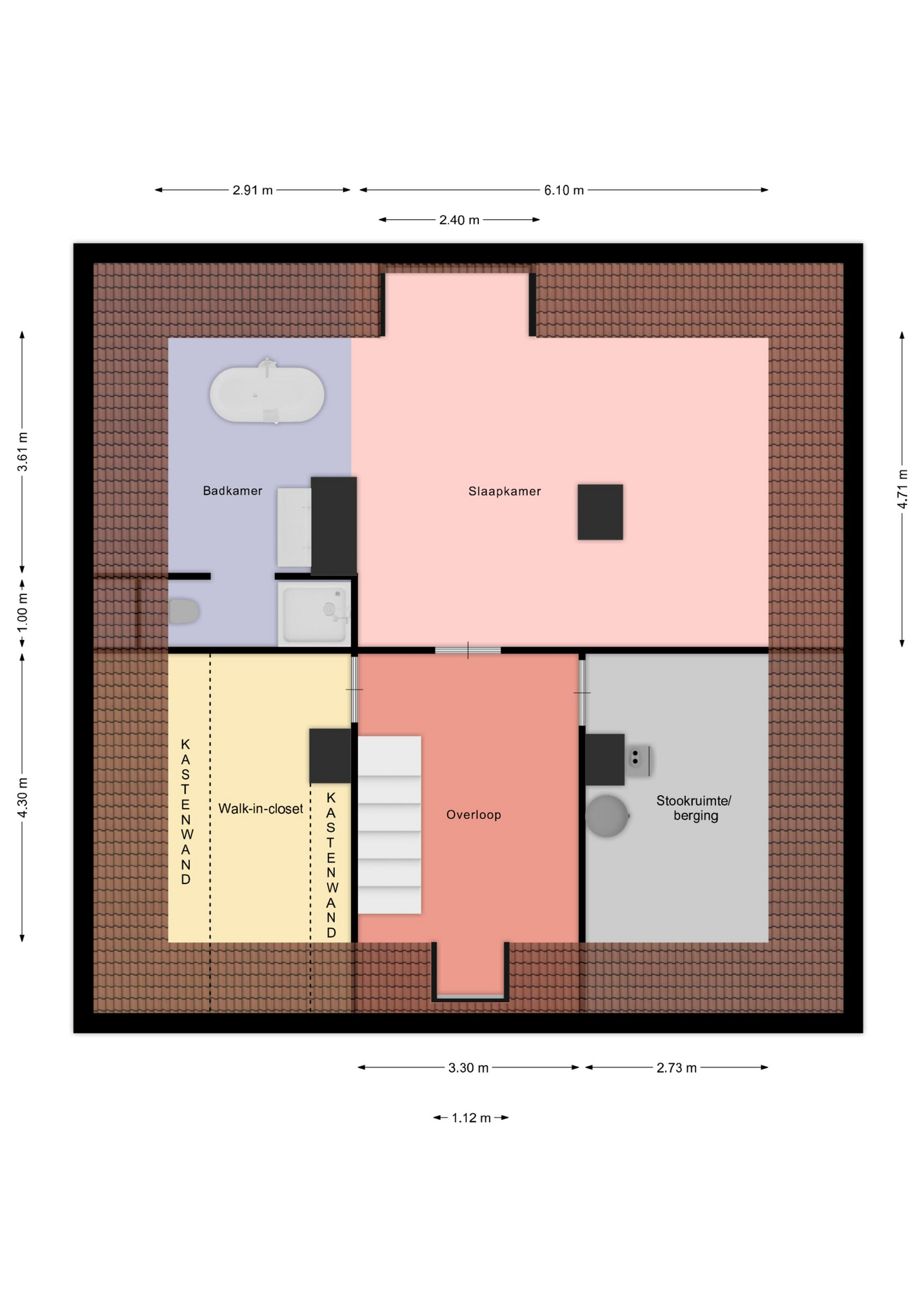 A fixed staircase leads to a landing with access to the walk-in closet, the boiler room, and the fourth bedroom with en-suite bathroom. The bedroom (approx. 29m²) has a practical dormer window and therefore offers a beautiful view of the garden. From the bedroom, there is open access to the third bathroom (13.5m²), which is equipped with a freestanding bathtub, double sink, walk-in shower, and toilet. The walk-in closet has custom-made cupboards on both sides.