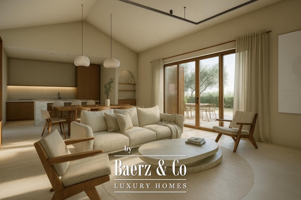 Inside, the villa offers three bedrooms and three understated bathrooms. A modern kitchen flows into the open-plan dining and living space, creating an atmosphere defined by clean lines, natural light, and spatial clarity. Beyond the living areas, a private gym and guest facilities speak to refined daily living. Carefully selected materials emphasize quality and restrained sophistication throughout.
