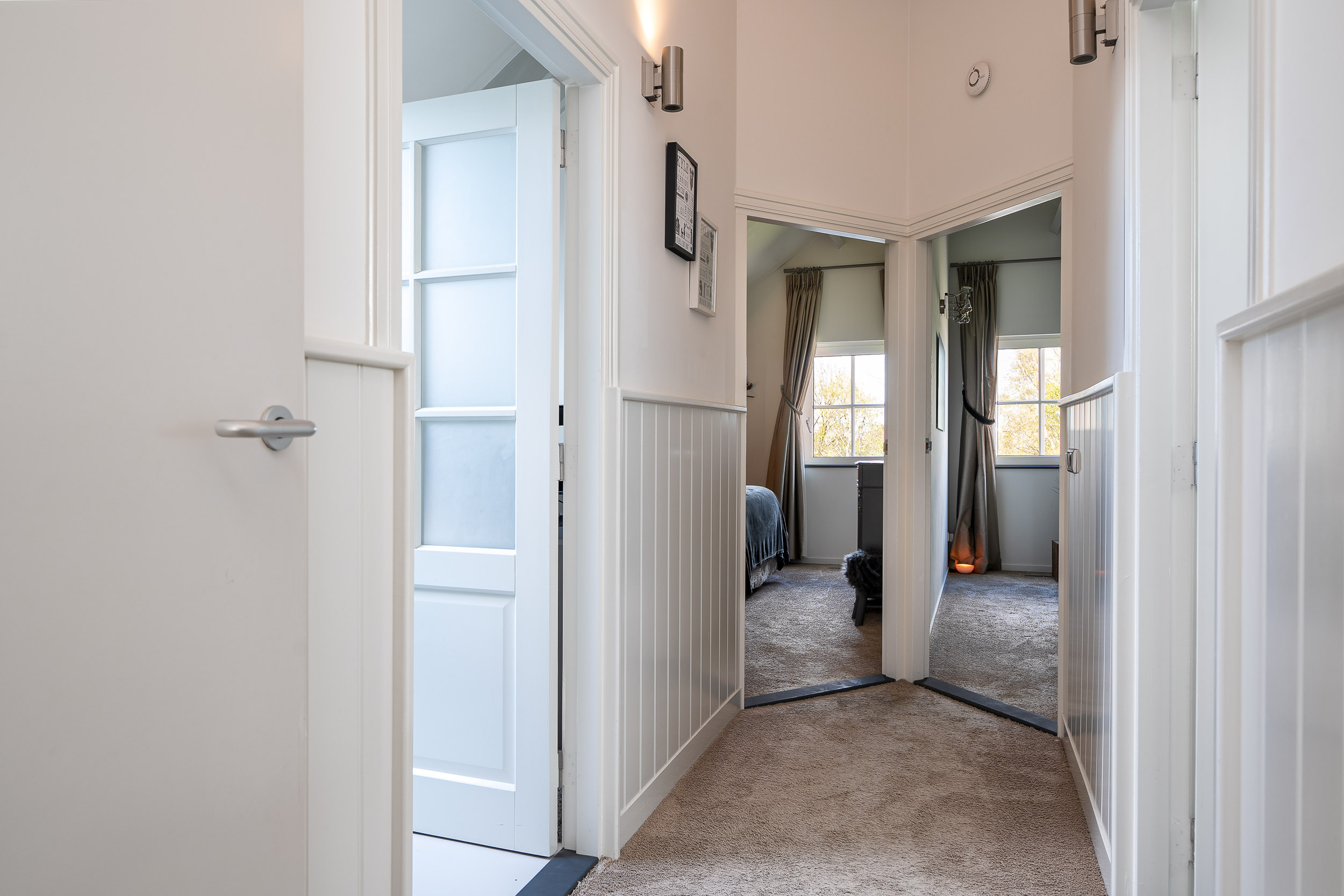 A door separates the landing from the bedrooms and bathroom. There are three generously sized bedrooms on this floor and a second spacious bathroom with underfloor heating, a double sink vanity, a walk-in shower, and a toilet. There is ample built-in storage in all rooms and along the sloped ceilings of the landing. Heating is provided through a warm air system.