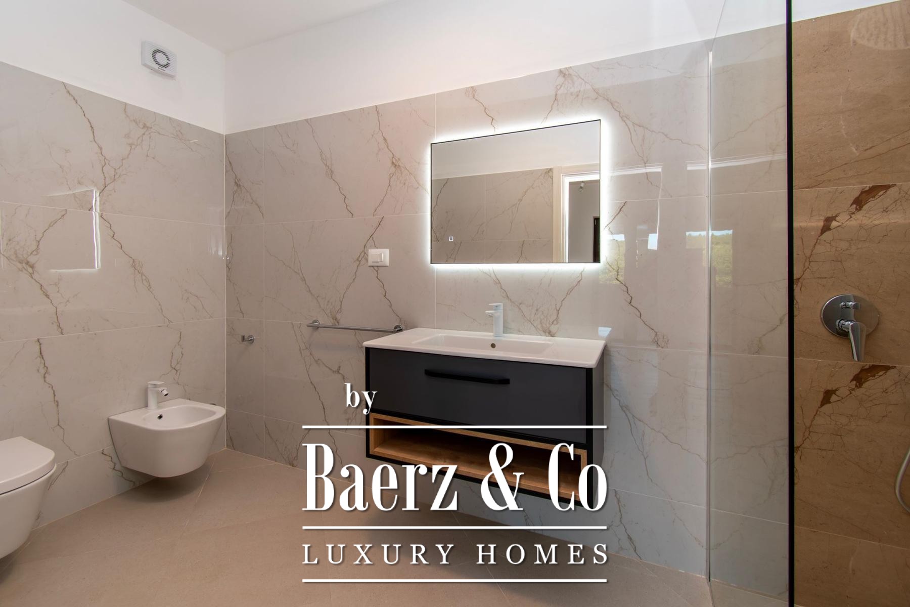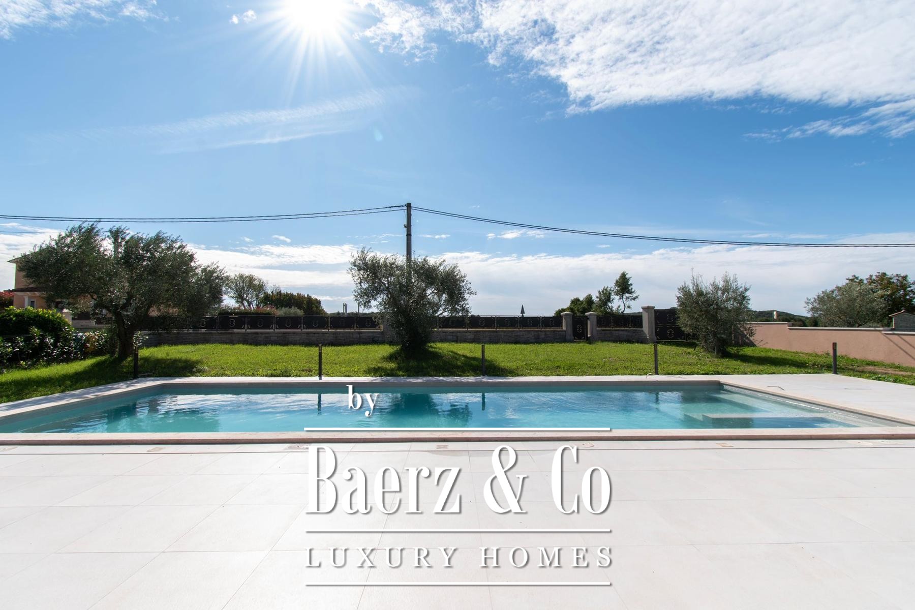 an oasis of peace.The quality of construction and equipment is at the highest level, with reinforced concrete construction and facade stone wool d=10 cm and a silicate finish, ensuring superior energy efficiency (certificate A). The ceiling height of 2.75 m gives a feeling of airiness, while high-quality joinery with triple glass in walnut color, plastered with bio-plaster of the interior and paint of the interior walls based on lime, create a healthy and pleasant environment. The floors are covered with ceramics from the Italian manufacturer NORDIK TILE and oak parquet of the 1st class.The villa is equipped with a fire protection system, DAIKIN heat pumps in all rooms with electronic regulation, and 11 air conditioners for optimal temperature throughout the year. Security is ensured by video surveillance, an intercom and an alarm system. The exterior impresses with five parking spaces (three covered), two entrances to the yard, and the facade of the house, terraces and stone-built (drywall) walls on an area of approximately 250-300 m2. Profiled stone erts on the windows, an outdoor shower, eight olive trees aged 60-70 years and external irrigation, round off this exclusive offer.If you want to own a quality, modern villa about 10 minutes from the first beaches in Vrsar or Poreč, feel free to contact us - we are at your disposal.