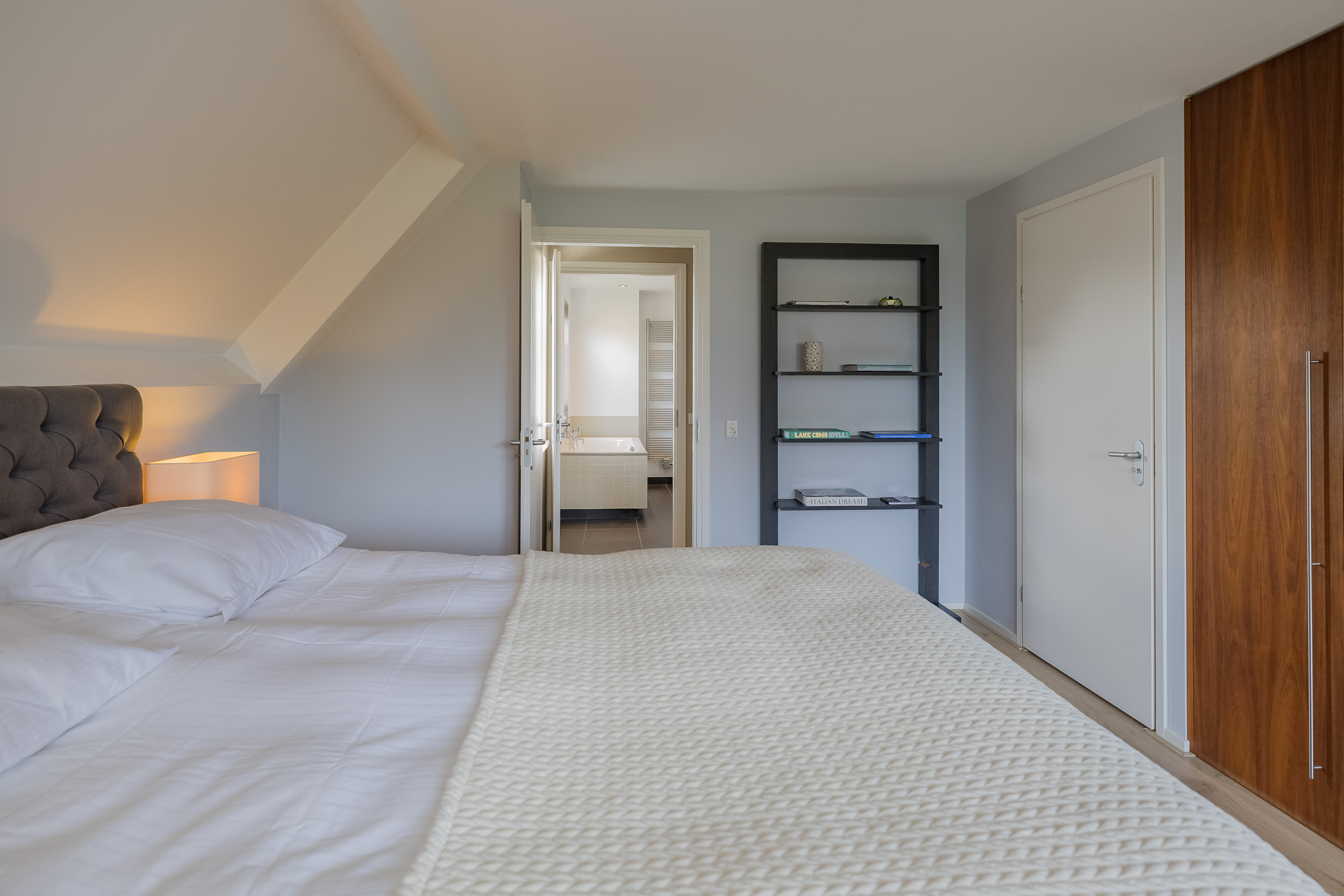 The bathroom is luxuriously appointed with a bathtub, walk-in shower, and double sink with vanity. There is a separate toilet on the landing.