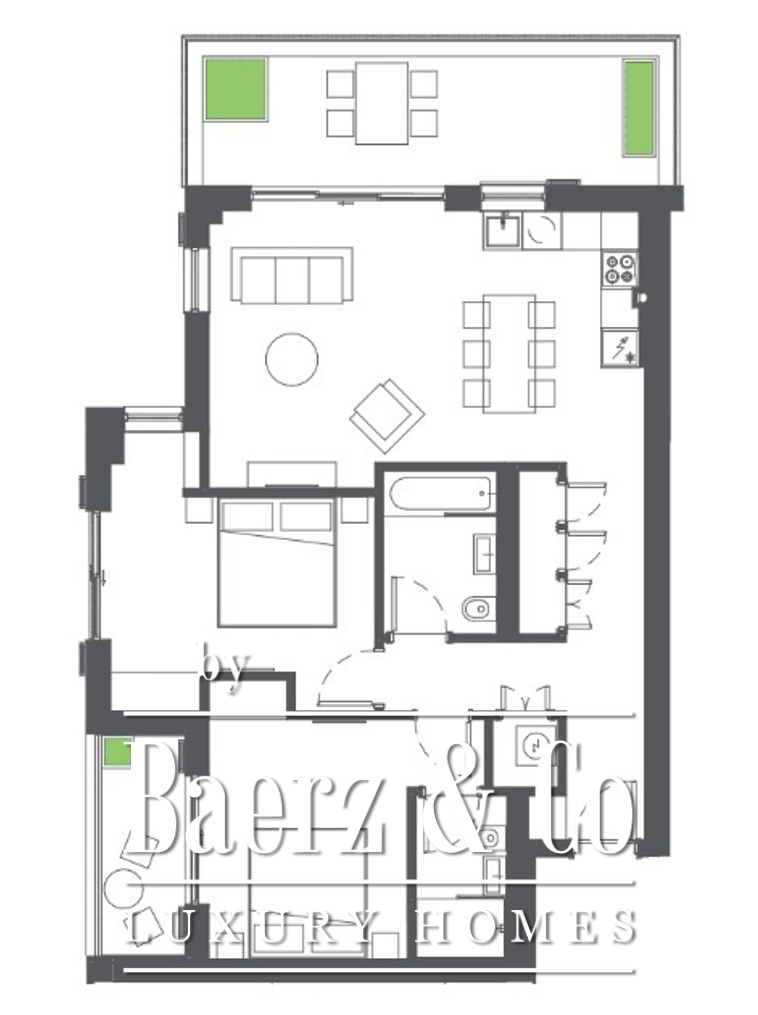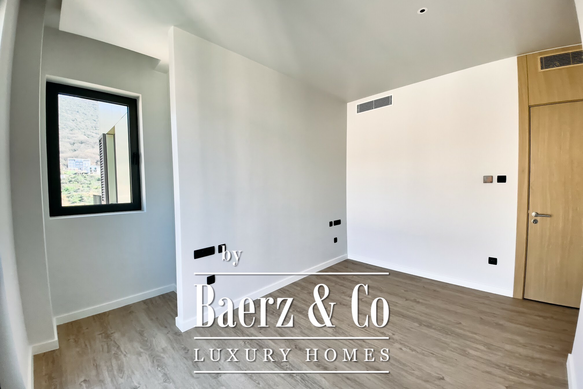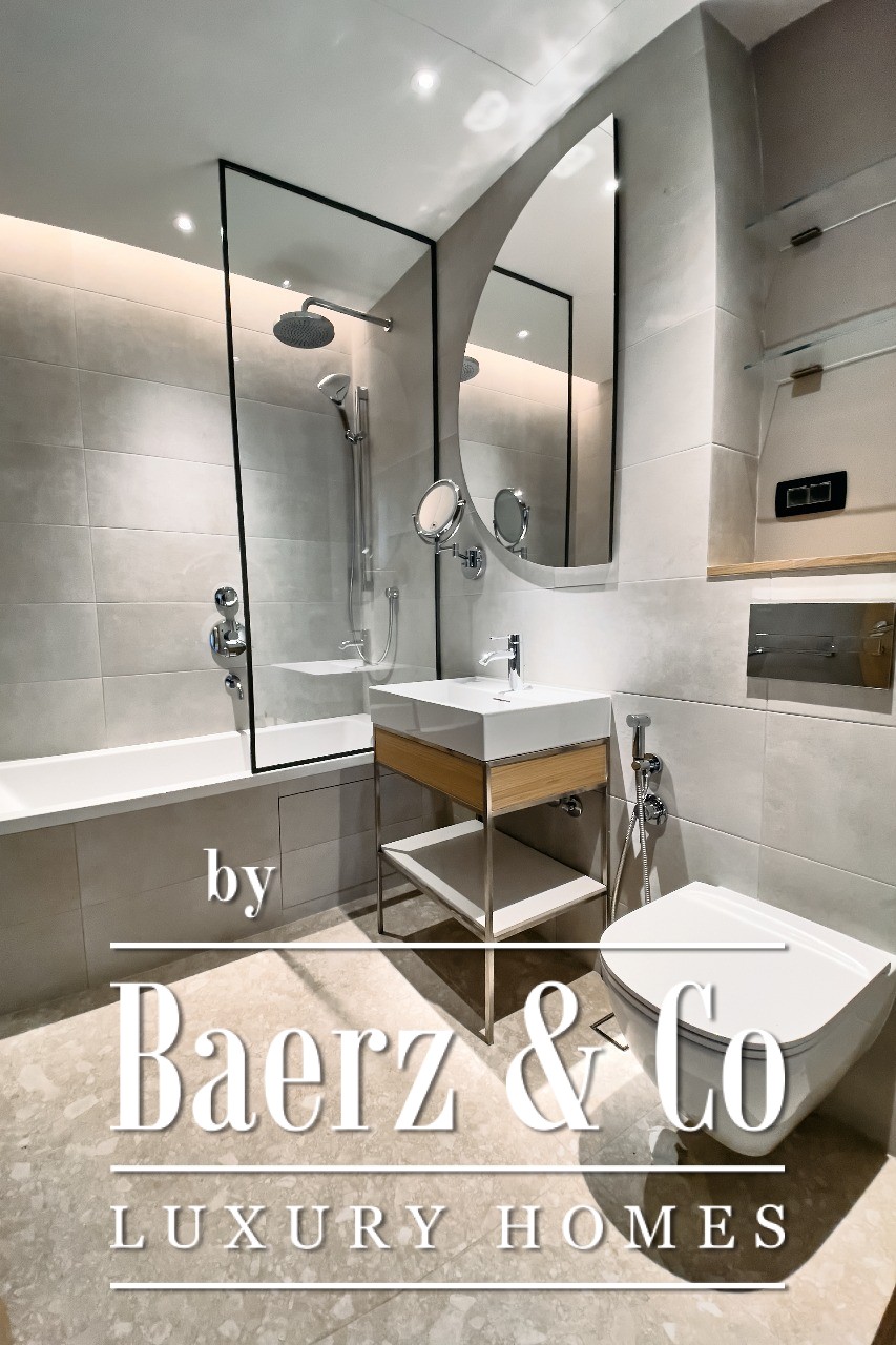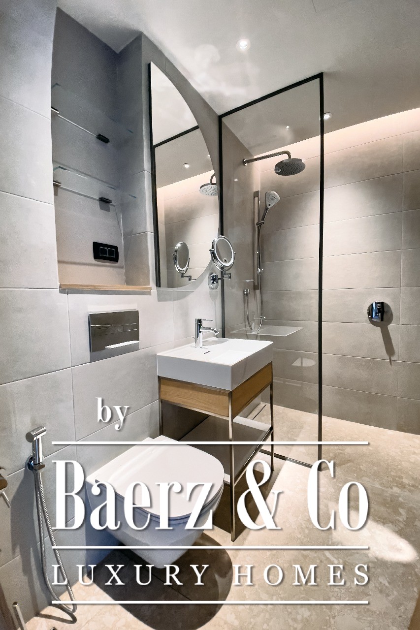 The interiors are finished with equipped kitchen and bathrooms, completed floors, tiles and air conditioning. The apartment is unfurnished, offering a flexible canvas for personal curation. Both long- and short-term rental potential is supported by its location and the architectural clarity.