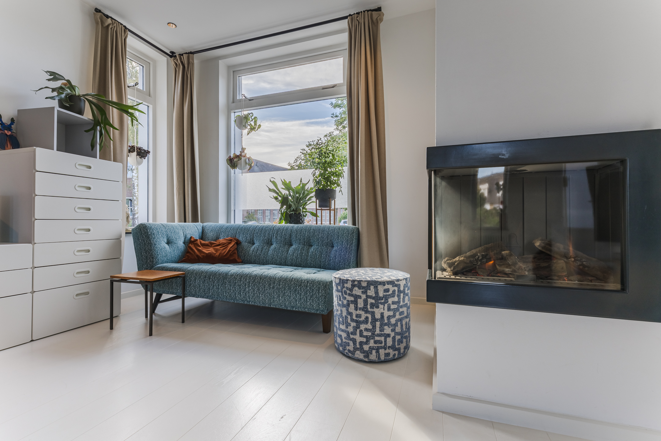 The spacious living area benefits from abundant natural light, underfloor heating, and a gas fireplace. The living room connects openly to the kitchen-diner but can be separated by elegant pivot doors. A practical cellar provides additional storage, and the unique raised room (opkamer) offers access to the first floor.