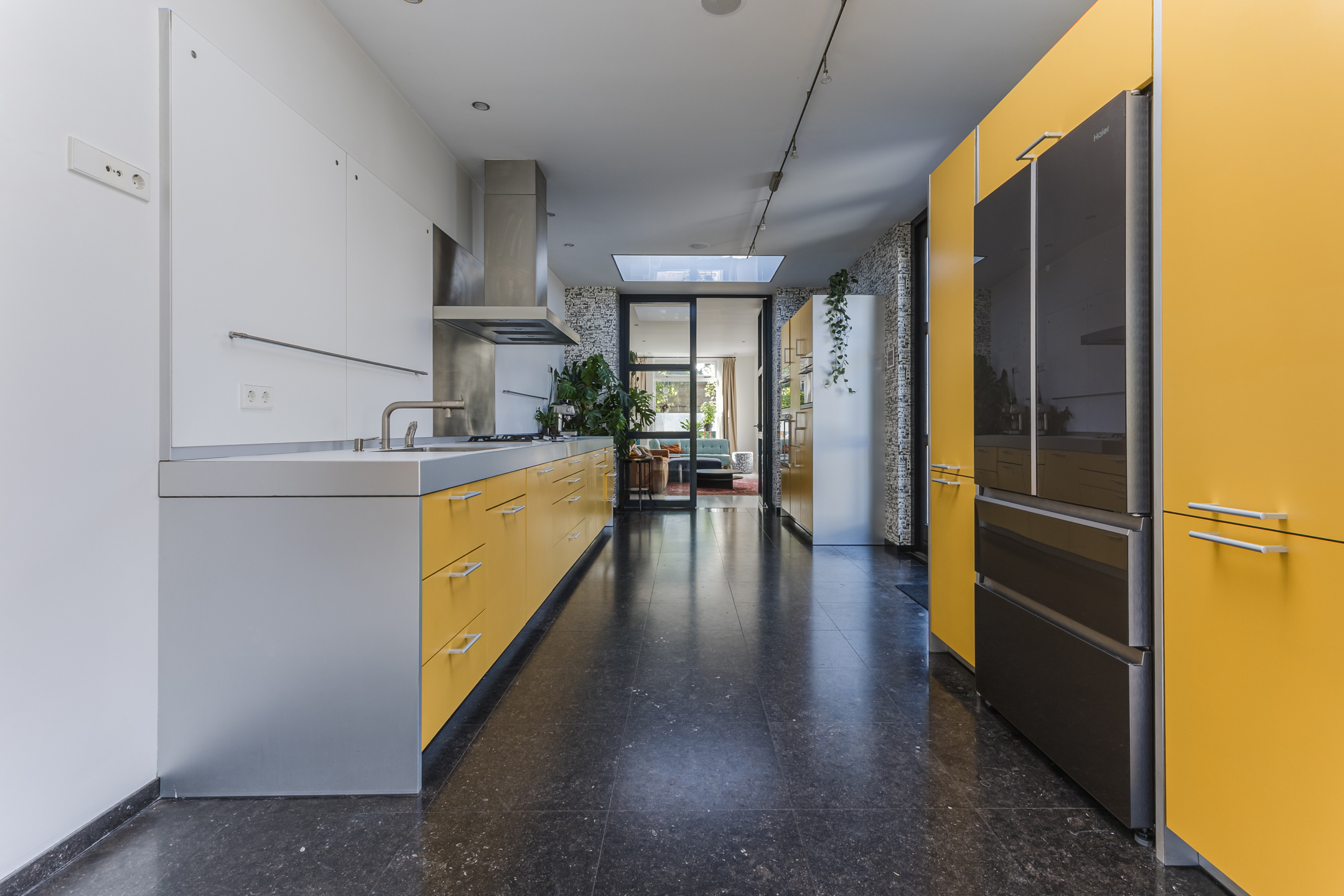 The modern, luxurious kitchen is both stylish and functional, offering generous space and beautiful views of the garden—perfect for relaxed dining. The kitchen is equipped with built-in appliances including a ceramic oven, combination oven-microwave, steam oven, American-style fridge (with water connection) and a Quooker tap. Provisions are also in place for a built-in coffee machine.