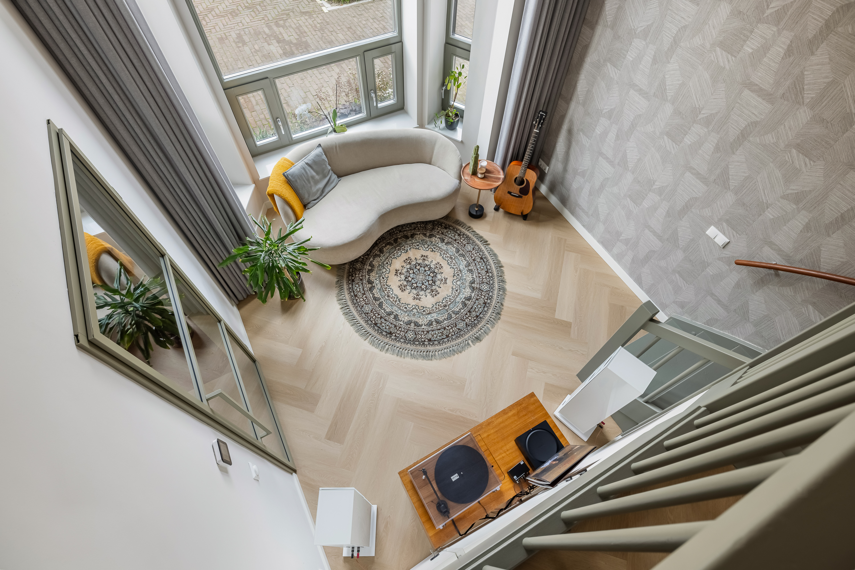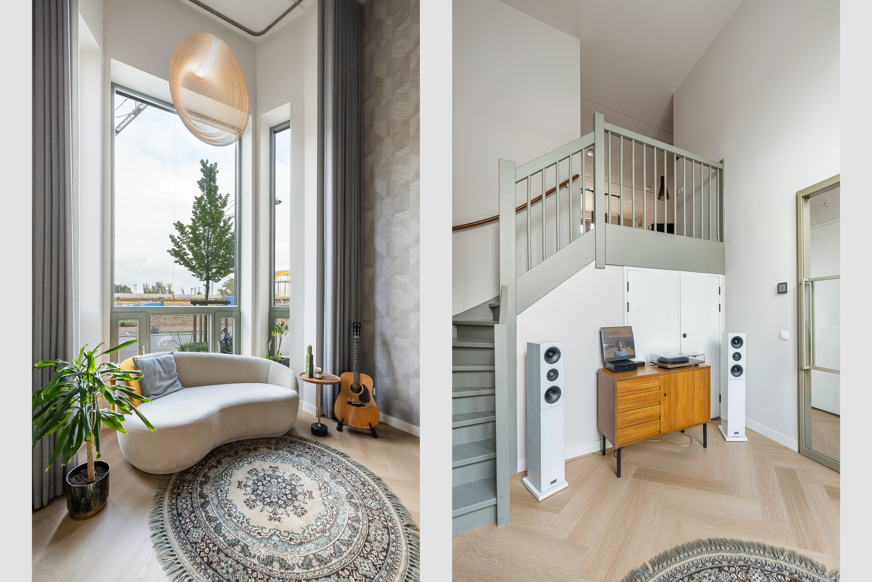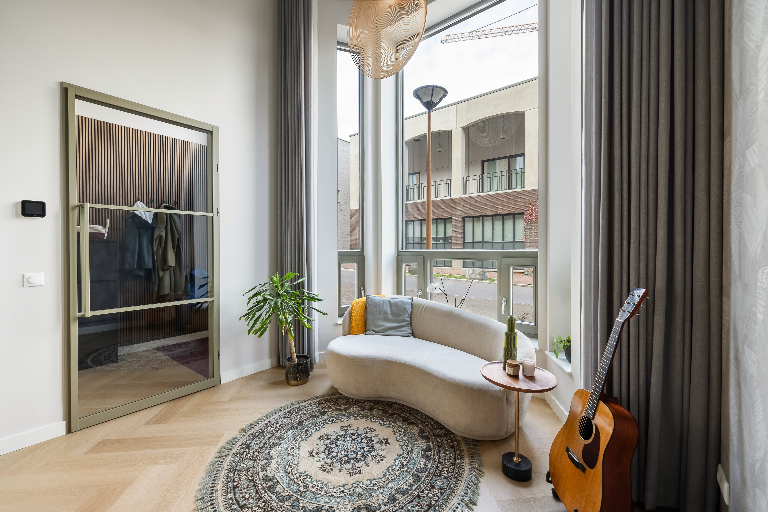 Zodra je binnenkomt, valt alles samen. De hoogte van de voorkamer is indrukwekkend. Met bijna vijf meter tot het plafond voelt deze ruimte groots, licht en vrij. De ramen lopen helemaal door tot boven en laten het daglicht op een bijna theatrale manier naar binnen vallen. Dit is zo’n ruimte die je niet hoeft in te richten, die vertelt zelf al een verhaal. Een plek waar je muziek maakt, yoga doet, werkt, speelt of gewoon even zit en naar de lucht kijkt terwijl de kleuren van de dag veranderen.