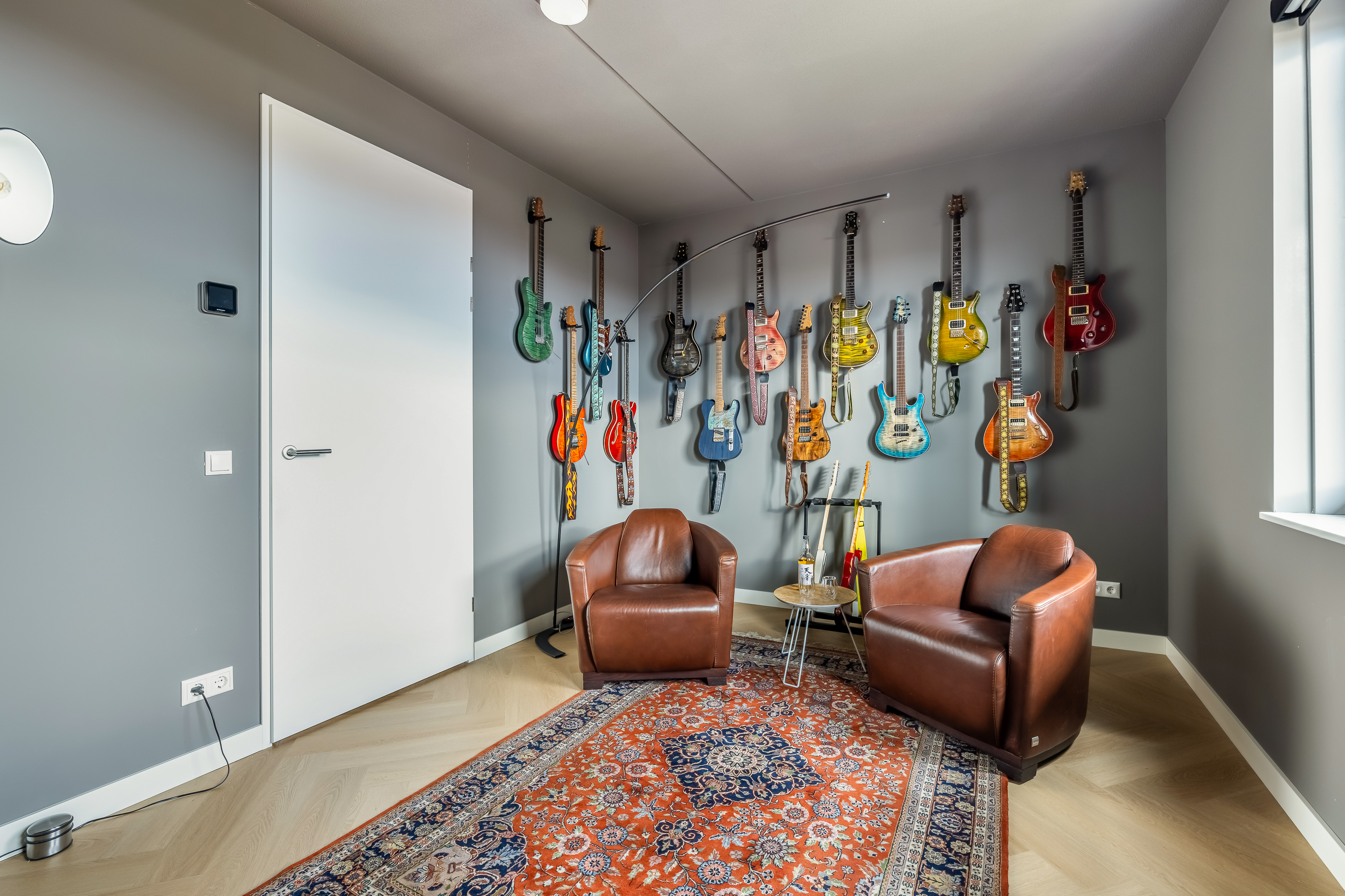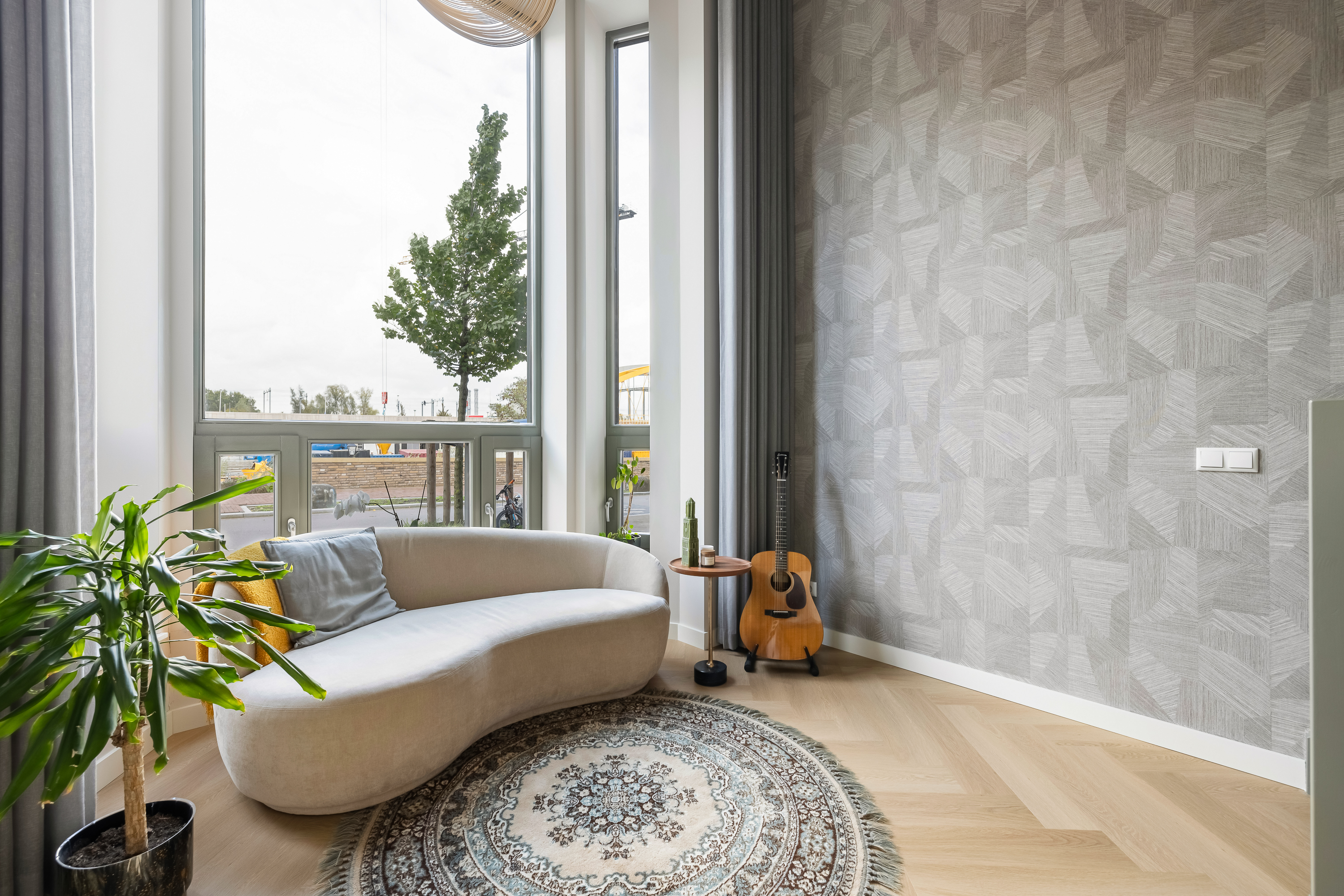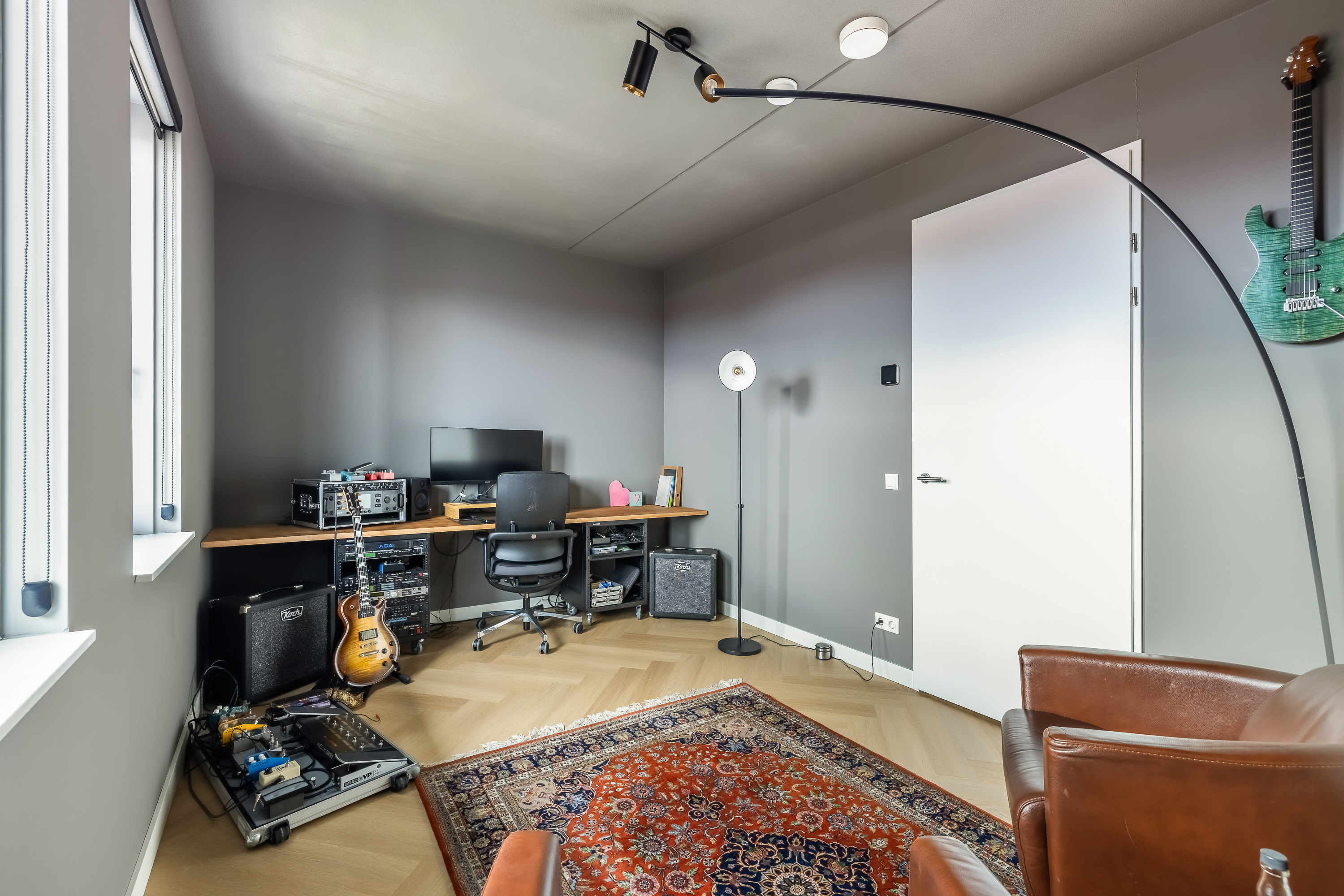 Zodra je binnenkomt, valt alles samen. De hoogte van de voorkamer is indrukwekkend. Met bijna vijf meter tot het plafond voelt deze ruimte groots, licht en vrij. De ramen lopen helemaal door tot boven en laten het daglicht op een bijna theatrale manier naar binnen vallen. Dit is zo’n ruimte die je niet hoeft in te richten, die vertelt zelf al een verhaal. Een plek waar je muziek maakt, yoga doet, werkt, speelt of gewoon even zit en naar de lucht kijkt terwijl de kleuren van de dag veranderen.