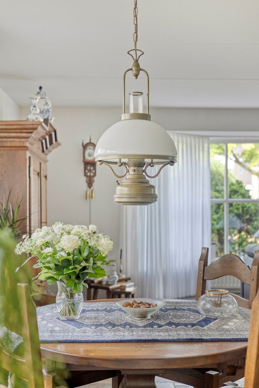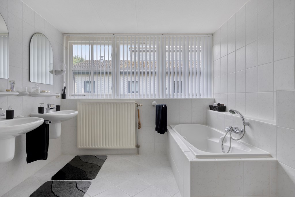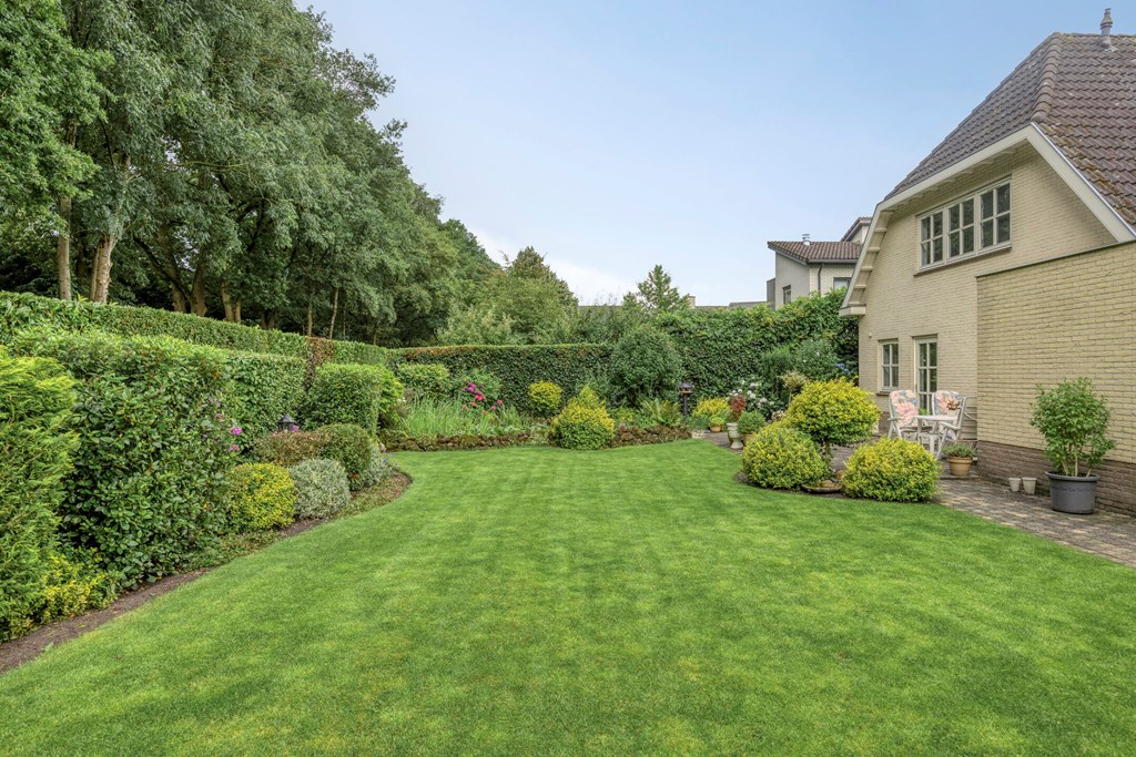 The garden all around is immaculately maintained. At the front, the wide driveway offers parking for multiple cars; under the carport your car is sheltered. From here you also have direct access to the garage, with overhead door and side door—a particularly spacious and multifunctional area of no less than 57 m². Ideal for daily use, safely storing bicycles, carrying out DIY projects, or setting up a large work or hobby room with its own entrance. The rear garden is a delight: a large sun terrace with decorative paving, manicured lawn, a pond, and borders full of color and variety. Thanks to mature hedges, trees, and the woodland to the rear, you’ll enjoy peace and privacy. Whether you want to have breakfast outdoors, read under the tree, or host guests on a summer evening—you can do it all here. With direct access from the living room, utility room, and garage, the garden is also extremely practical in layout.