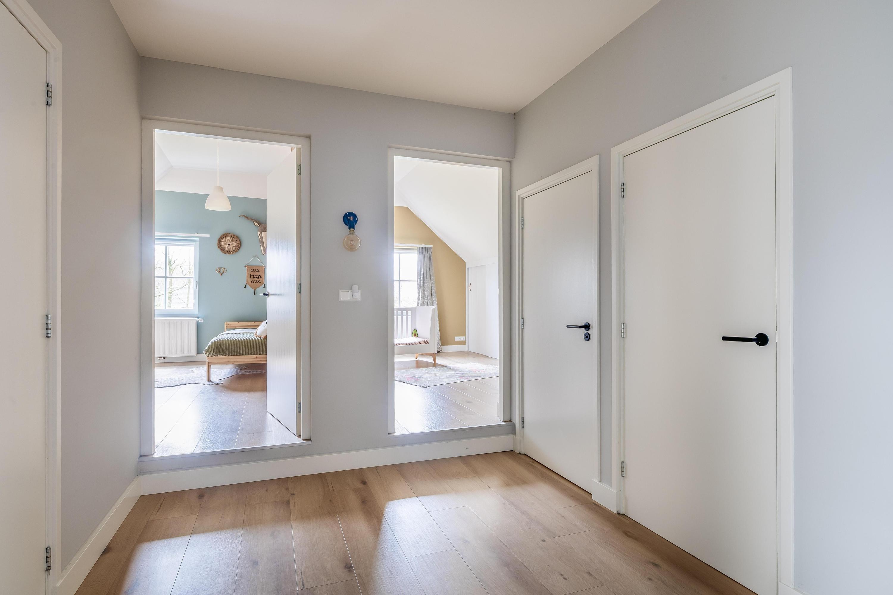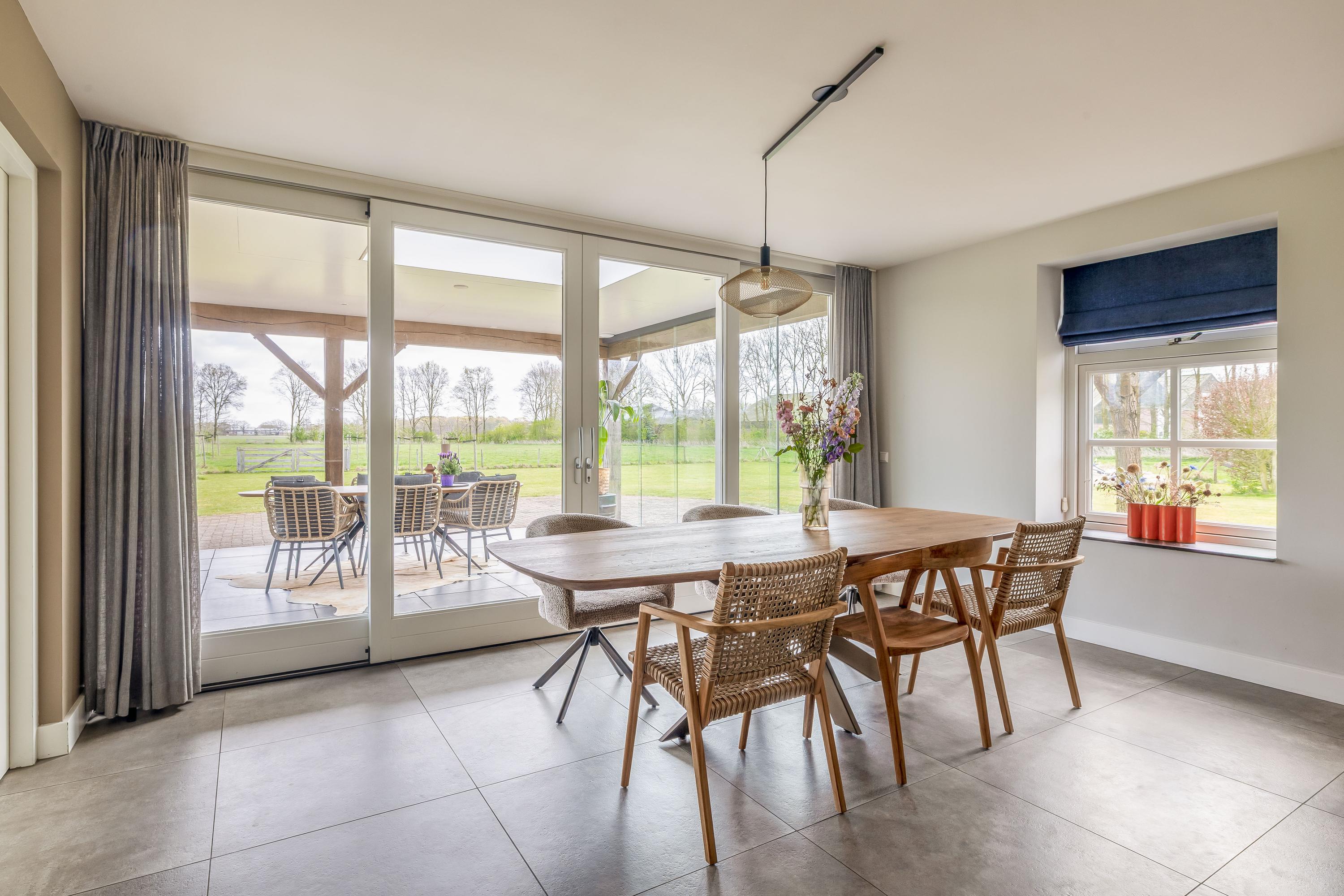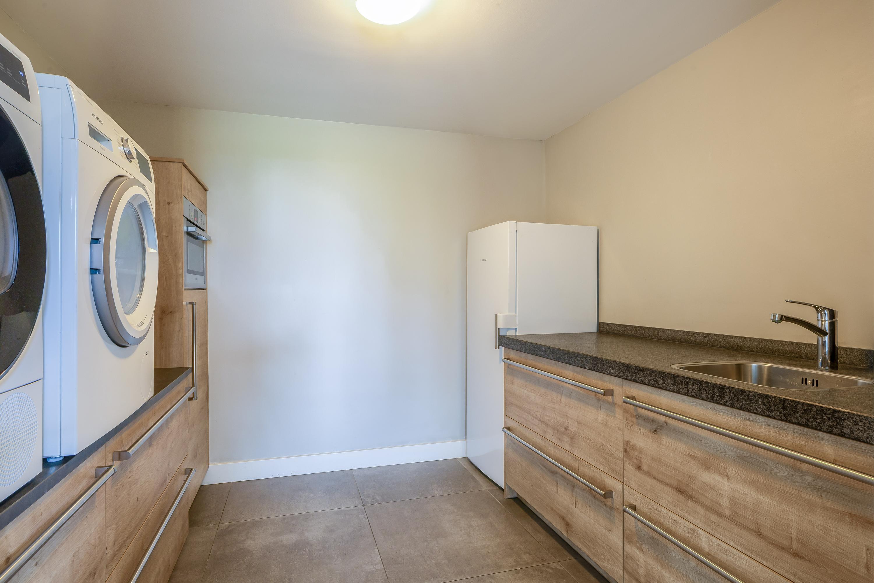 The cosy living room, with its warm wooden parquet flooring and stucco walls, is a delightful space with plenty of natural light. The living room is directly connected to the kitchen-diner. The kitchen-diner is fitted with a cooking island and wall units and features all necessary appliances, including a Quooker, dishwasher, induction hob, oven and fridge. The modern tiled floor with underfloor heating and the sliding doors providing access to the covered terrace make this kitchen a pleasant and practical living space with views of the surrounding landscape. The utility room, toilet and storage room are accessible via the corridor. The utility room is practically laid out with washing appliances at a convenient height, storage space and additional facilities such as a fridge and combi-oven. The toilet is fitted with a wall-hung toilet and washbasin. The storage room has connections for installing a bathroom, making it easy to create a lifetime-proof layout.