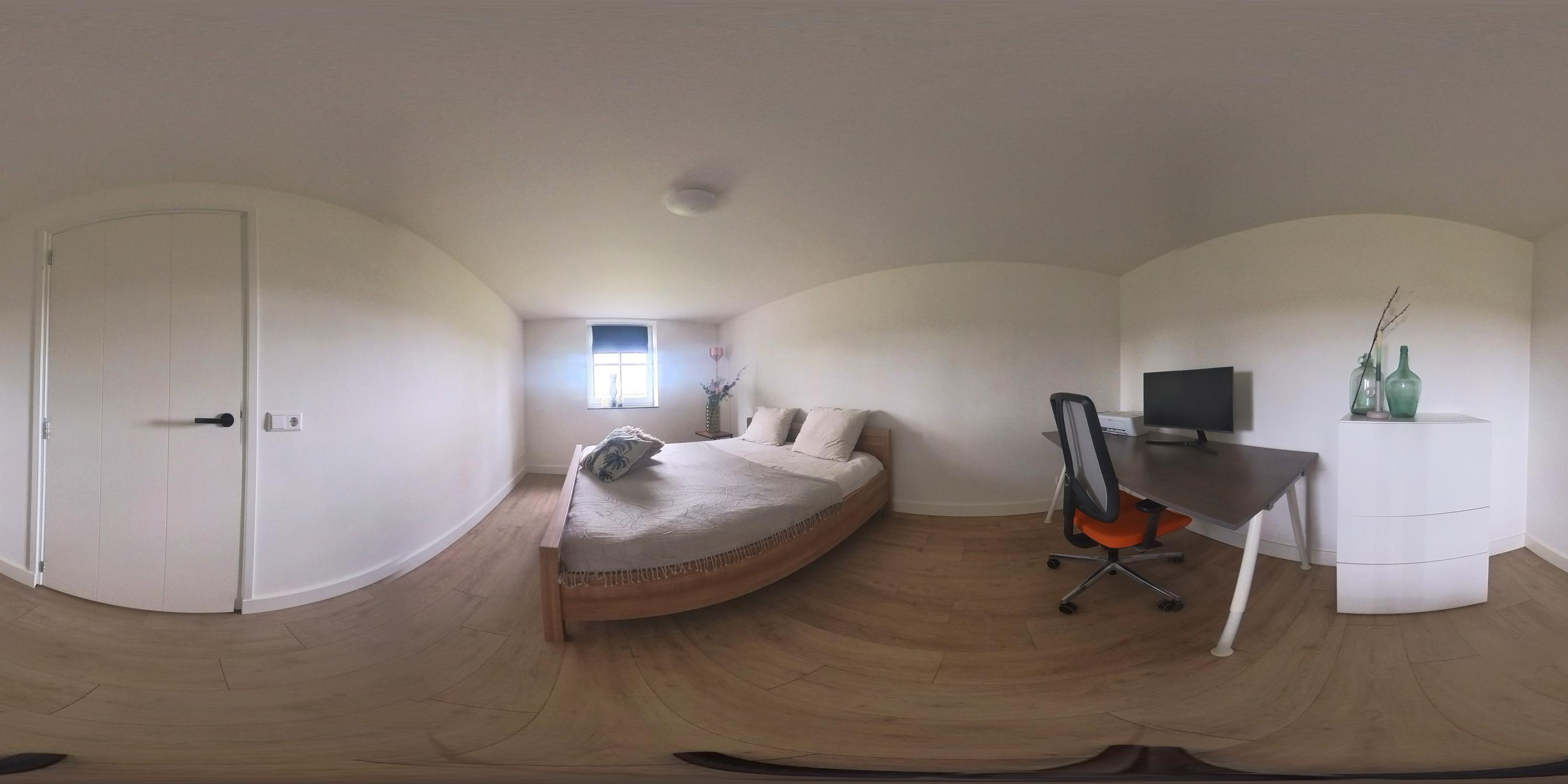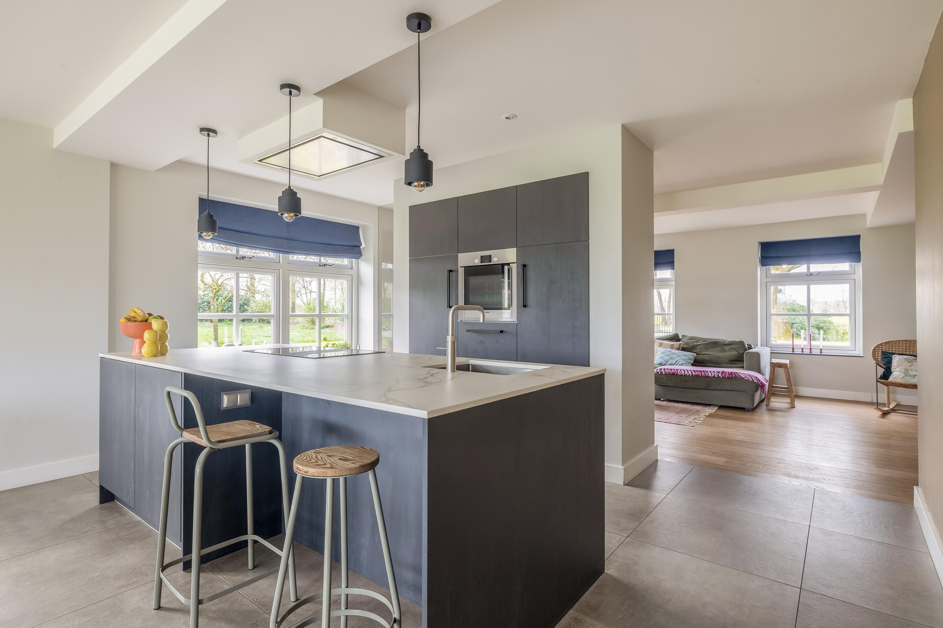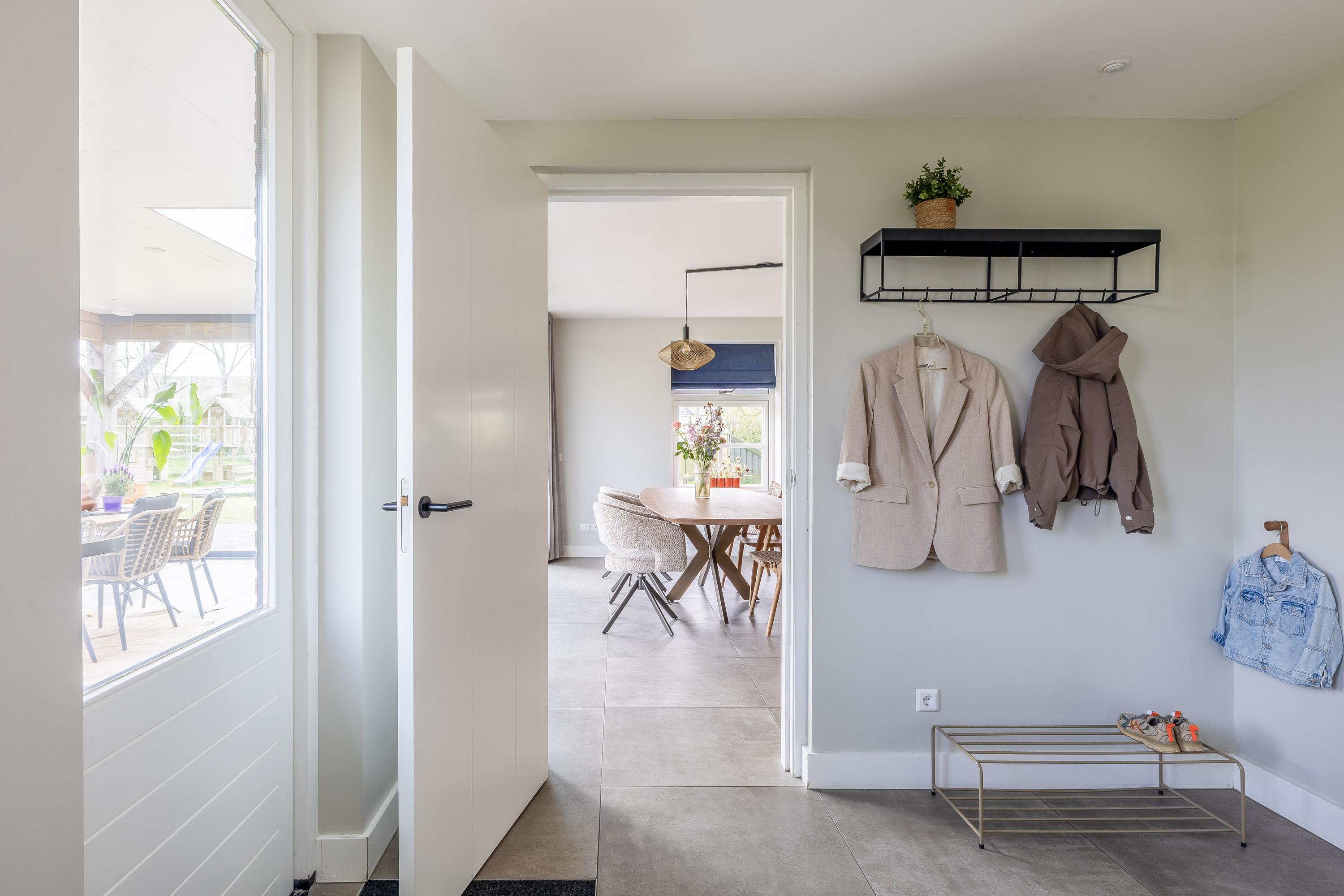 The cosy living room, with its warm wooden parquet flooring and stucco walls, is a delightful space with plenty of natural light. The living room is directly connected to the kitchen-diner. The kitchen-diner is fitted with a cooking island and wall units and features all necessary appliances, including a Quooker, dishwasher, induction hob, oven and fridge. The modern tiled floor with underfloor heating and the sliding doors providing access to the covered terrace make this kitchen a pleasant and practical living space with views of the surrounding landscape. The utility room, toilet and storage room are accessible via the corridor. The utility room is practically laid out with washing appliances at a convenient height, storage space and additional facilities such as a fridge and combi-oven. The toilet is fitted with a wall-hung toilet and washbasin. The storage room has connections for installing a bathroom, making it easy to create a lifetime-proof layout.