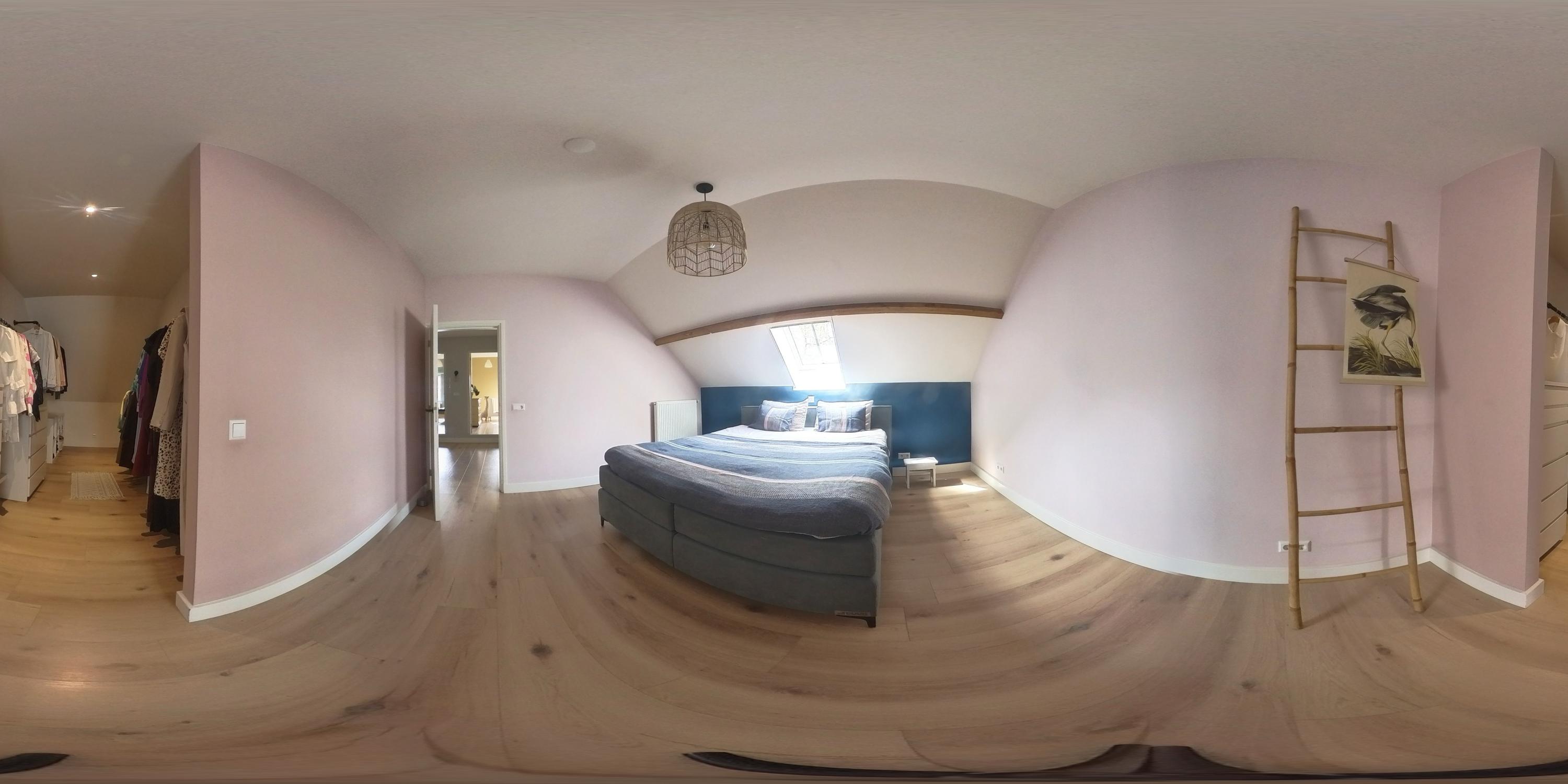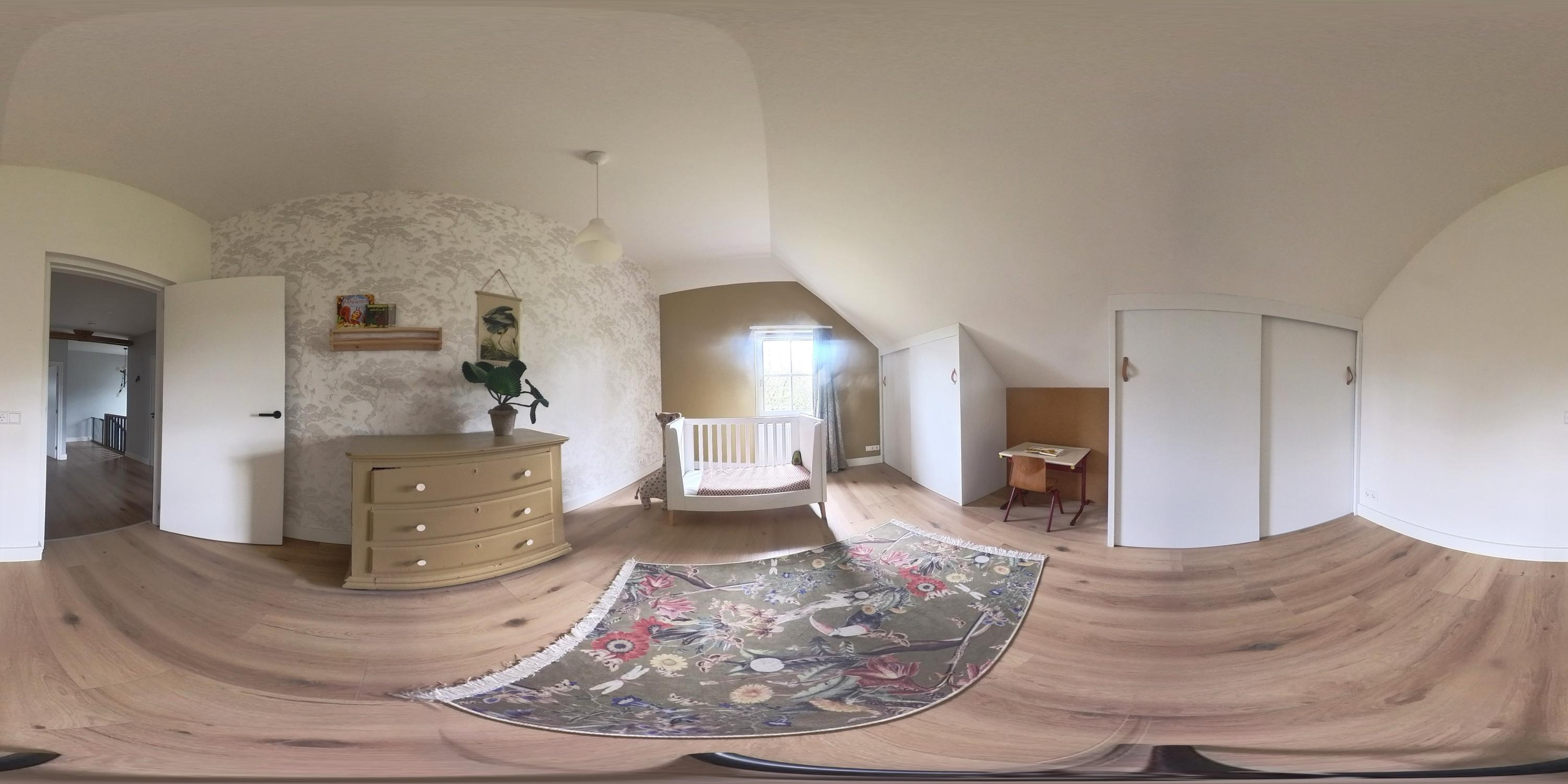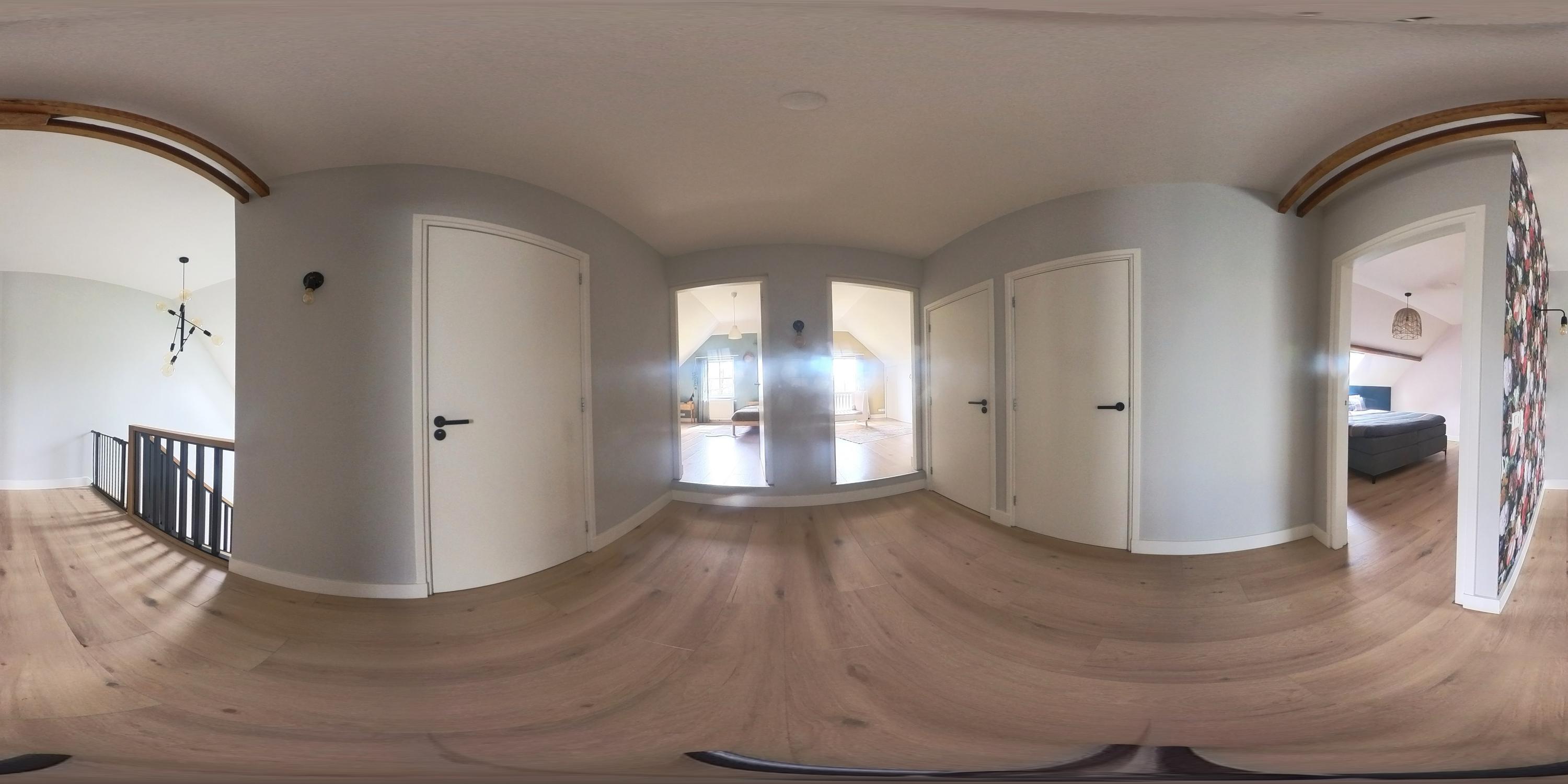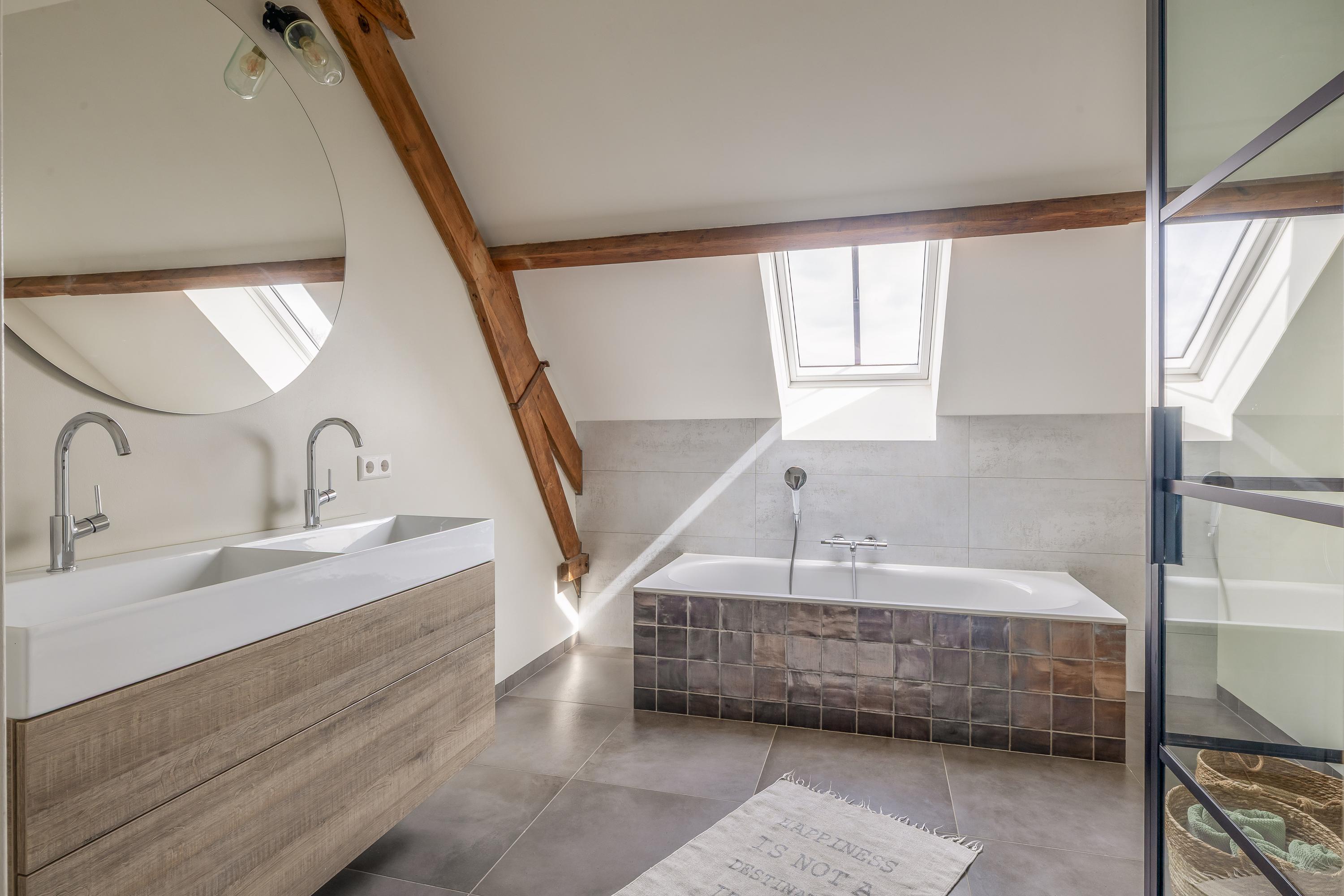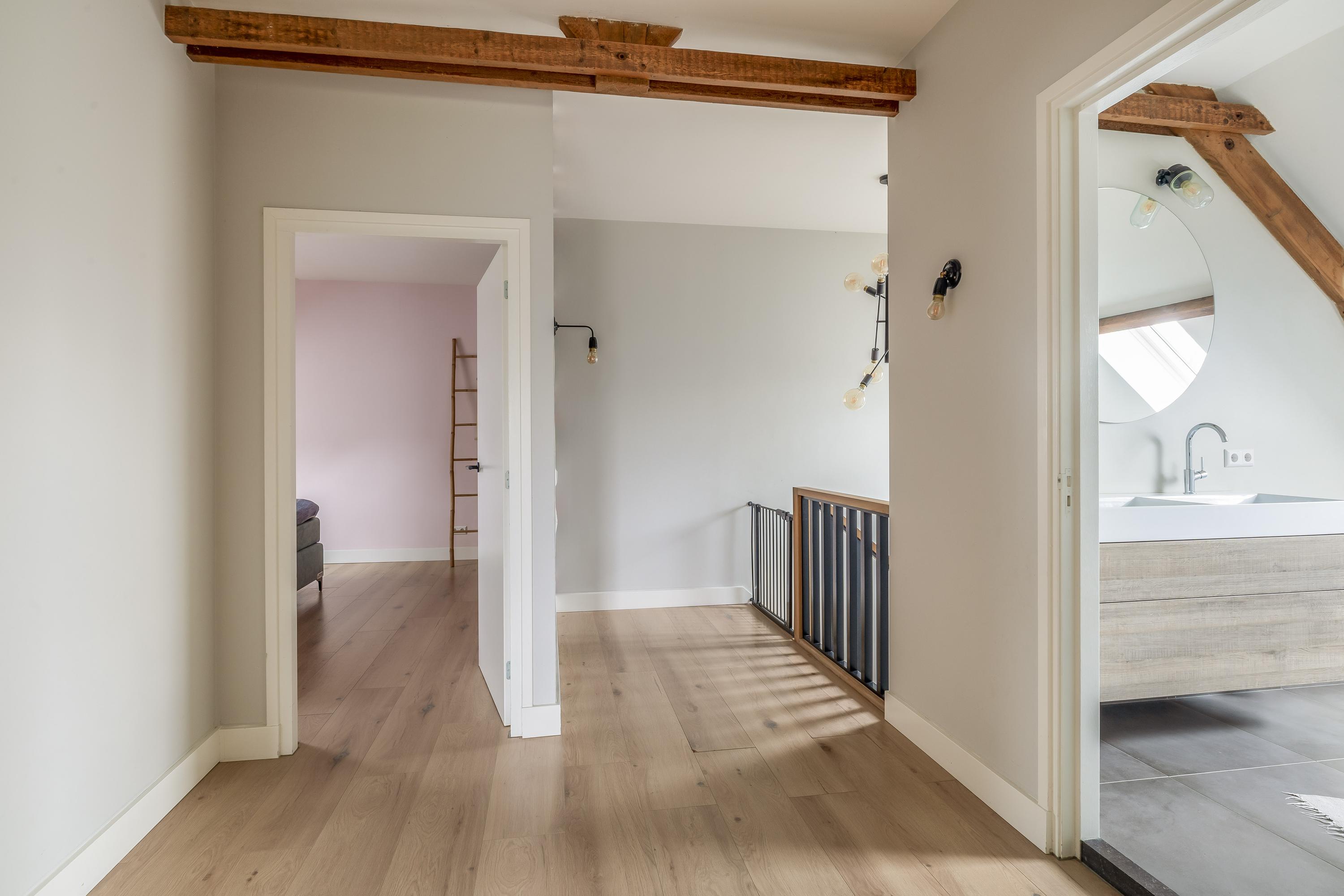 The first floor features a spacious landing with a mezzanine and provides access to three spacious bedrooms, a bathroom, a separate toilet and the central heating room. The floor is finished with laminate flooring and stucco walls. The high ceilings create a spacious feel. One of the bedrooms has fitted wardrobes and the master bedroom features a walk-in wardrobe. The bathroom is fitted with a bath, shower and double washbasin with vanity unit. Exposed wooden beams contribute to the warm, rustic atmosphere. The separate toilet is fitted with a wall-hung toilet. The central heating room houses the combi boiler (Nefit, 2018).
