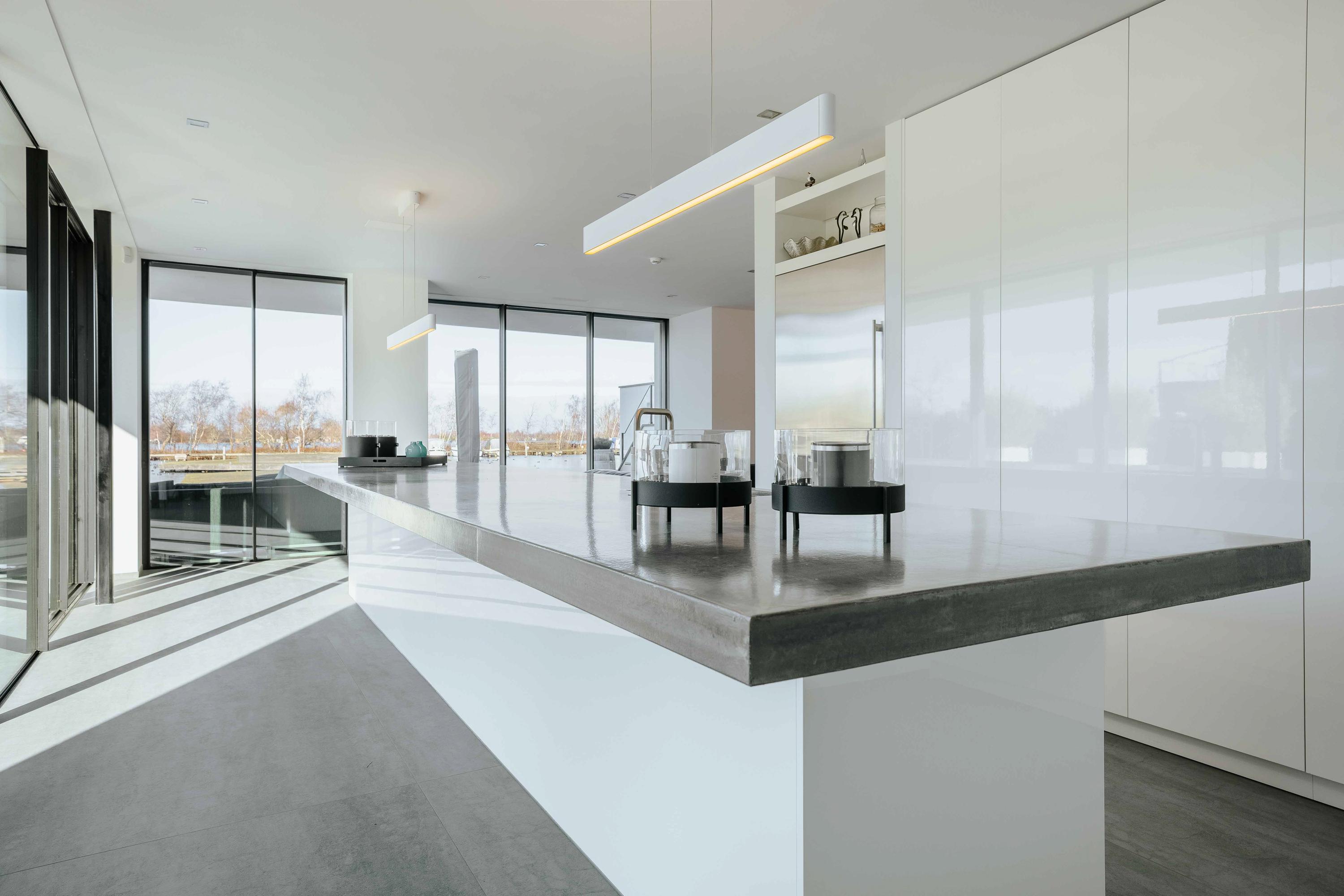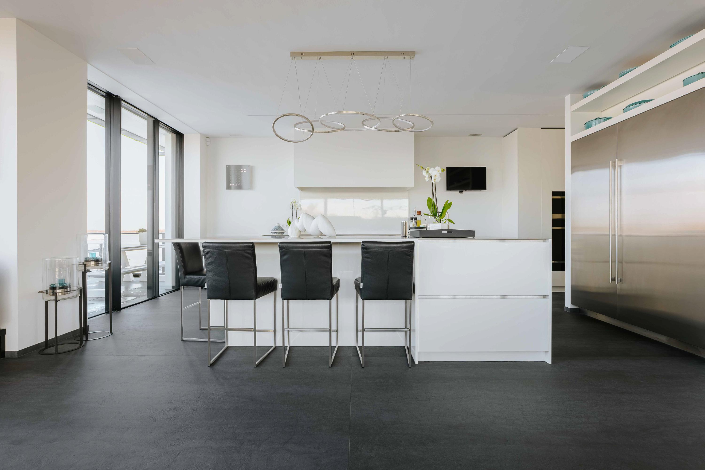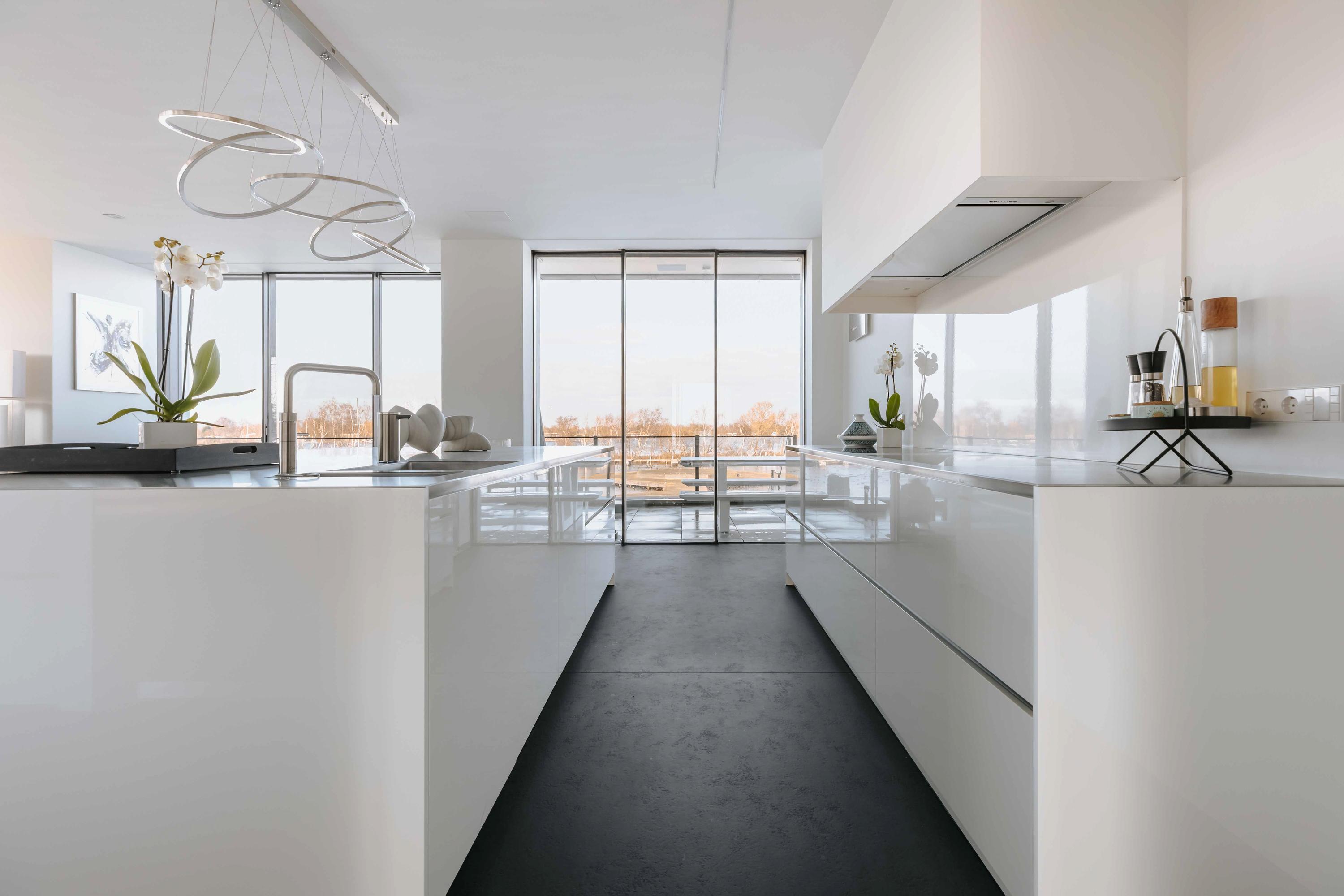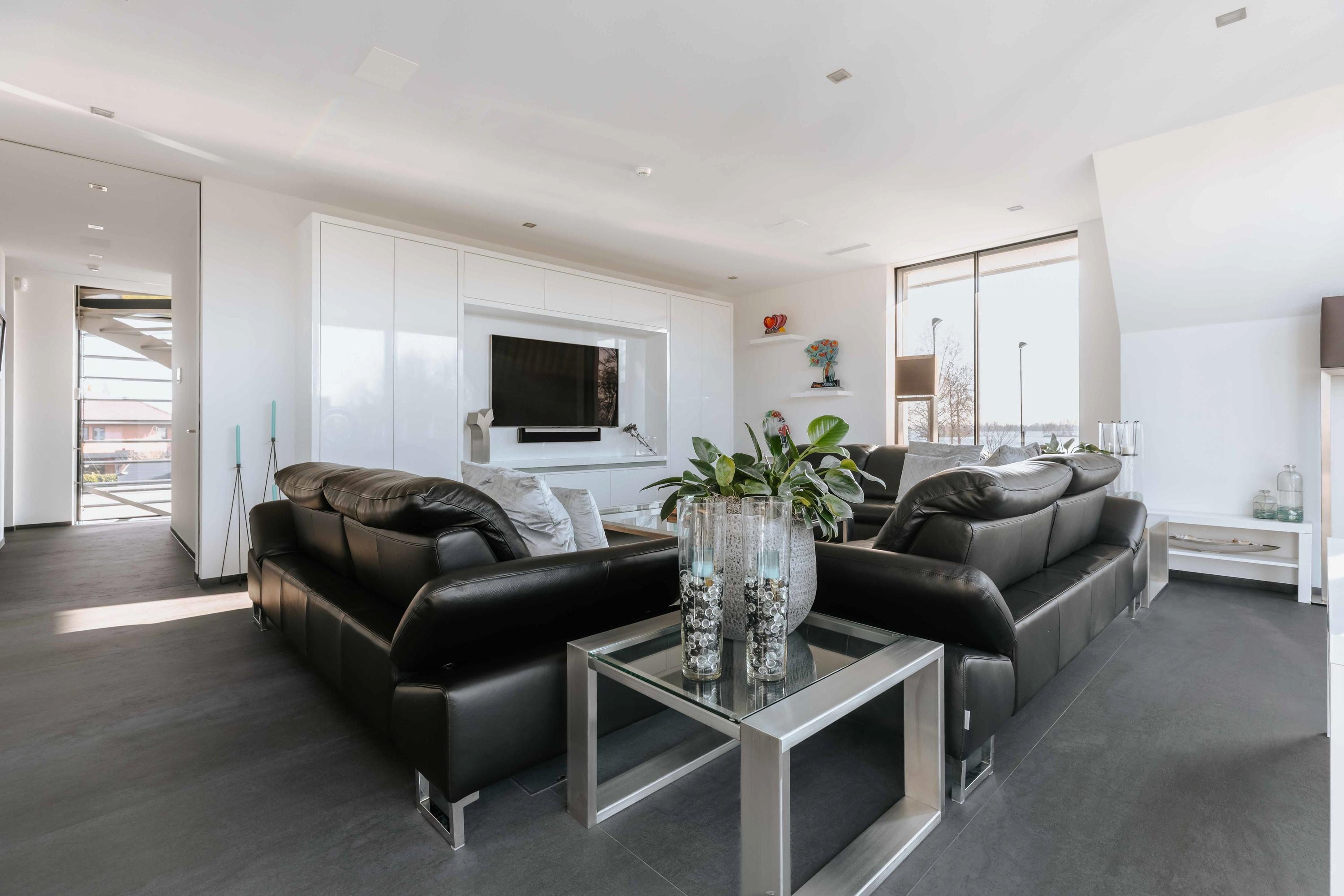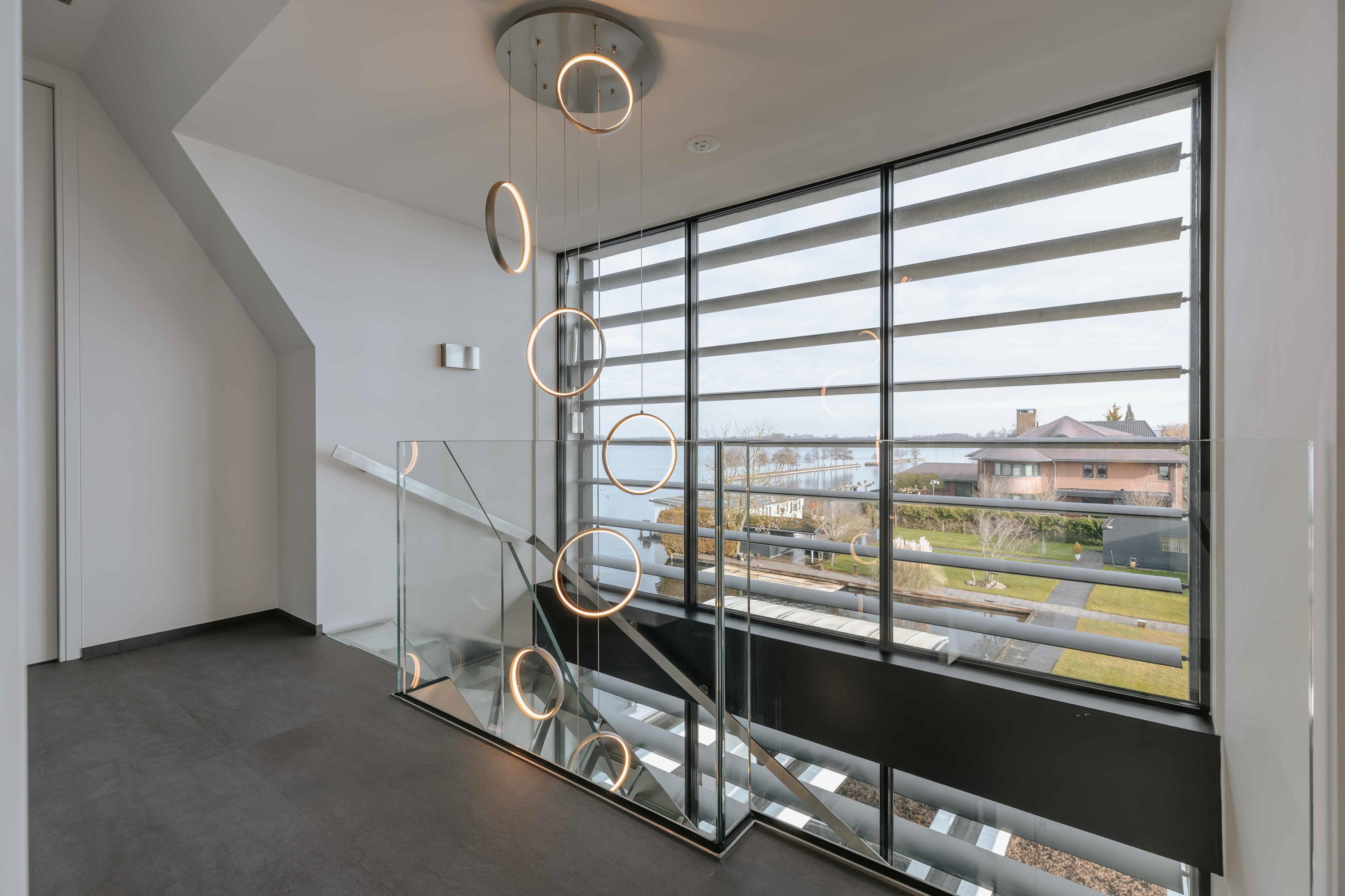 The villa is spread over several levels and has a passenger lift that can reach all levels. The spacious living area is located on the first floor and is characterized by impressive light thanks to floor-to-ceiling windows all around. Inside and outside flow seamlessly into each other here. The luxurious designer kitchen (Lodder) with high-quality built-in appliances forms the heart of the floor, flanked by a spacious dining room and living room with gas fireplaces and stylish, silently sliding steel/glass doors. From the kitchen, you can enjoy phenomenal views of both the harbor and the Vinkeveense Plassen lakes.