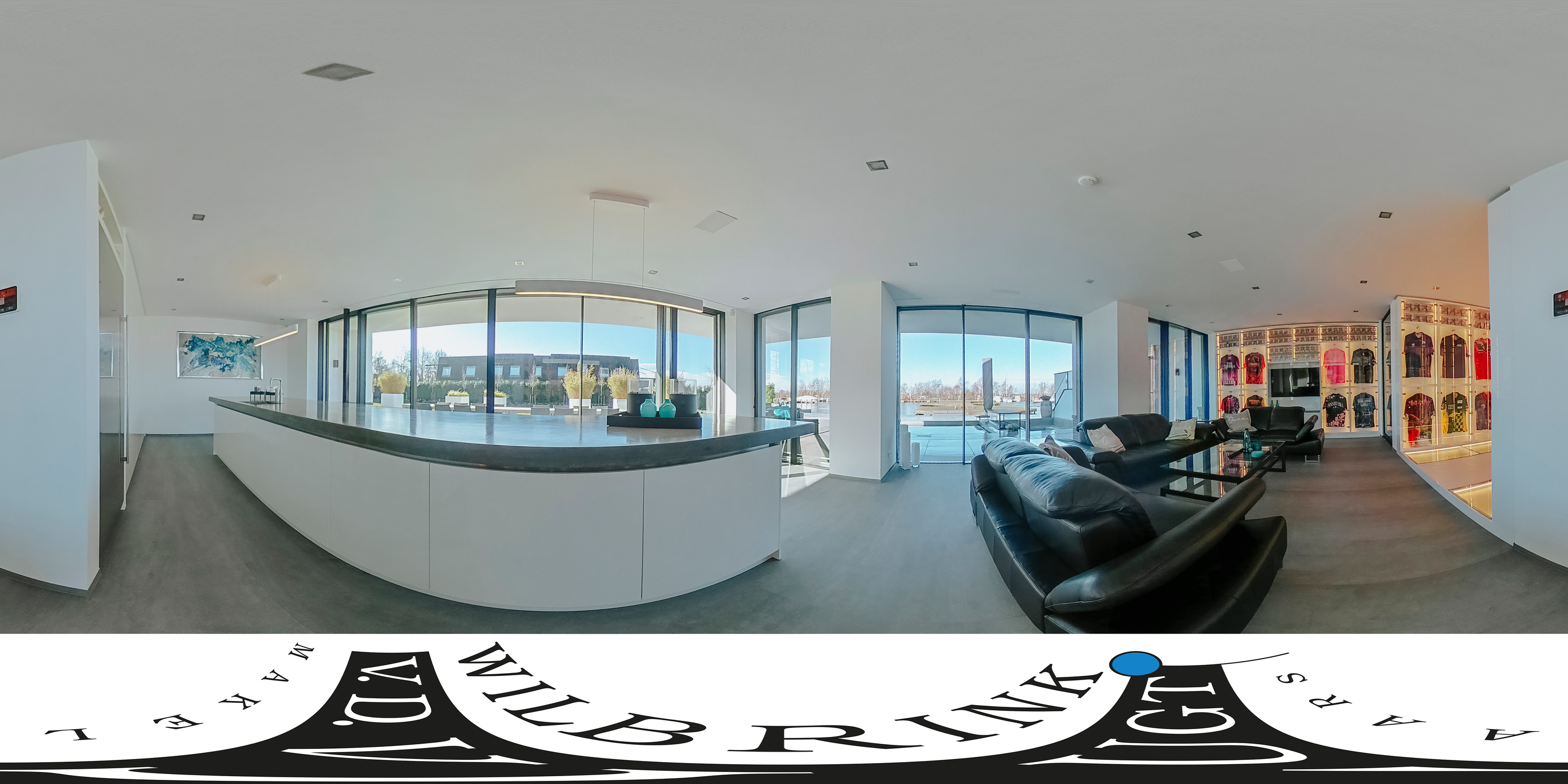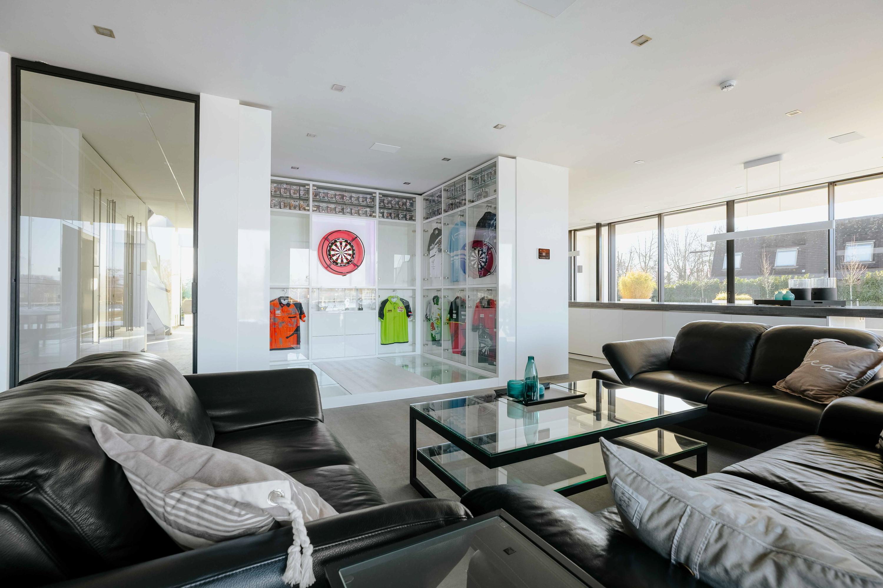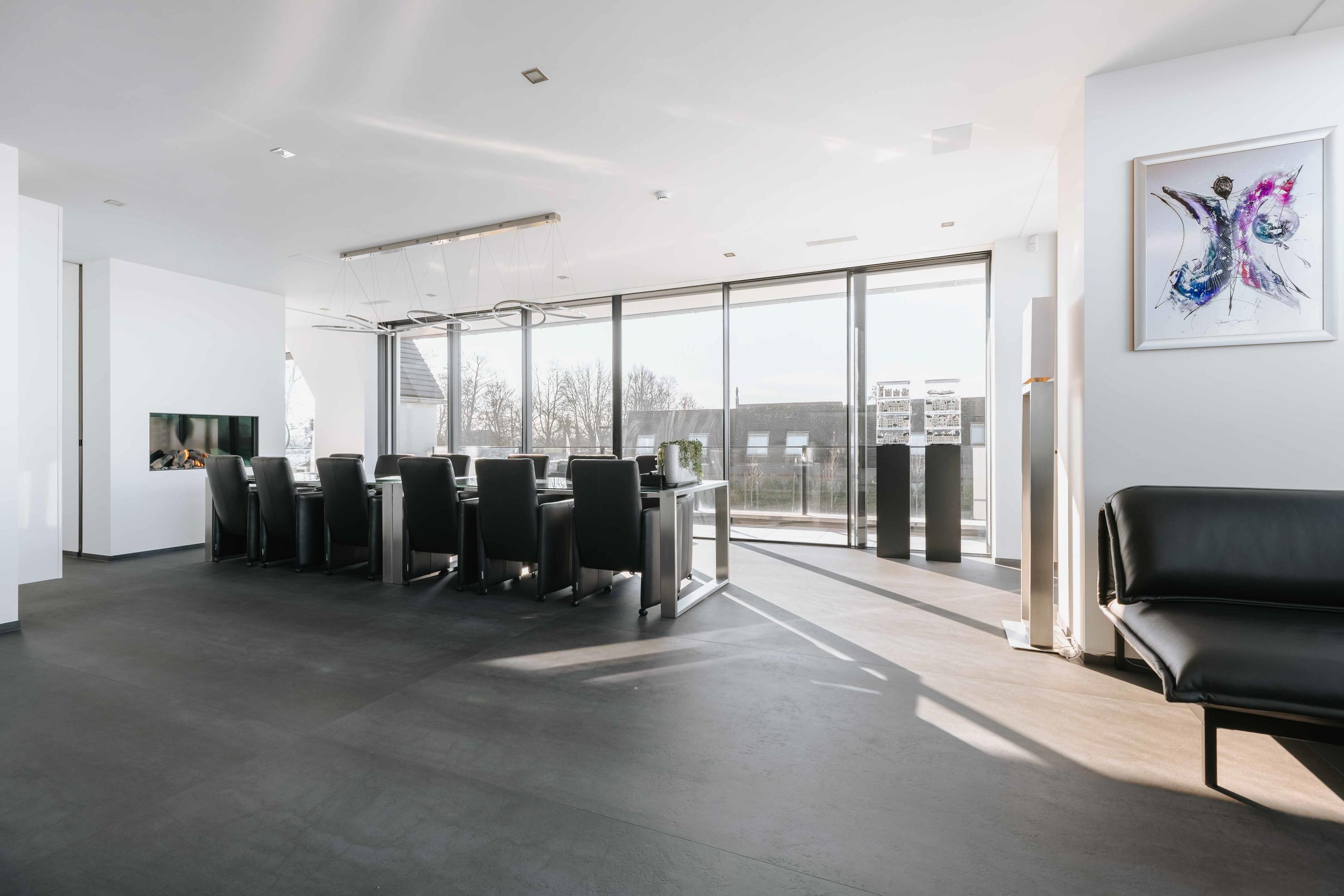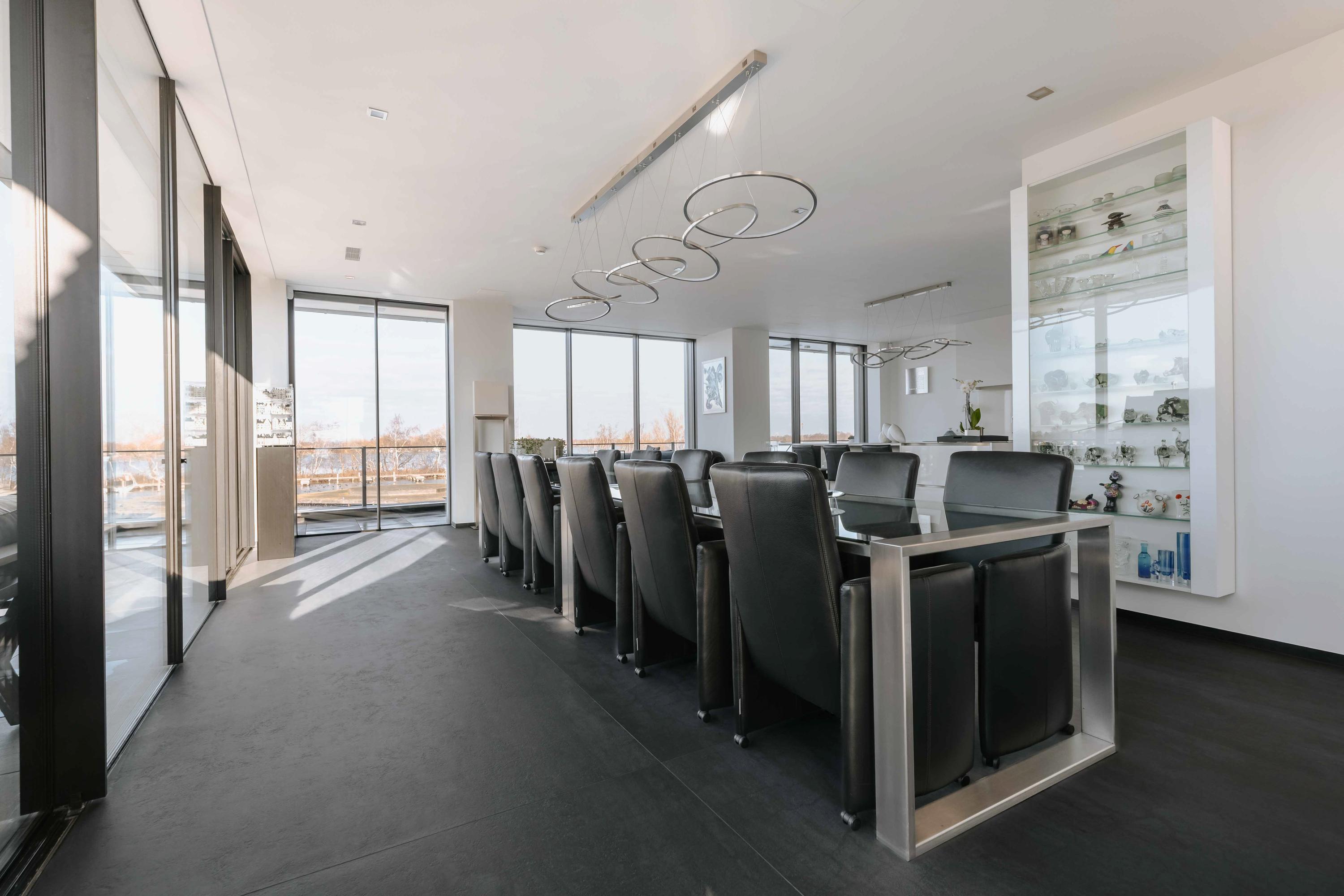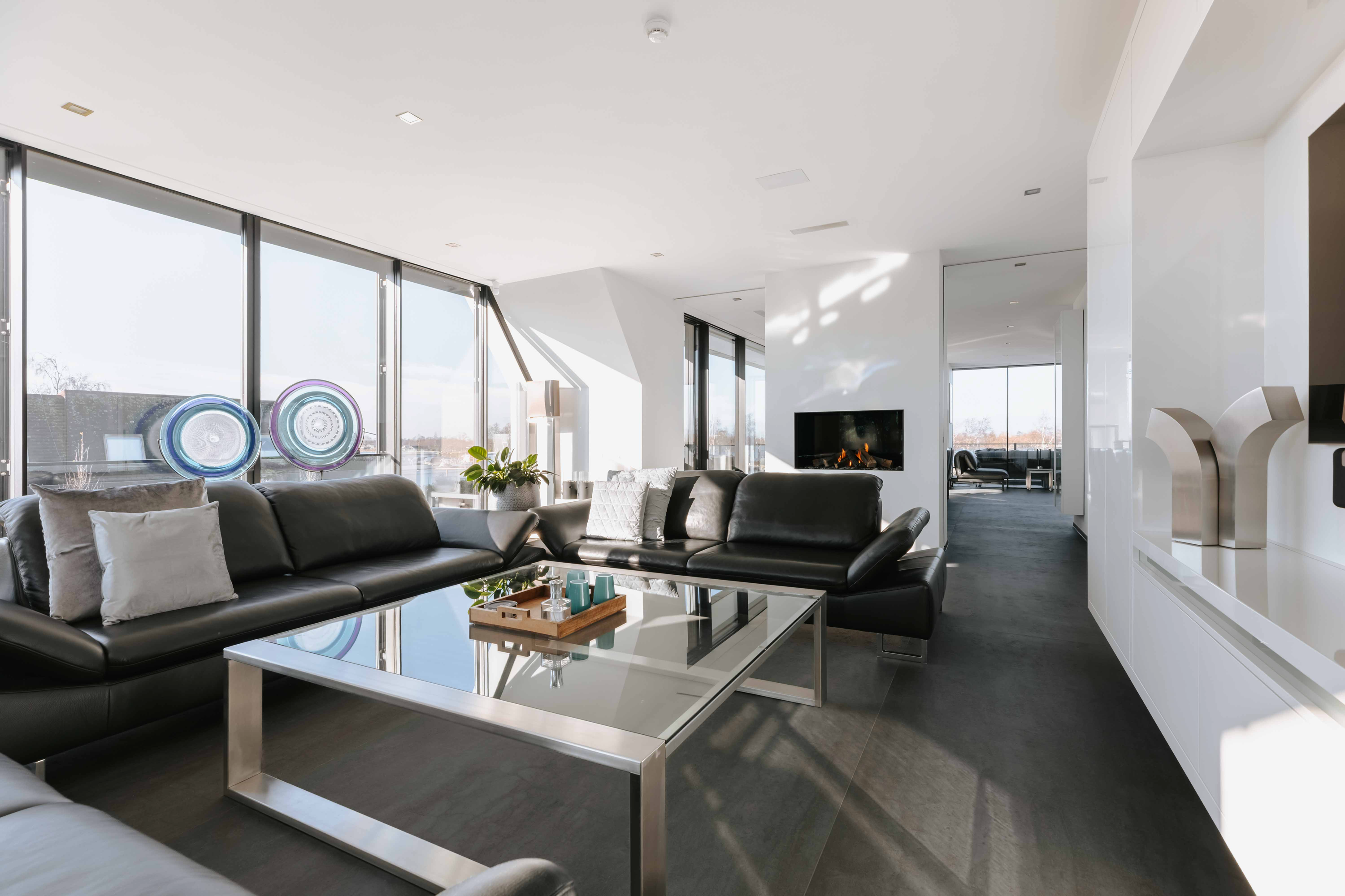 The villa is spread over several levels and has a passenger lift that can reach all levels. The spacious living area is located on the first floor and is characterized by impressive light thanks to floor-to-ceiling windows all around. Inside and outside flow seamlessly into each other here. The luxurious designer kitchen (Lodder) with high-quality built-in appliances forms the heart of the floor, flanked by a spacious dining room and living room with gas fireplaces and stylish, silently sliding steel/glass doors. From the kitchen, you can enjoy phenomenal views of both the harbor and the Vinkeveense Plassen lakes.