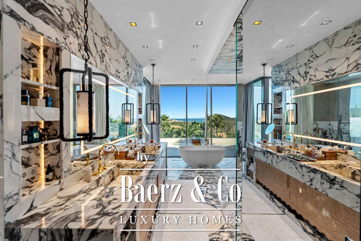 The surroundingsThe masterpiece ‘Villa Z’ is the epitome of luxury living; an ultra-modern and luxurious property located in the exclusive gated urbanization of Vista Alegre in Es Cubells. With the gated community's 24/7 security, cameras and limited access for residents and their guests, privacy and safety are guaranteed. This area is undoubtedly one of Ibiza's most sought after locations for luxury residences and is characterized by its ultra-private properties. This exclusive villa offers breathtaking sea views, some say the best panoramic vistas on the island. Beach lovers will be spoiled for choice, the island's magical southwestern beaches are renowned for their sandy beaches, crystal clear blue waters and world famous beach clubs and seafront restaurants. A 5-minute drive takes you to the idyllic and secluded Playa de Es Cubells, the closest beach to the property. For those seeking lively beachside sophistication, a 15-minute drive leads to Cala Jondal, home to prestigious beach clubs such as Blue Marlin, Jondal, Tropicana and Yemanja. Discover more idyllic and unspoilt beaches at nearby coastal gems such as Es Xarcu, Es Torrent, Cala D'Hort and Cala Llentrisca. The charming town of San Joseph is just a 12-minute drive away and offers all daily necessities and conveniences, from supermarkets and doctors to shops, restaurants and bars. When looking for a taste of vibrant city life, Ibiza Old Town is just 25 minutes away. Traveling is easy and convenient as the airport can be reached in just 20 minutes. Surrounded by lush nature and premium views of the Mediterranean sea, Las Salinas, and the magical island of Formentera, this exquisite estate is the perfect place to call home where peace, privacy and an abundance of luxury come together.The villaThis exclusive ultra-modern mansion with 8 bedrooms and 12 bathrooms, offers an unparalleled luxurious living experience with 1.027m2 of built area on a generous 2.939m2 plot. Be prepared to be awed by 4 levels of extravagance, accessible by your own private elevator. Step through an elegant golden massive gate to enter the premises. The front door of the villa is decorated with gold and luxurious Carrara marble, welcoming you with elegance and extravagance. Step into the opulent open plan living, dining and kitchen space with a modern fireplace and first-class sea views. Impressive sliding glass doors open completely automatic all the way to the expansive terrace, seamlessly blending indoors and outdoors for a perfect luxury open-air living experience. The state-of-the-art kitchen is a culinary heaven, equipped with a galore of premium appliances such as three ovens, two wine refrigerators and multiple cooking options including gas burners, grill and induction cooktop. On the right wing of the main floor, you will find two beautiful bedrooms with en-suite bathrooms. Ascending to the first floor, the master bedroom awaits with a modern fireplace, a stunning walk-in closet, a private roof terrace access and an ultra-luxurious en-suite bathroom, complete with his and hers sinks, a freestanding bathtub with mesmerizing views, and separate toilet for the ultimate comfort. Lavish details of Carrara marble tiles and golden accents adorn all twelve bathrooms throughout this magnificent estate. On the -1 level you will find three additional bedrooms, all with luxurious en-suite bathrooms, terrace access and offering views over the garden, pool and Mediterranean sea. On this floor you also will discover a world of first-class entertainment and relaxation. Find a wine cellar that is completely dedicated to red wines and maintained at the perfect temperature of 16 degrees. Continue your way to an exclusive private club with a dark marble bar, cinema screen, lounge area, a separate guest toilet, an ice machine, and soundproofing, all setting the stage for unforgettable entertaining experiences. Further on this floor of leisure heaven, you will find a luxurious