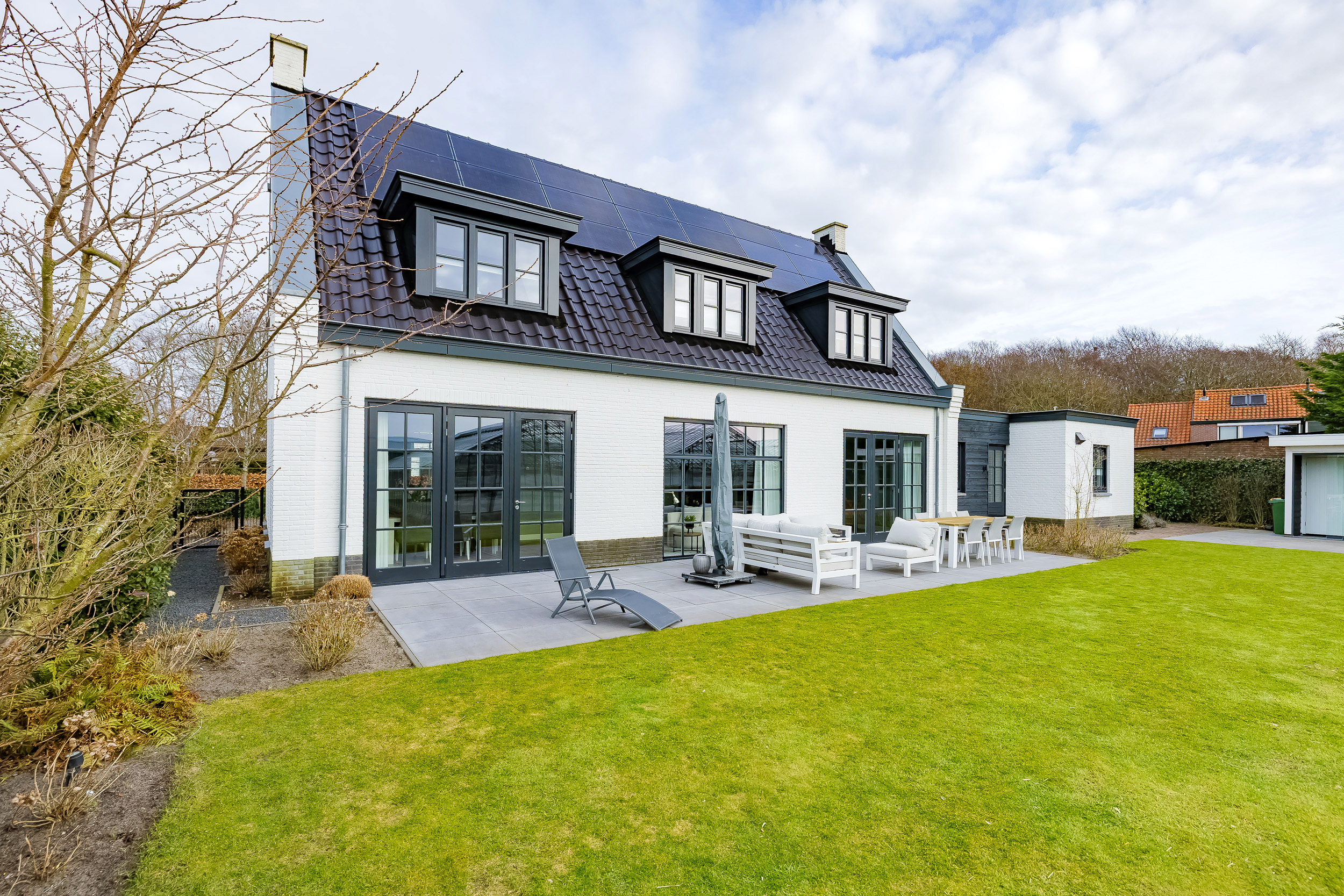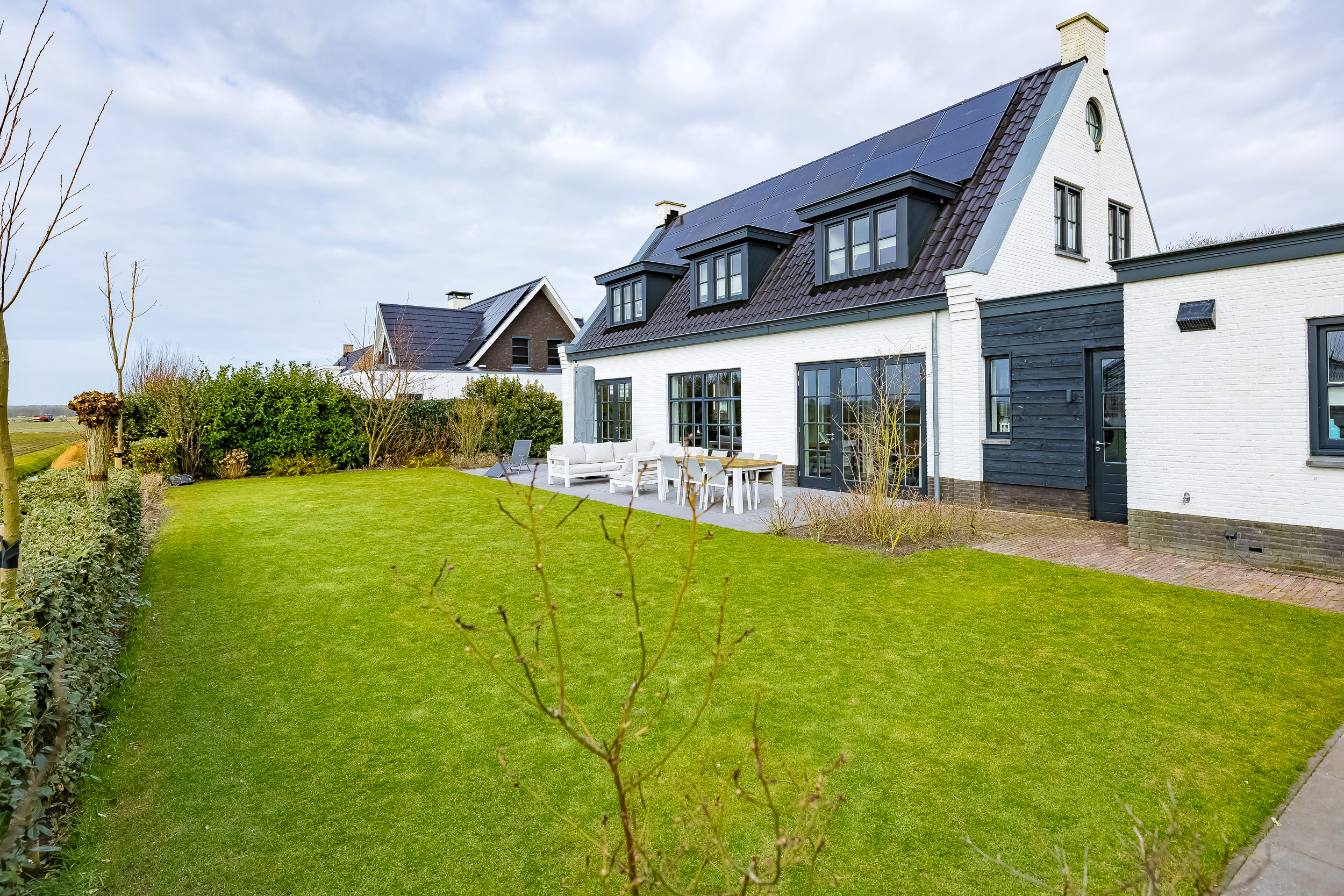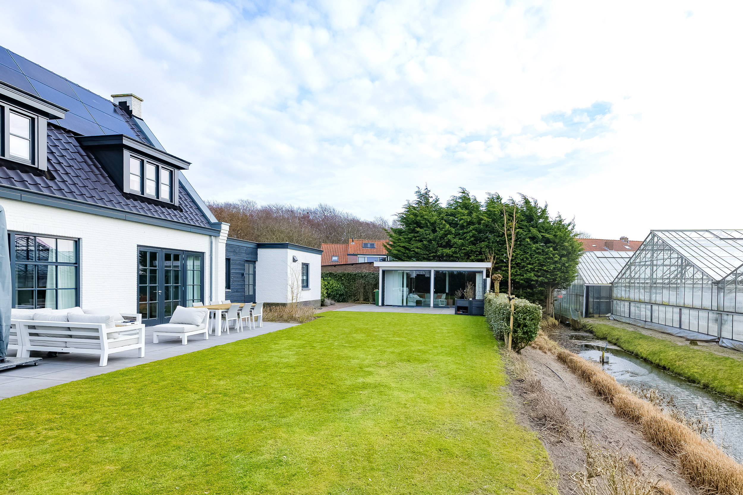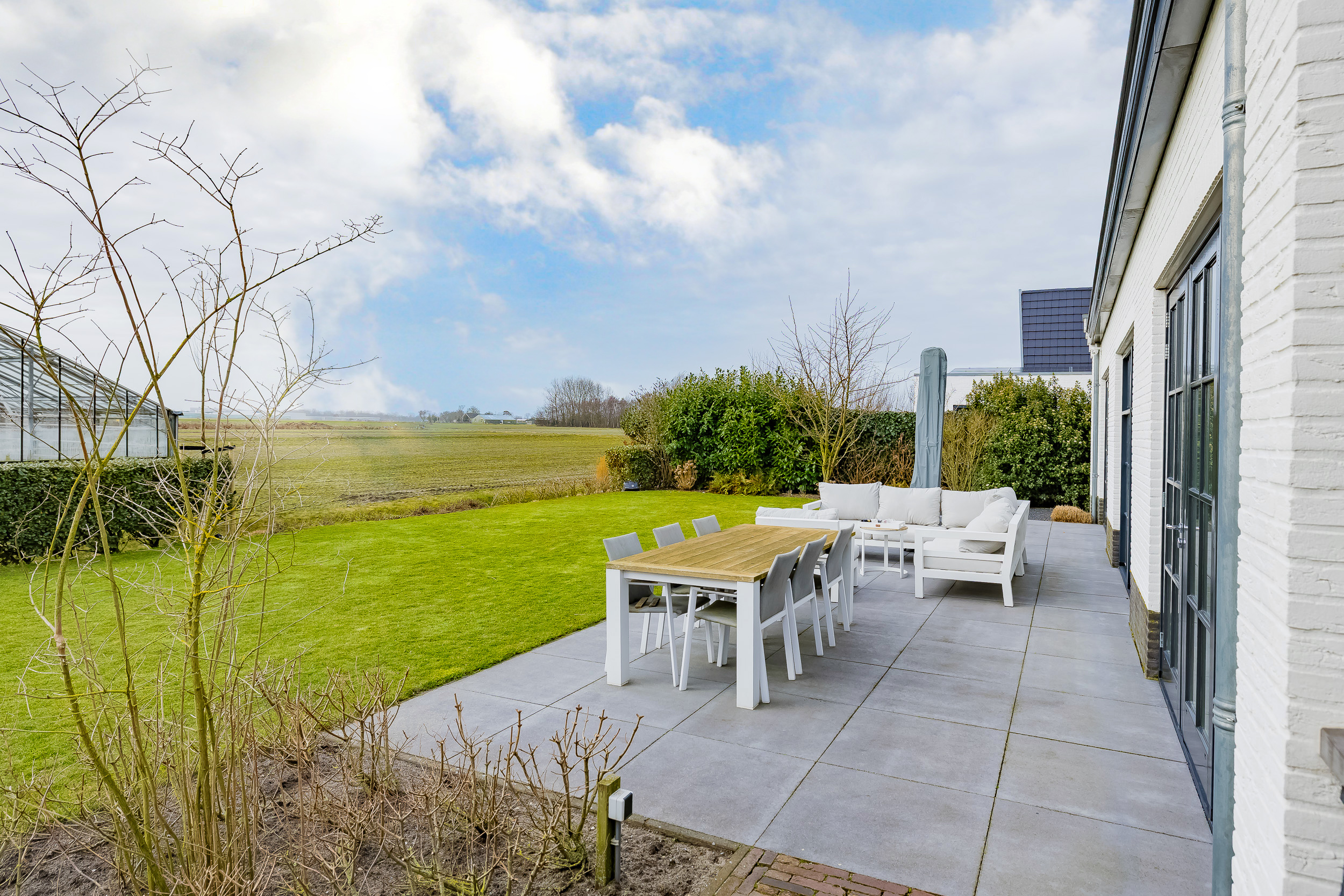 The garden surrounds the house and always offers a sunny spot. Behind the living room is a large tiled terrace with a phenomenal unobstructed view of the bulb fields—here you can enjoy the scenery in every season.