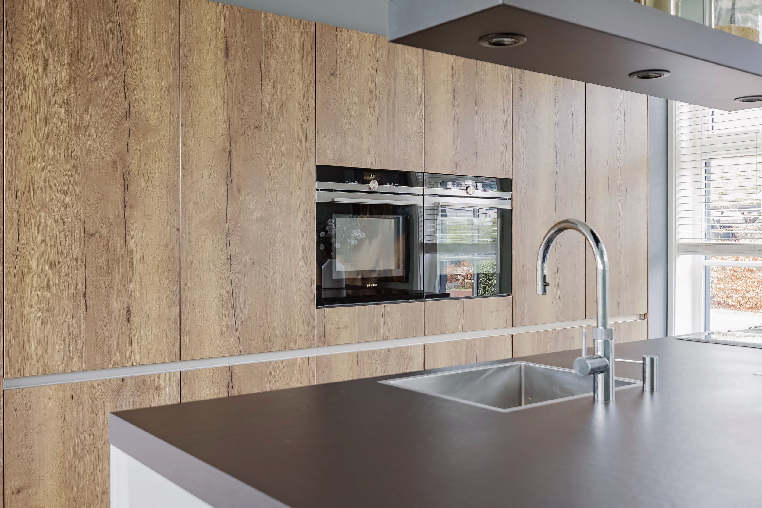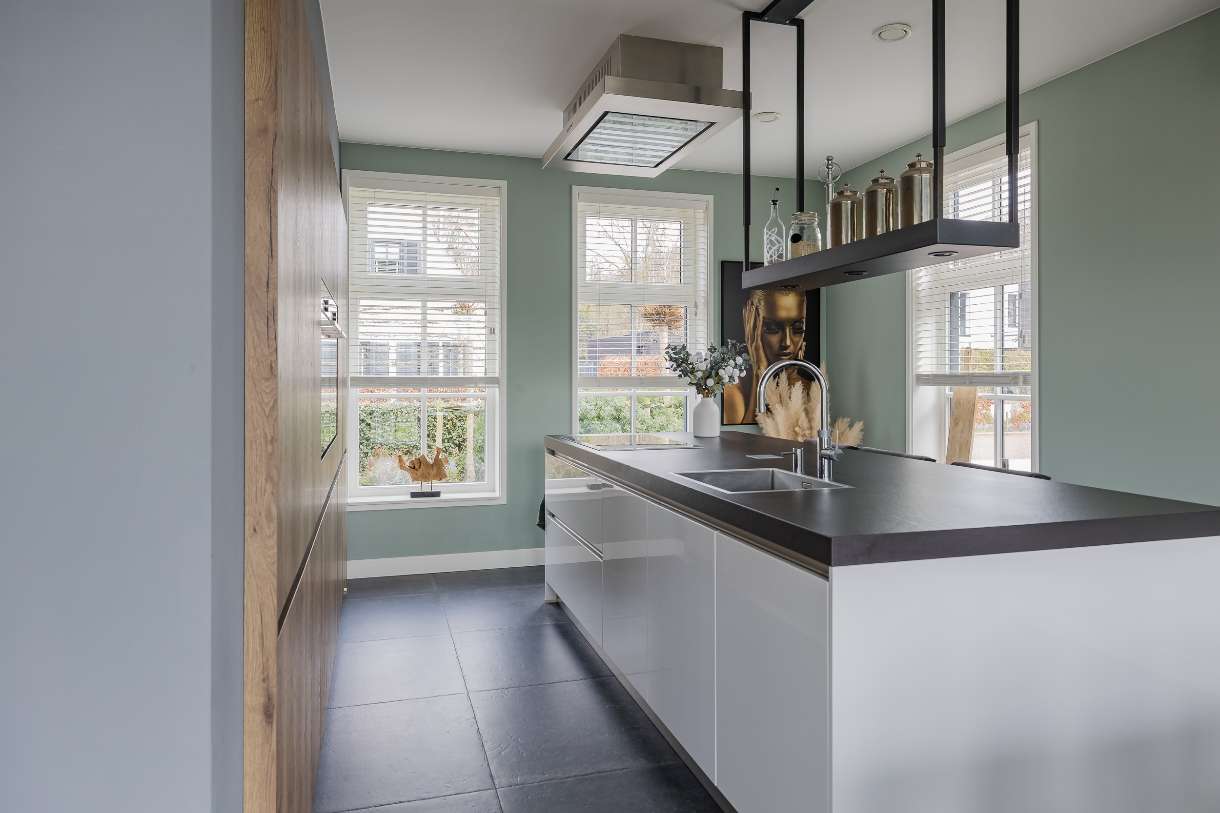 Sliding doors lead to the beautiful kitchen with a cooking island. Adjacent to this is the utility room with space for laundry appliances and a door to the office area on the ground floor: ideal for working from home.