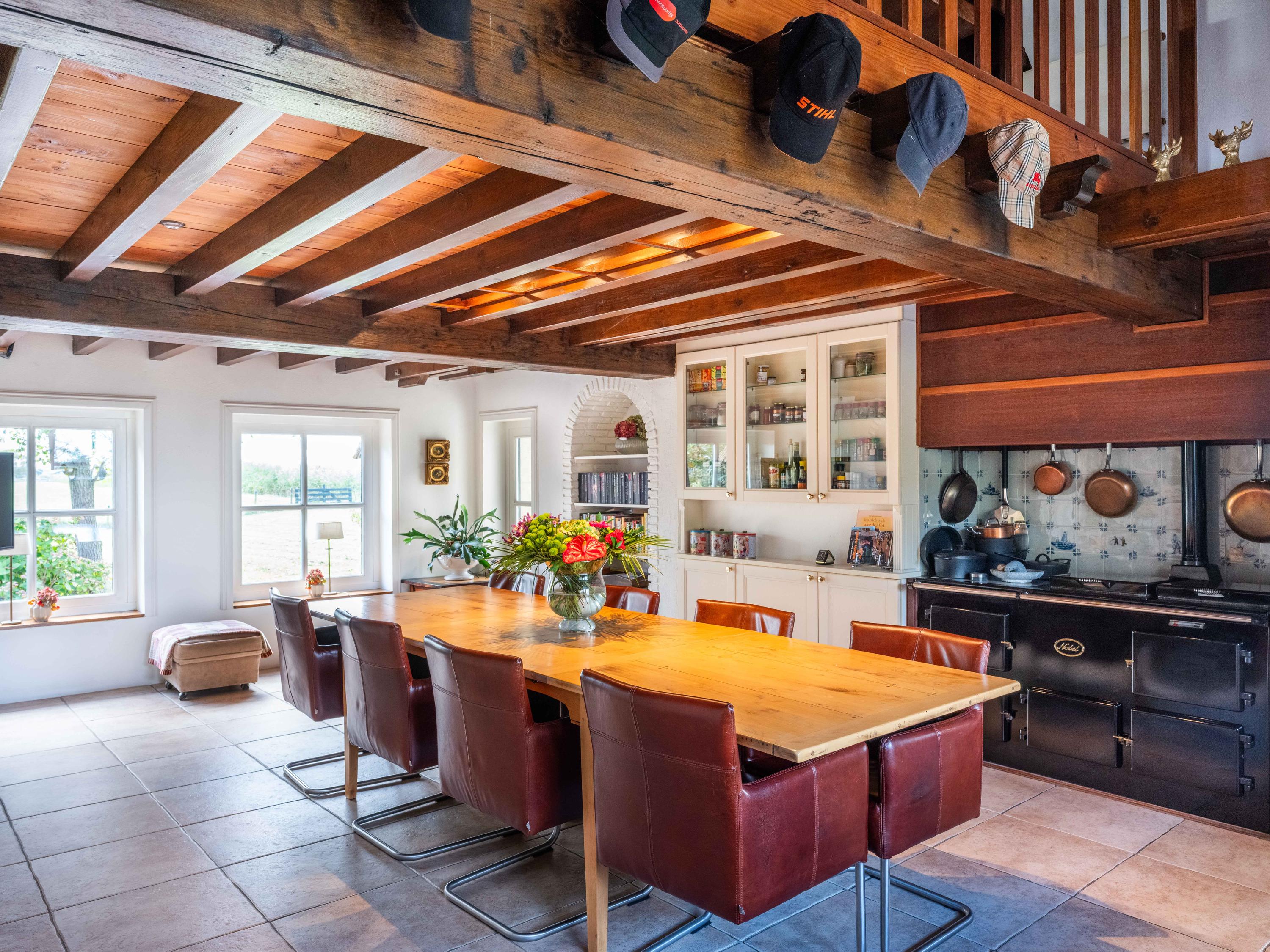The country-style kitchen is fitted with built-in cabinets and ample storage space. From here, you can also access the spacious cellar, ideal for storage or as a wine cellar. The generous kitchen forms the heart of the home, featuring authentic details such as an English cooker with four ovens and characteristic beamed ceilings. The kitchen flows seamlessly into the inviting living room, where abundant natural light and views over the water immediately draw your attention. This room feels spacious and welcoming, enhanced by the centrally positioned wood-burning stove that adds a warm, homely touch.