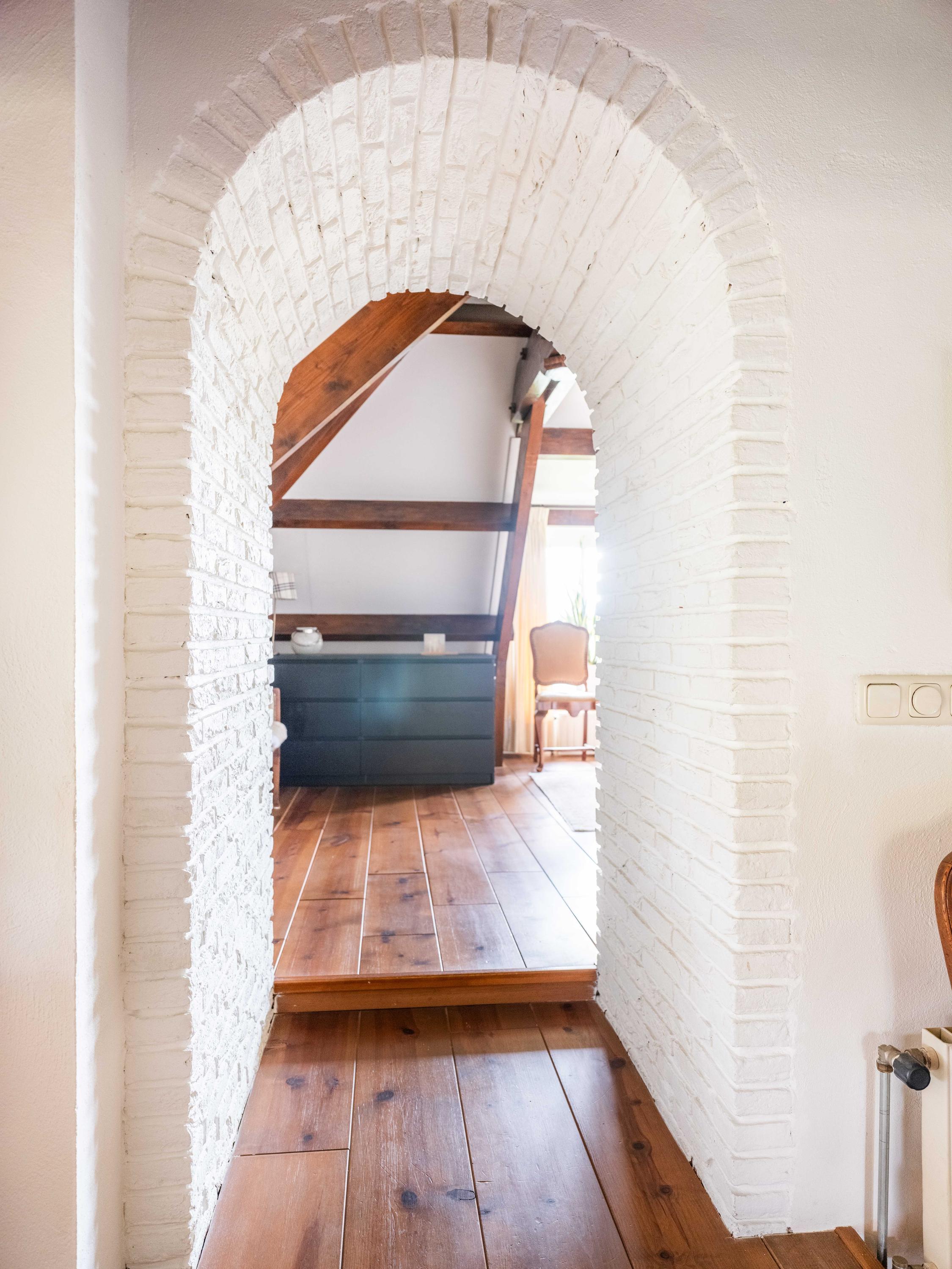 The staircase leads to a large open mezzanine overlooking the kitchen below. This area currently serves as a workspace and guest room, offering lovely views of the garden. Through the open passage, you enter the spacious bedroom, which boasts stunning views over the garden and the wide-open meadows beyond. Thanks to its favorable orientation, this room enjoys sunlight and tranquility throughout the day.