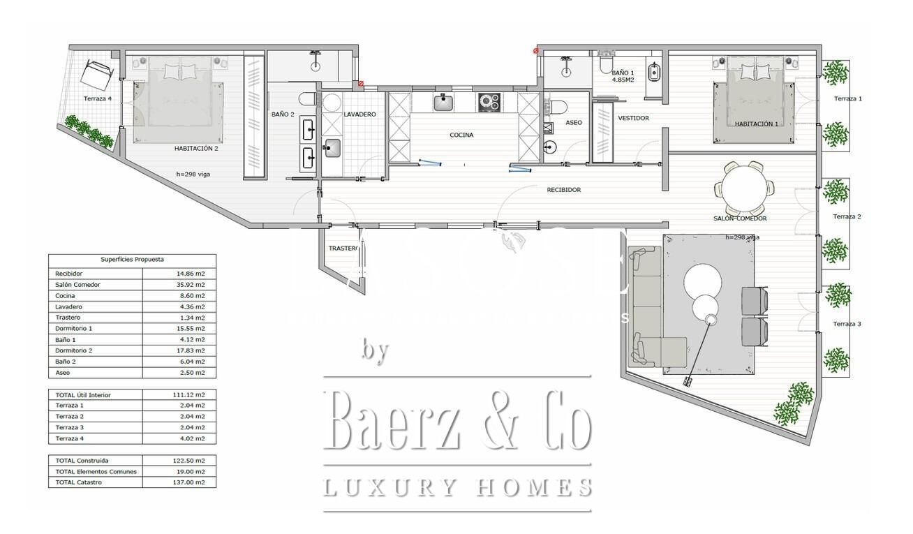 Dos dormitorios dobles ofrecen generosos espacios de descanso, destacando la suite principal con una galería integrada que ensalza la calidez y la luz natural. La vivienda cuenta con dos baños completos más un aseo de cortesía, y detalles cuidados como armarios empotrados, zona de lavandería y lavadero que elevan el confort cotidiano. El apartamento incluye una terraza y ofrece acceso cómodo mediante ascensor.