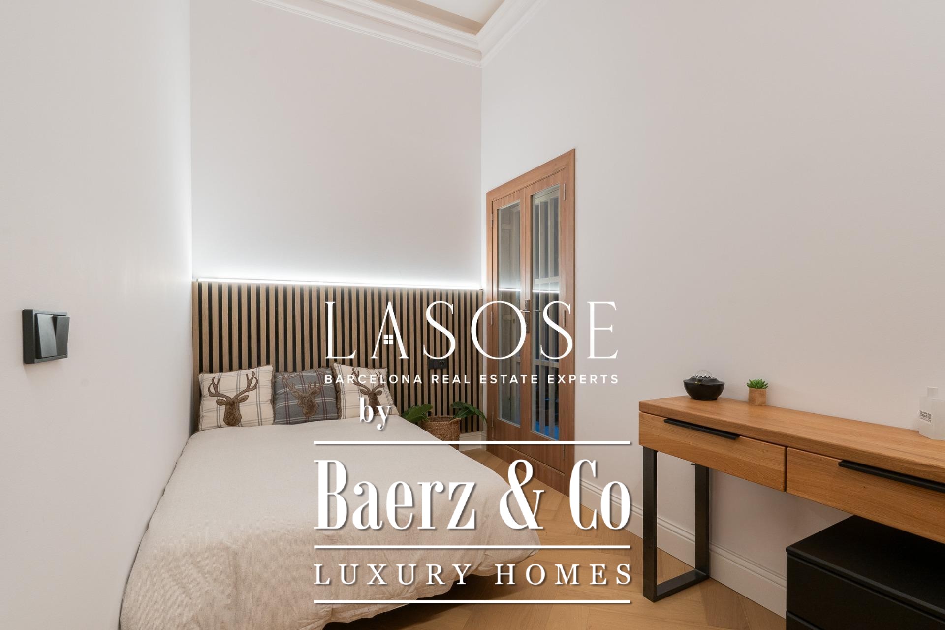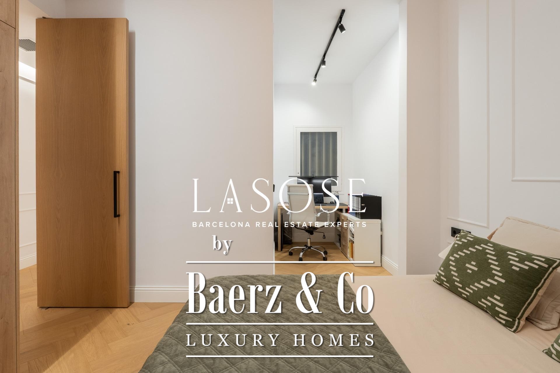 La distribución del apartamento destaca por un amplio salón comedor independiente con techos altos, tres dormitorios—uno de ellos una elegante suite, uno doble y uno sencillo—y dos baños completos. La cocina, totalmente equipada, presenta un diseño contemporáneo con materiales de primera calidad y combina a la perfección modernidad y tradición. Un balcón de unos 4,61 metros cuadrados proporciona luz, vistas a la ciudad y una conexión directa con el ambiente de la calle Carrer de Casp.