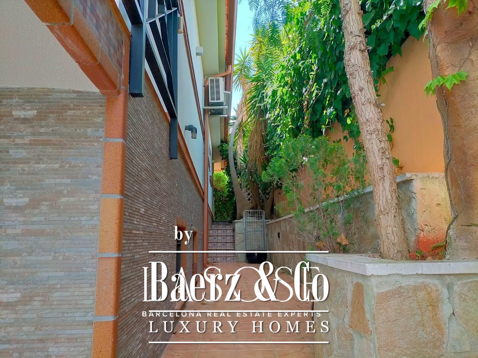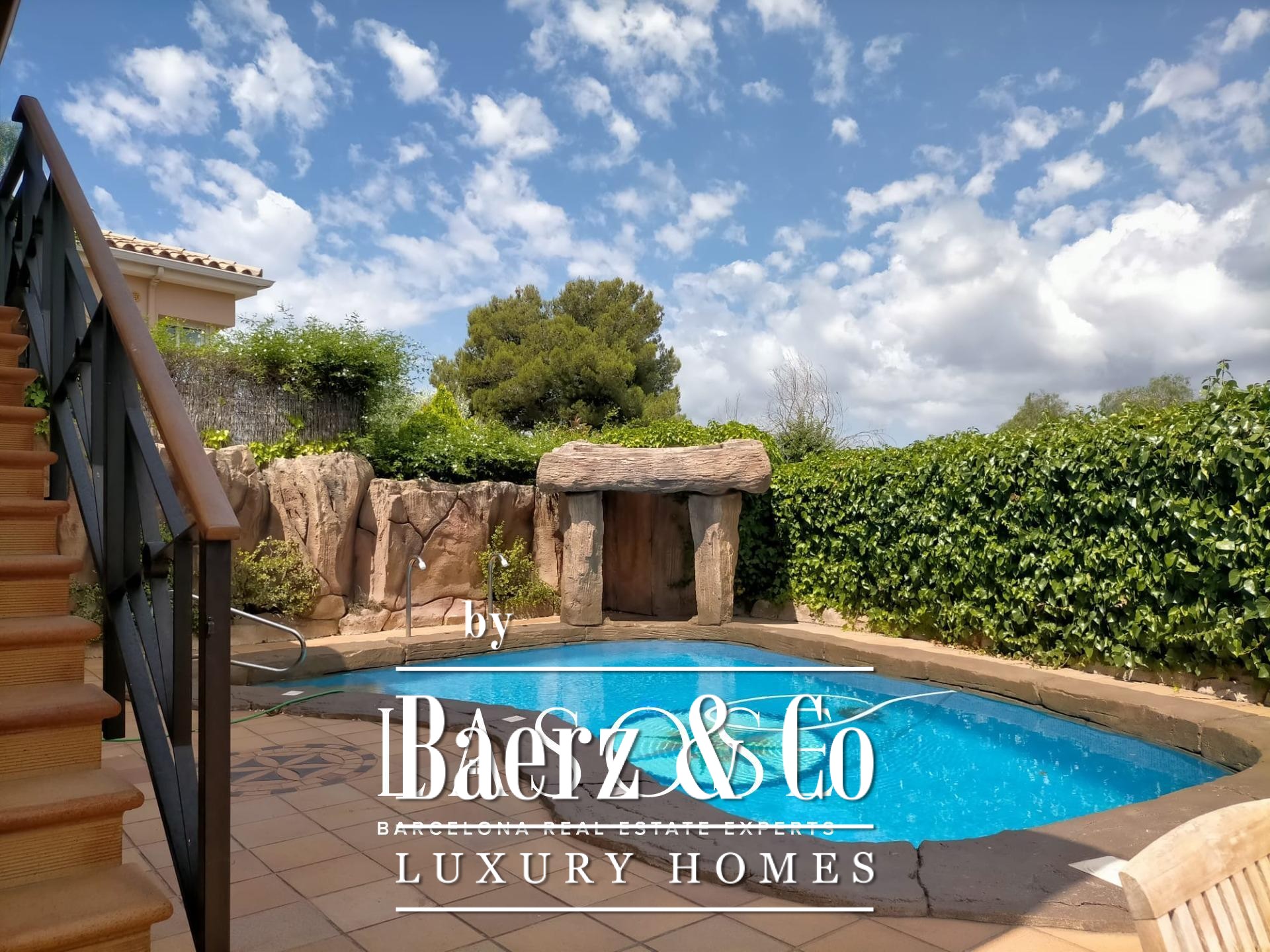 En el exterior, un exuberante jardín con vegetación mediterránea madura, césped y un antiguo olivo enmarca la piscina, que está bordeada con piedra natural y presenta una cascada, creando el entorno ideal para tardes de ocio y eventos sociales. Las zonas funcionales incluyen un amplio garaje privado y trastero, con espacio suficiente para vehículos y enseres de temporada. Aire acondicionado, calefacción, sistemas de seguridad y barbacoa completan el confort y la comodidad.