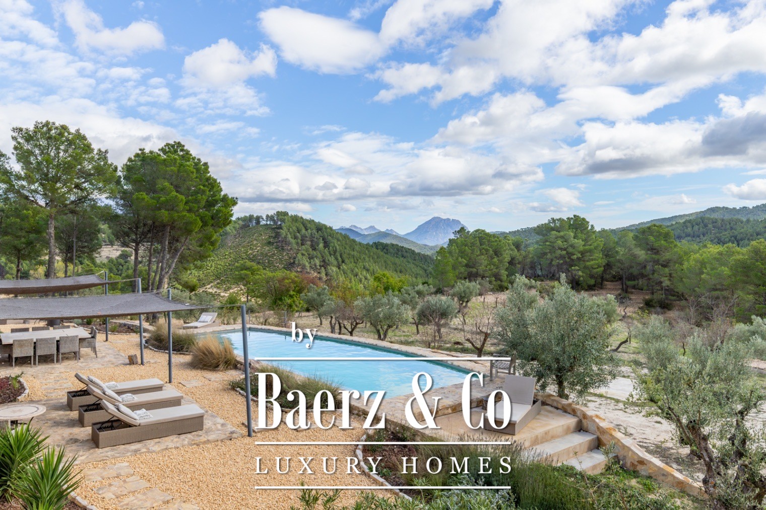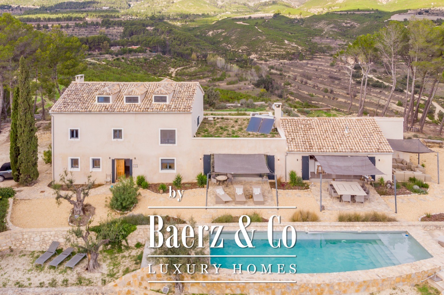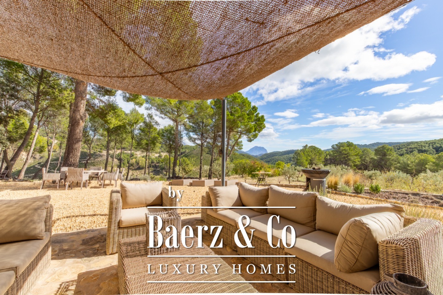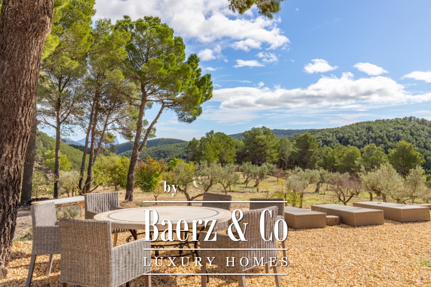 Finca Torremanzanas representa un tipo de propiedad poco común en una de las regiones interiores más tranquilas de España. Ubicada en 18 hectáreas de terreno mediterráneo exuberante a 850 metros de altitud, esta finca bellamente renovada se encuentra a solo 3 km del pueblo de Torremanzanas y ofrece vistas panorámicas al Puig Campana. Reformada con esmero en 2022, la casa principal de 450 m² fusiona acabados modernos de alta gama con auténtico carácter mediterráneo. Cada espacio de vida es luminoso y elegantemente sobrio, abriéndose a un paisaje de olivos, almendros y nogales.