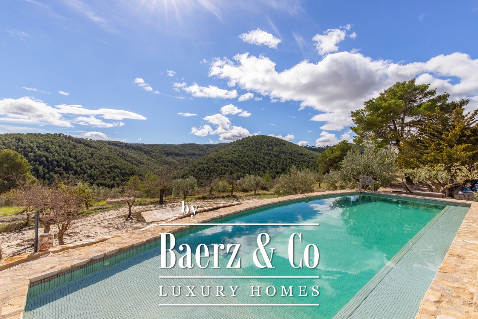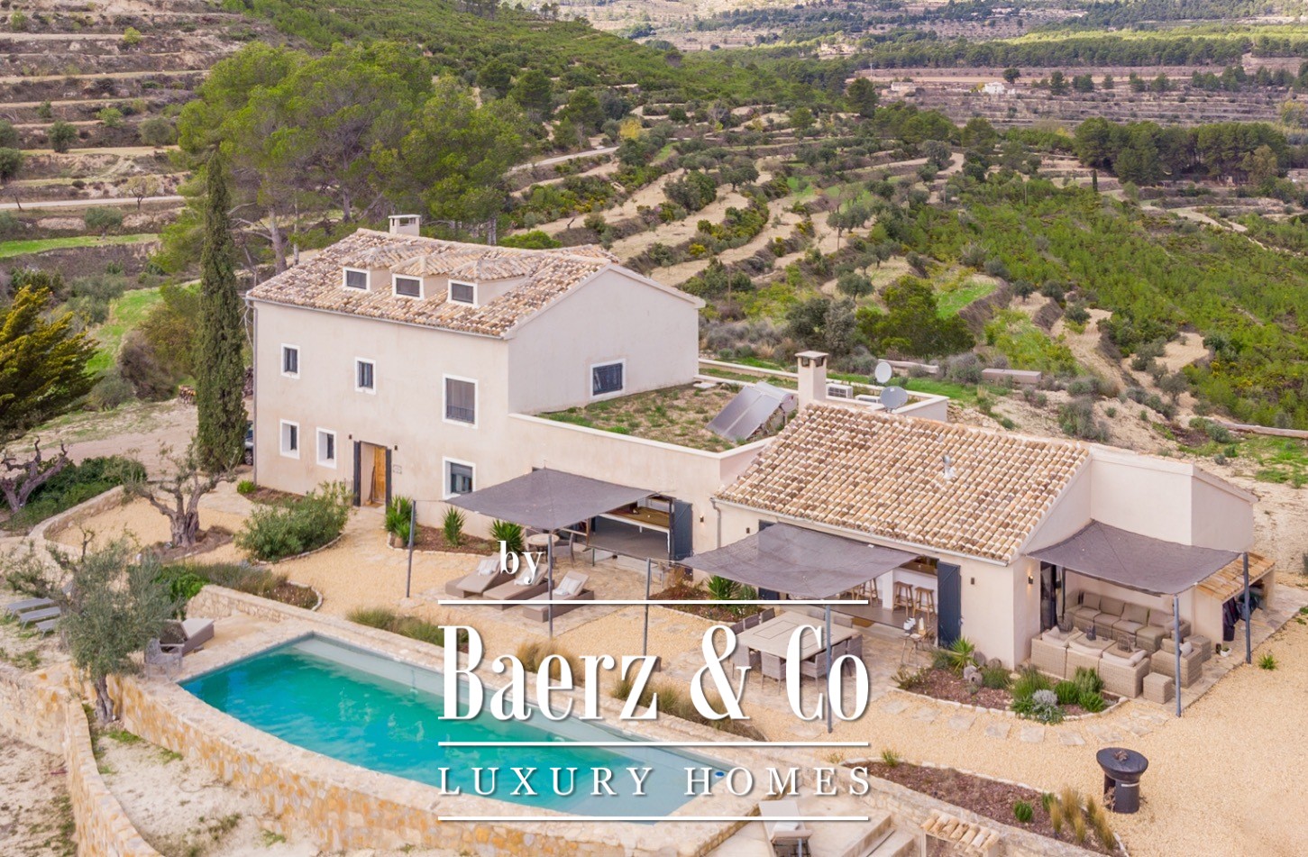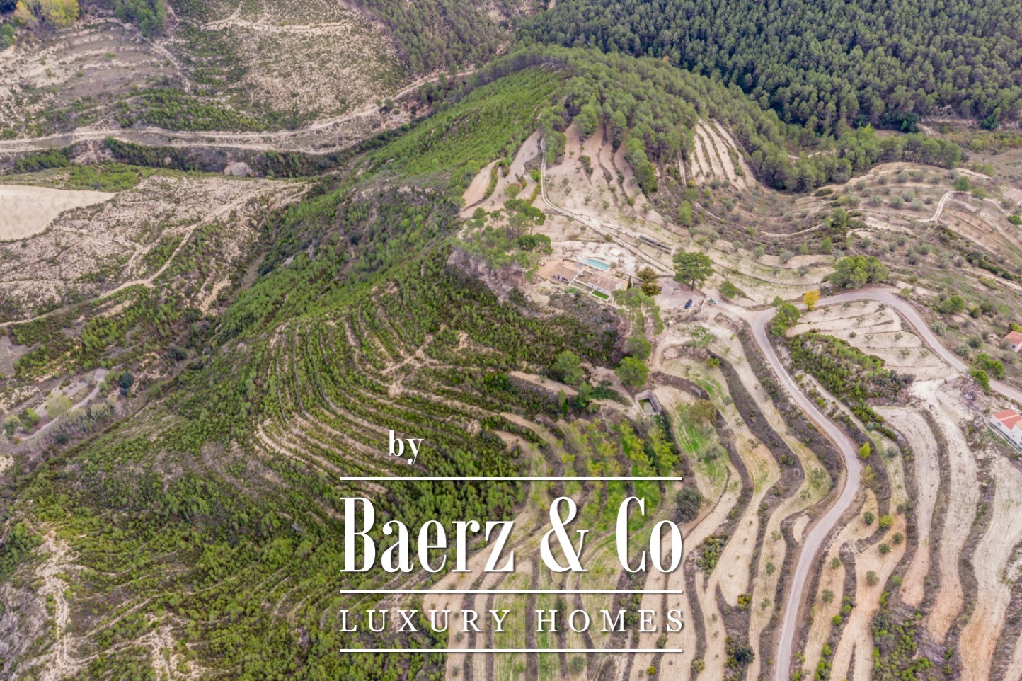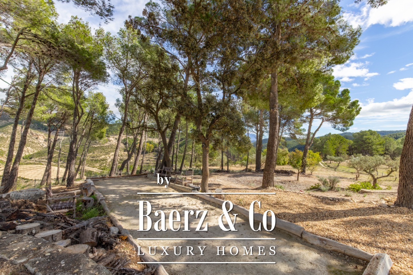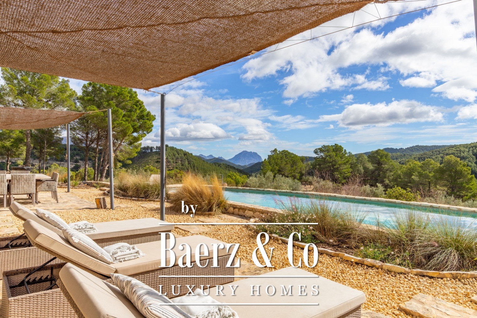Finca Torremanzanas representa un tipo de propiedad poco común en una de las regiones interiores más tranquilas de España. Ubicada en 18 hectáreas de terreno mediterráneo exuberante a 850 metros de altitud, esta finca bellamente renovada se encuentra a solo 3 km del pueblo de Torremanzanas y ofrece vistas panorámicas al Puig Campana. Reformada con esmero en 2022, la casa principal de 450 m² fusiona acabados modernos de alta gama con auténtico carácter mediterráneo. Cada espacio de vida es luminoso y elegantemente sobrio, abriéndose a un paisaje de olivos, almendros y nogales.