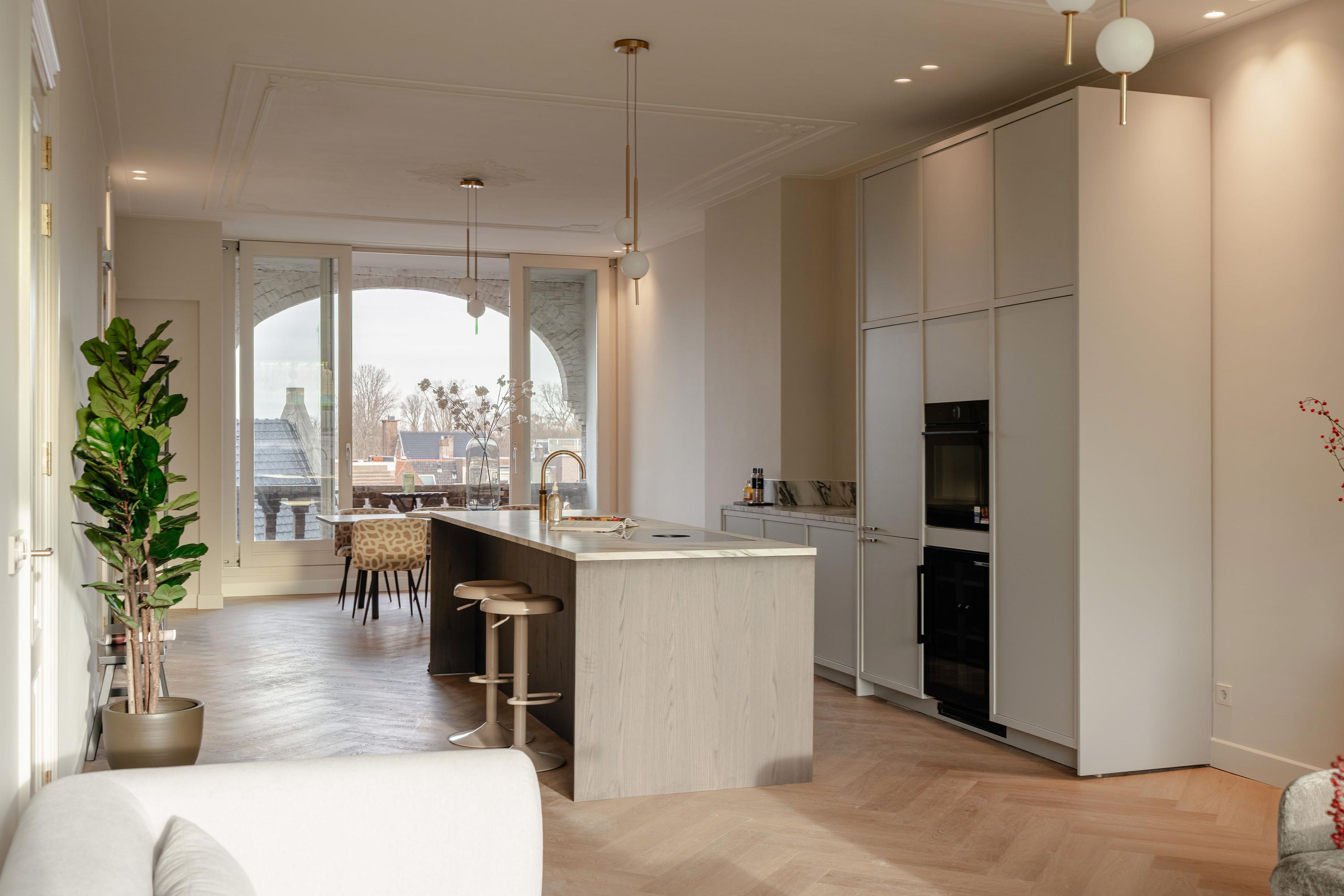 L’espace de vie ouvert se distingue par une lumière naturelle généreuse, grâce aux grandes fenêtres en façade et à l’arrière, soulignée par une hauteur sous plafond d’environ 3,07 mètres. La cuisine haut de gamme constitue le cœur convivial de l’appartement, avec un îlot spacieux doté de plaques à induction, d’un robinet Quooker, d’électroménagers intégrés et d’un espace bar propice aux conversations détendues. Deux chambres et deux salles de bains offrent intimité et confort ; la suite principale dispose d’armoires encastrées et d’une salle d’eau privative avec douche à l’italienne. La seconde salle de bains a été pensée pour accueillir famille et invités.