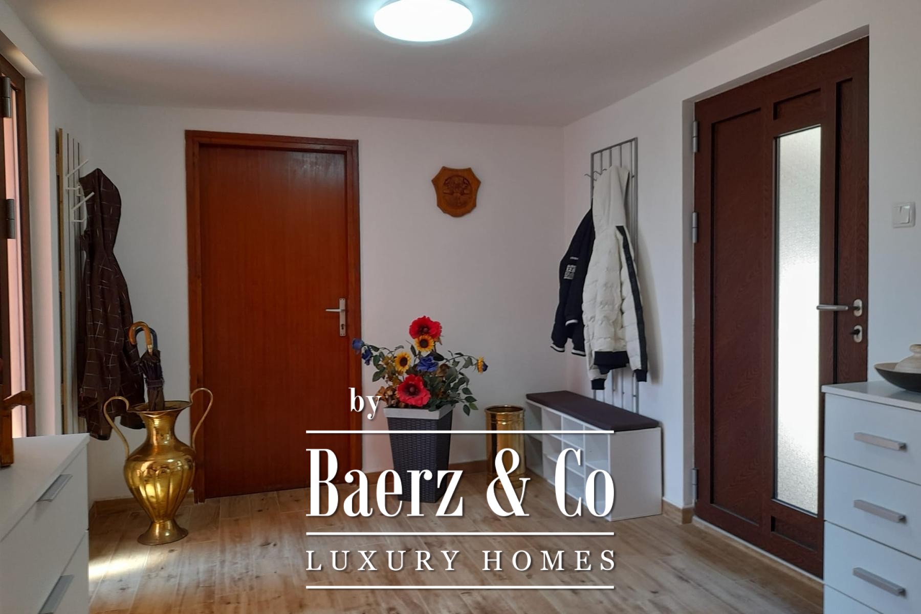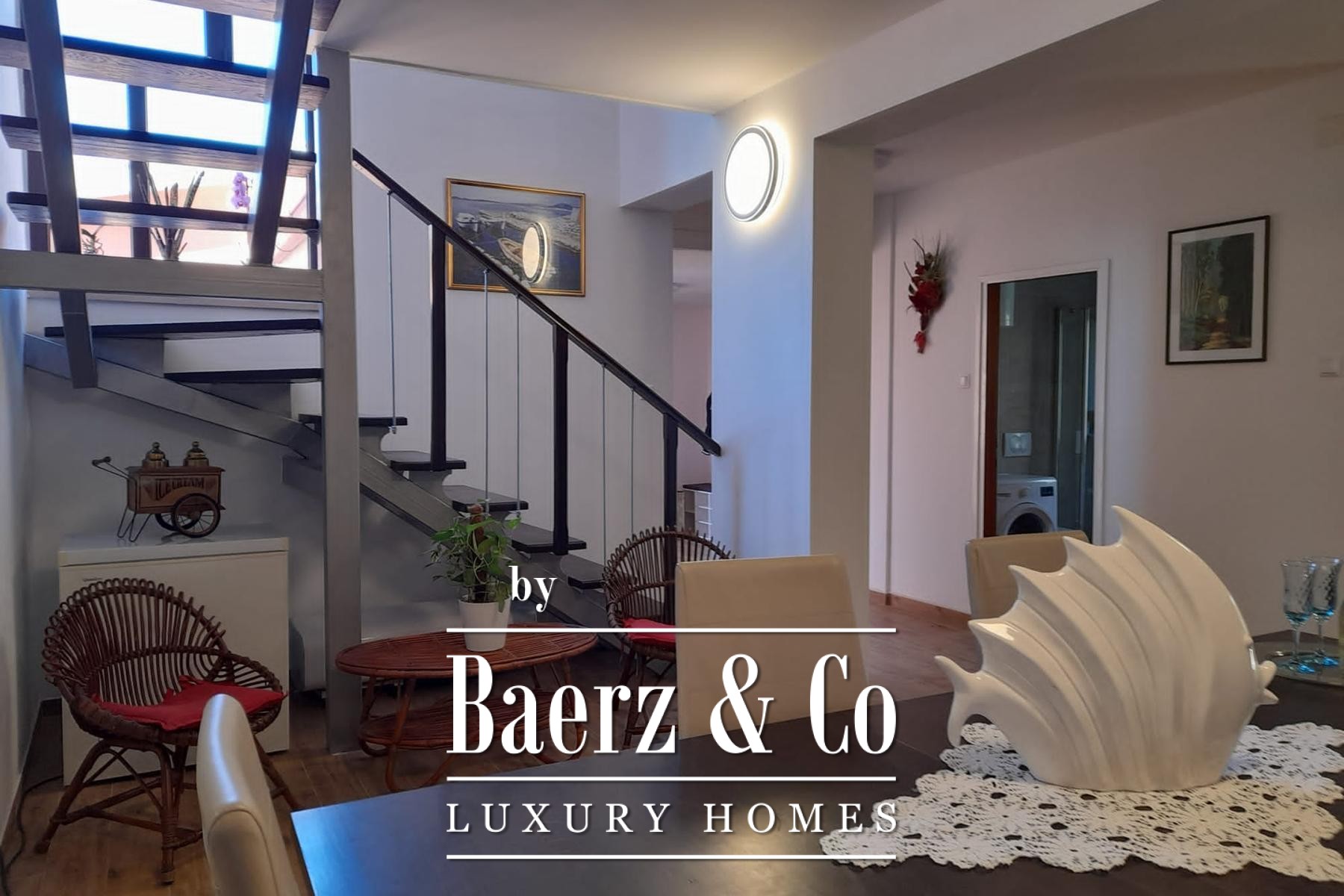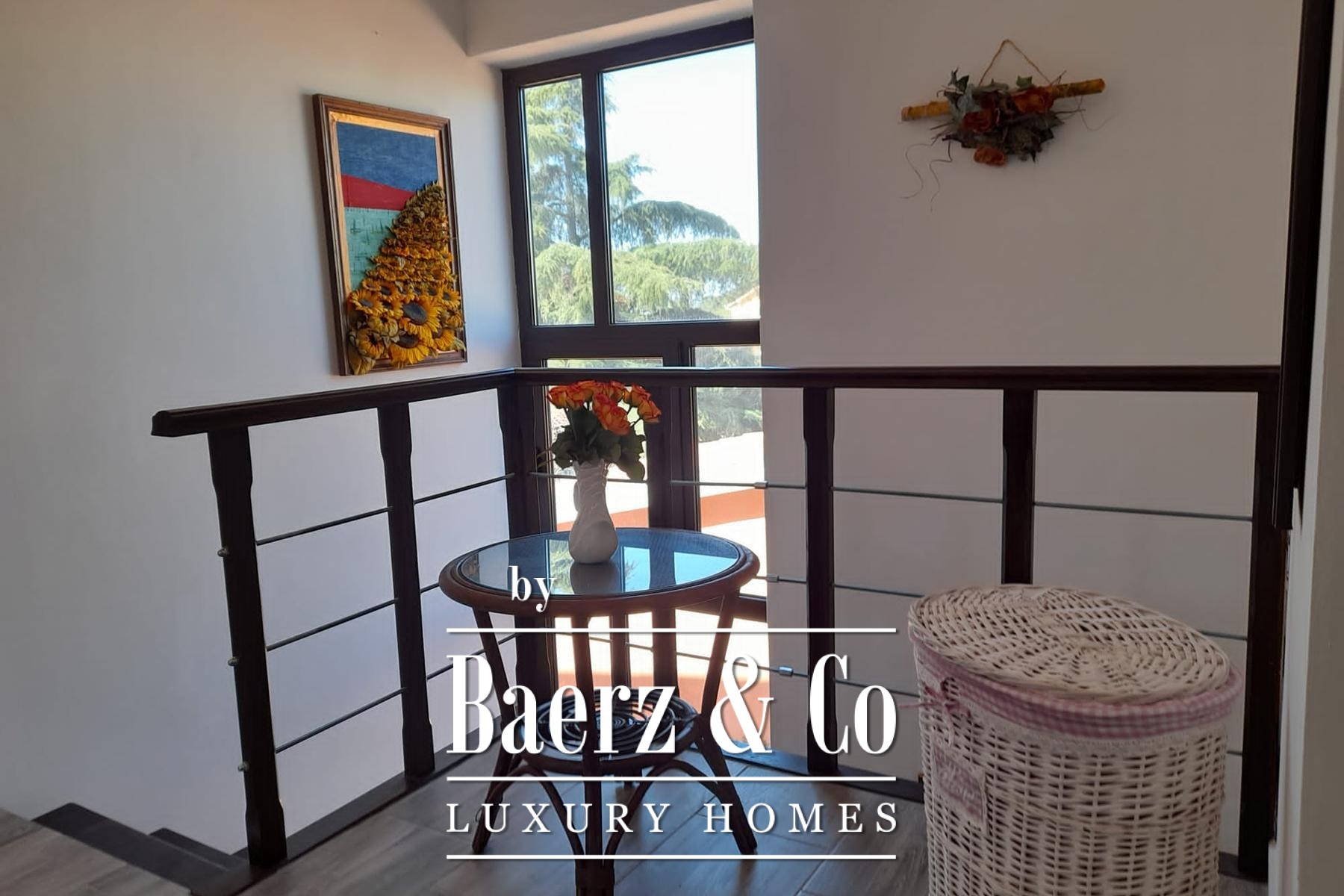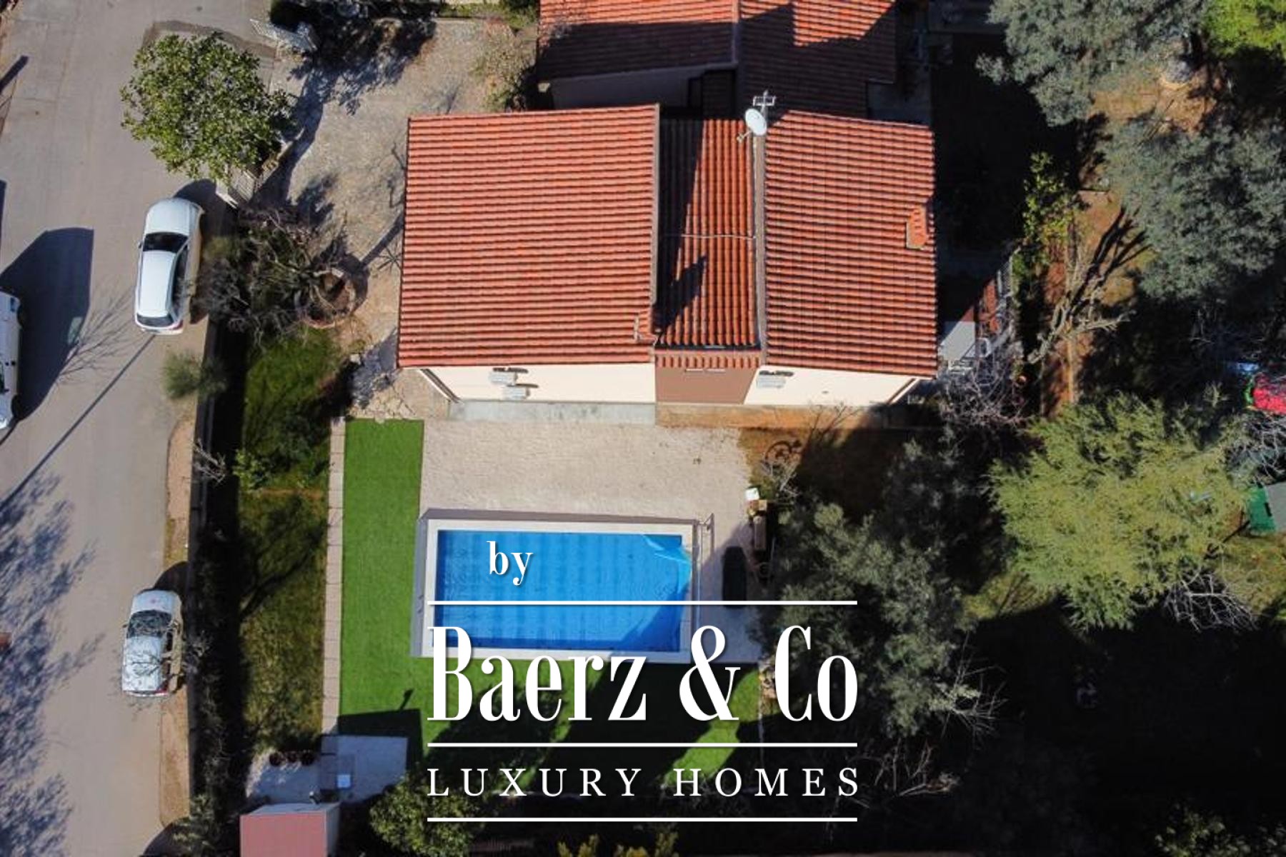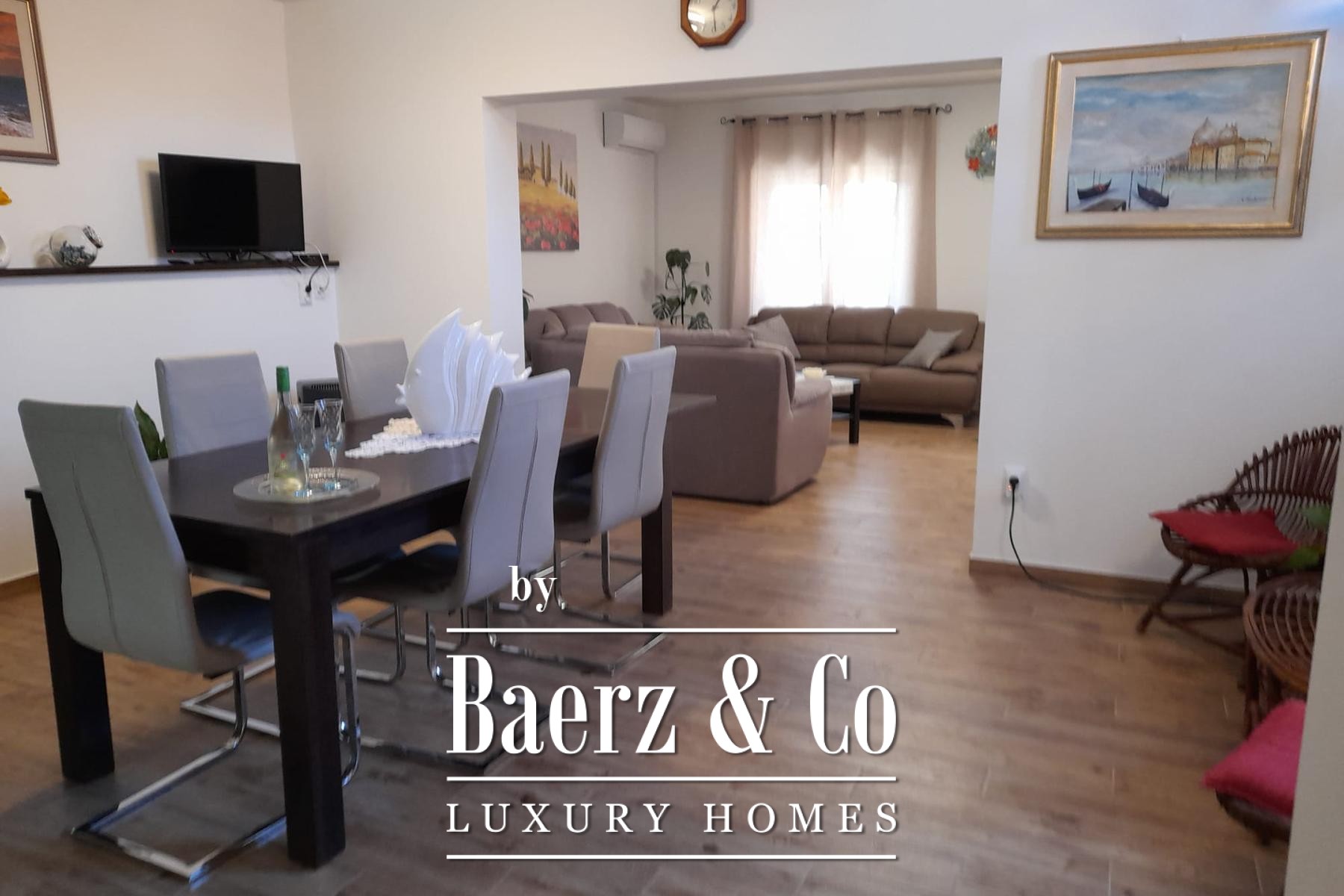 La maison se déploie sur deux niveaux. Le rez-de-chaussée allie luminosité et volumes généreux autour d’un vaste séjour, d’une cuisine entièrement équipée et d’une salle de bains, tous ouverts sur la terrasse et la piscine de 48 m². Un garage discret s’intègre avec élégance à la configuration de l’espace. Le jardin, ponctué d’une cheminée extérieure, ajoute une touche croate subtile à l’ensemble.