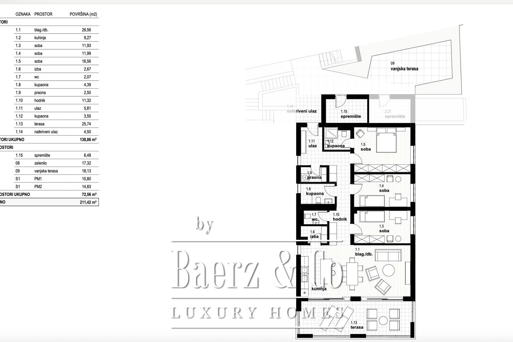 Cet appartement à Kostrena s’étend sur 251,58 m² au sein d’un immeuble neuf élégant, offrant une alliance rare entre architecture contemporaine et douceur de vie côtière. Répartie sur deux niveaux, la résidence dévoile cinq chambres agencées avec discrétion et cinq salles de bains, chaque espace étant pensé pour la lumière, l’intimité et une connexion harmonieuse avec l’extérieur. L’espace principal de vie et de réception, totalisant 40,92 m², s’ouvre sur une cuisine moderne de 7,79 m², créant ainsi le cœur du foyer, propice tant aux rassemblements qu’aux soirées paisibles.