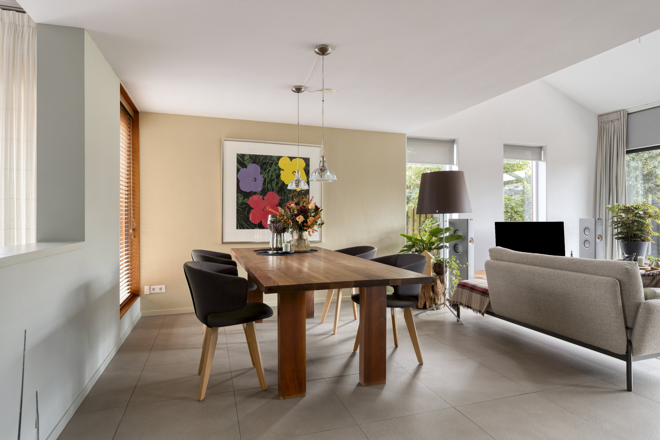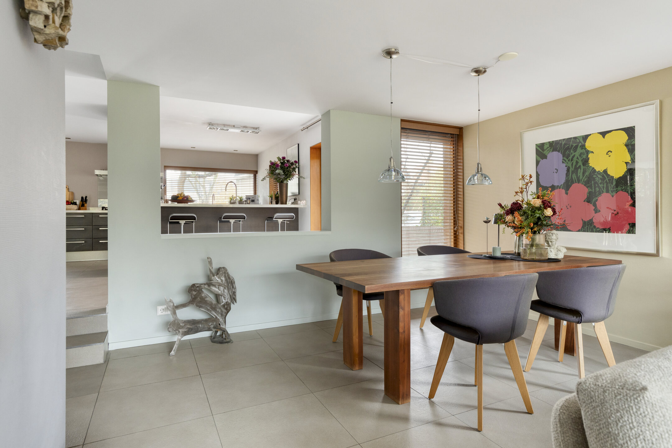Dès l’entrée latérale vitrée, une sensation de clarté et d’ouverture envahit la cuisine contemporaine, entièrement équipée avec une plaque à induction, un brûleur wok à gaz et des appareils haut de gamme. L’agencement ouvert se prolonge vers le séjour, où de larges baies coulissantes, des plafonds hauts et une cheminée centrale distillent luminosité et quiétude. À l’arrière, la véranda vitrée prolonge la saison et offre une connexion visuelle avec le jardin de plus de 30 mètres de profondeur, orienté ouest-nord-ouest, foisonnant de verdure locale et de faune.