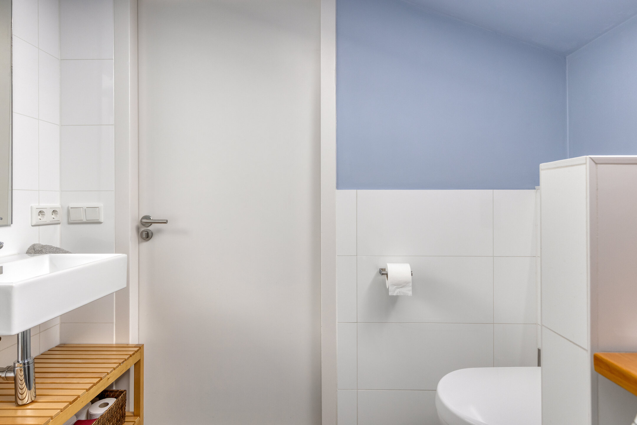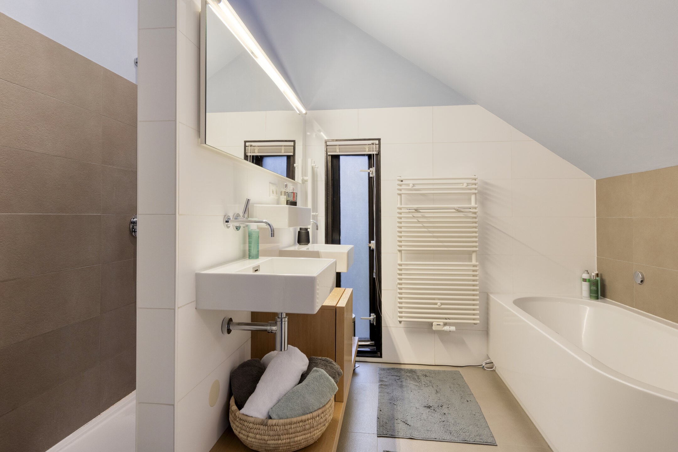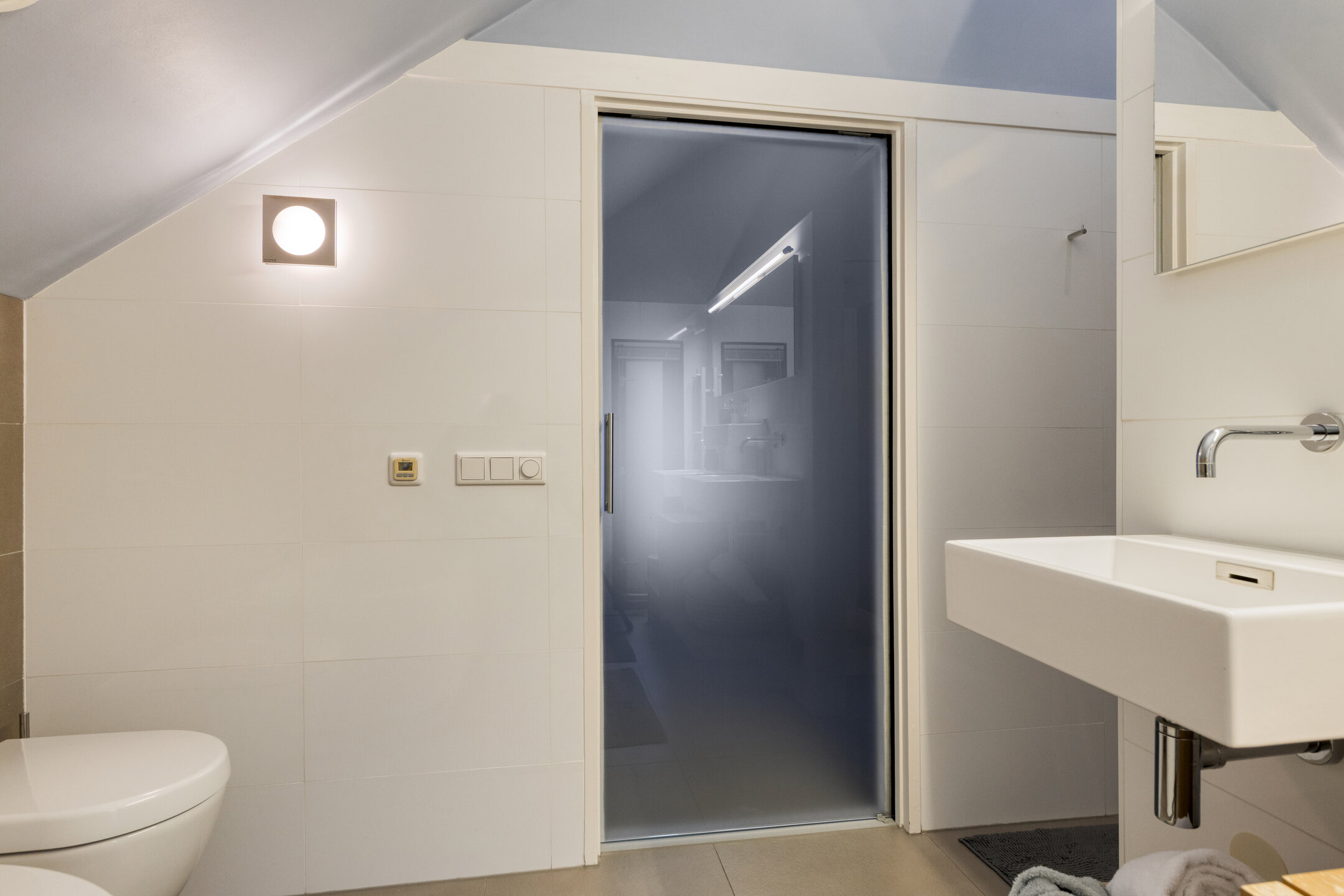 À l’étage, la suite parentale dispose d’une salle de bains attenante avec baignoire et douche à l’italienne, tandis que les chambres secondaires conservent cette impression d’espace et de lumière. Les prestations techniques — ventilation mécanique, chauffage par le sol, connexion fibre optique — témoignent d’une modernisation aboutie et d’un entretien exemplaire.