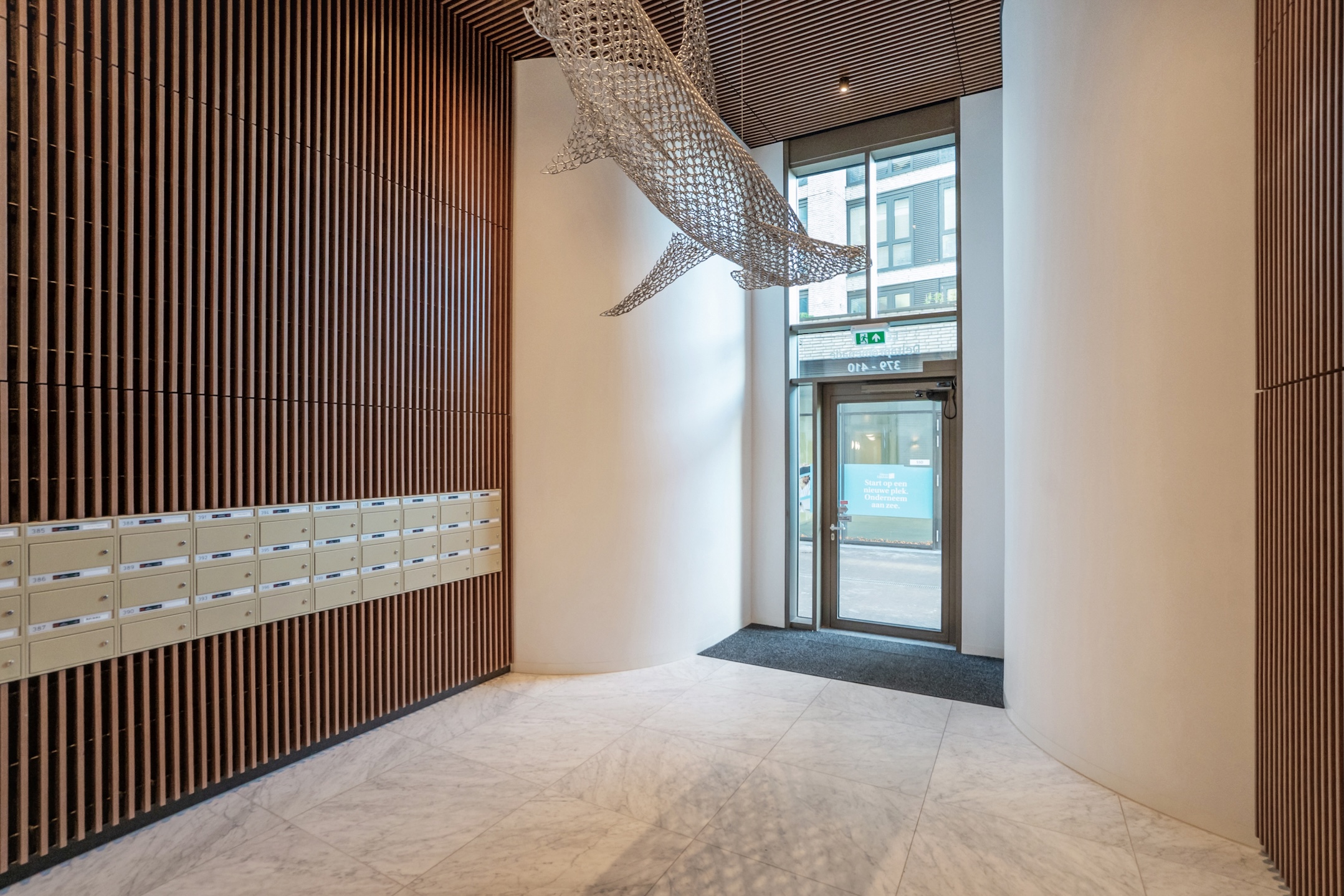 Gesloten centrale entree met videofooninstallatie. Vanuit hier bereikt u via de lift of het trappenhuis de vierde verdieping. De brede gangen zijn afgewerkt met luxe vloerbedekking en zorgen voor een stijlvolle entree naar het appartement. Camerabewaking op begane grond en in liften.