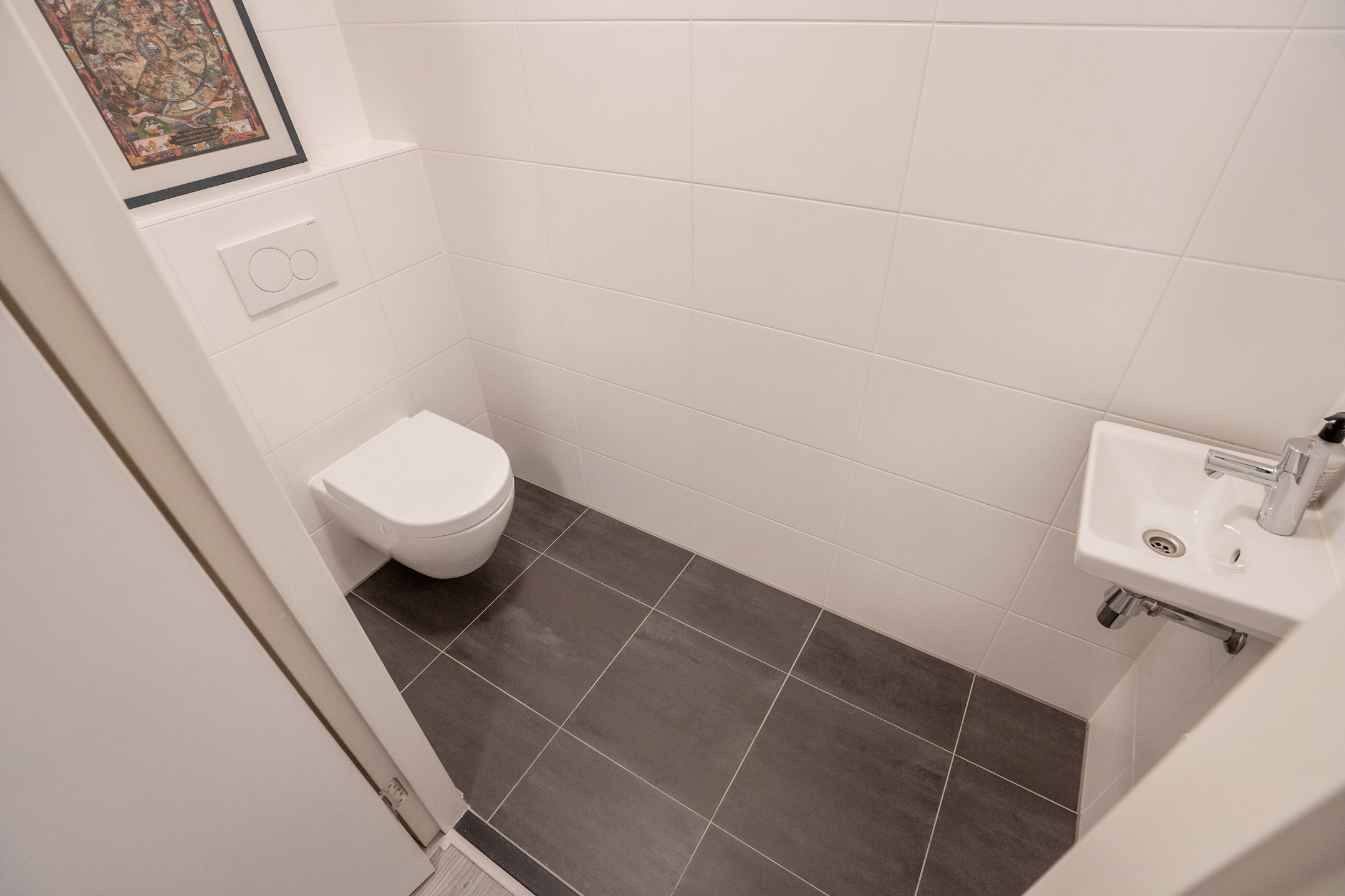 Een deur in de woonkamer brengt u naar de gang met een diepe kast waarin veel bergruimte mogelijk en de technische voorzieningen verdekt zijn opgesteld. Een moderne badkamer de kleinere van de twee met; een plavuizen vloer, diepe inloopdouche, badkamermeubel en toilet.