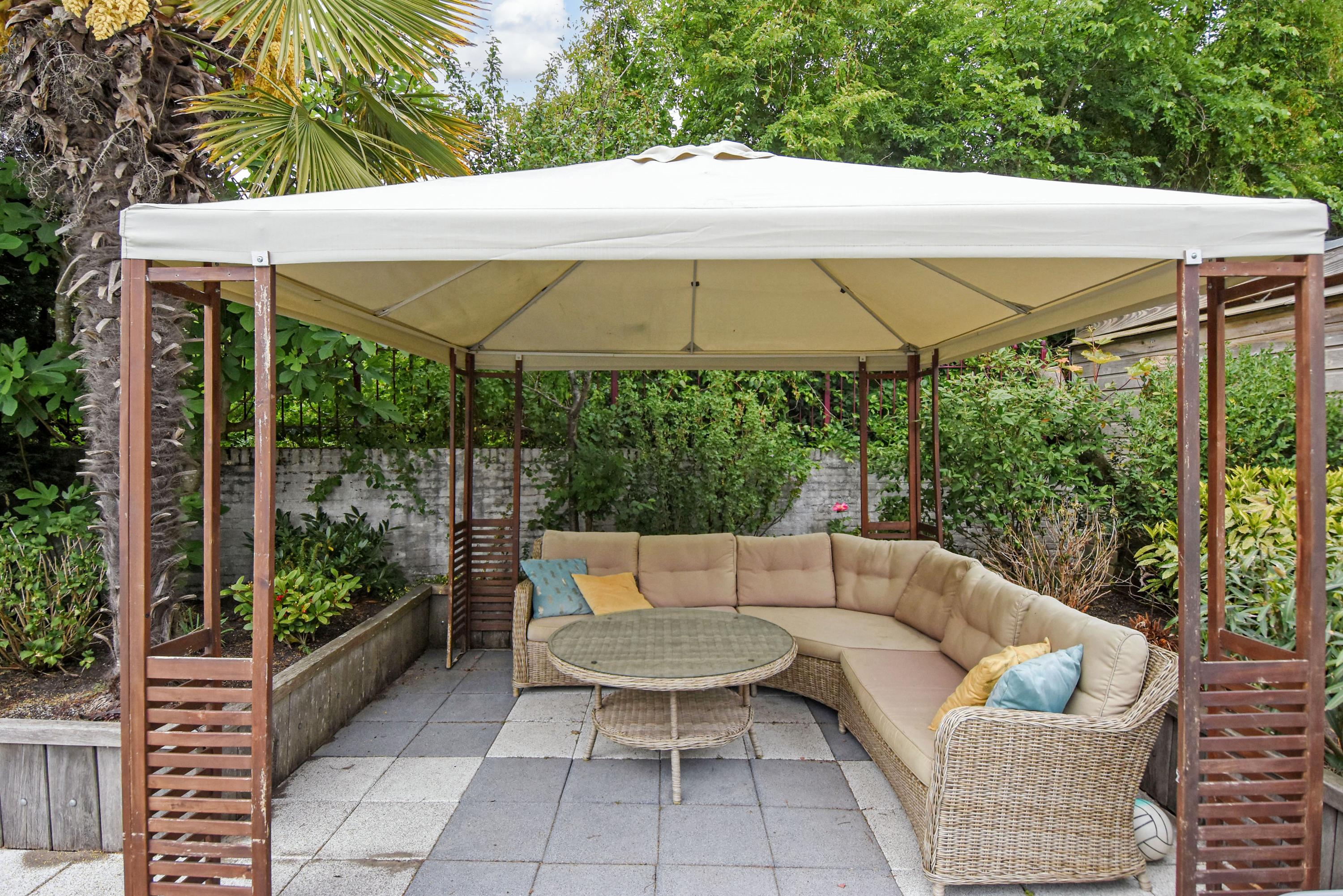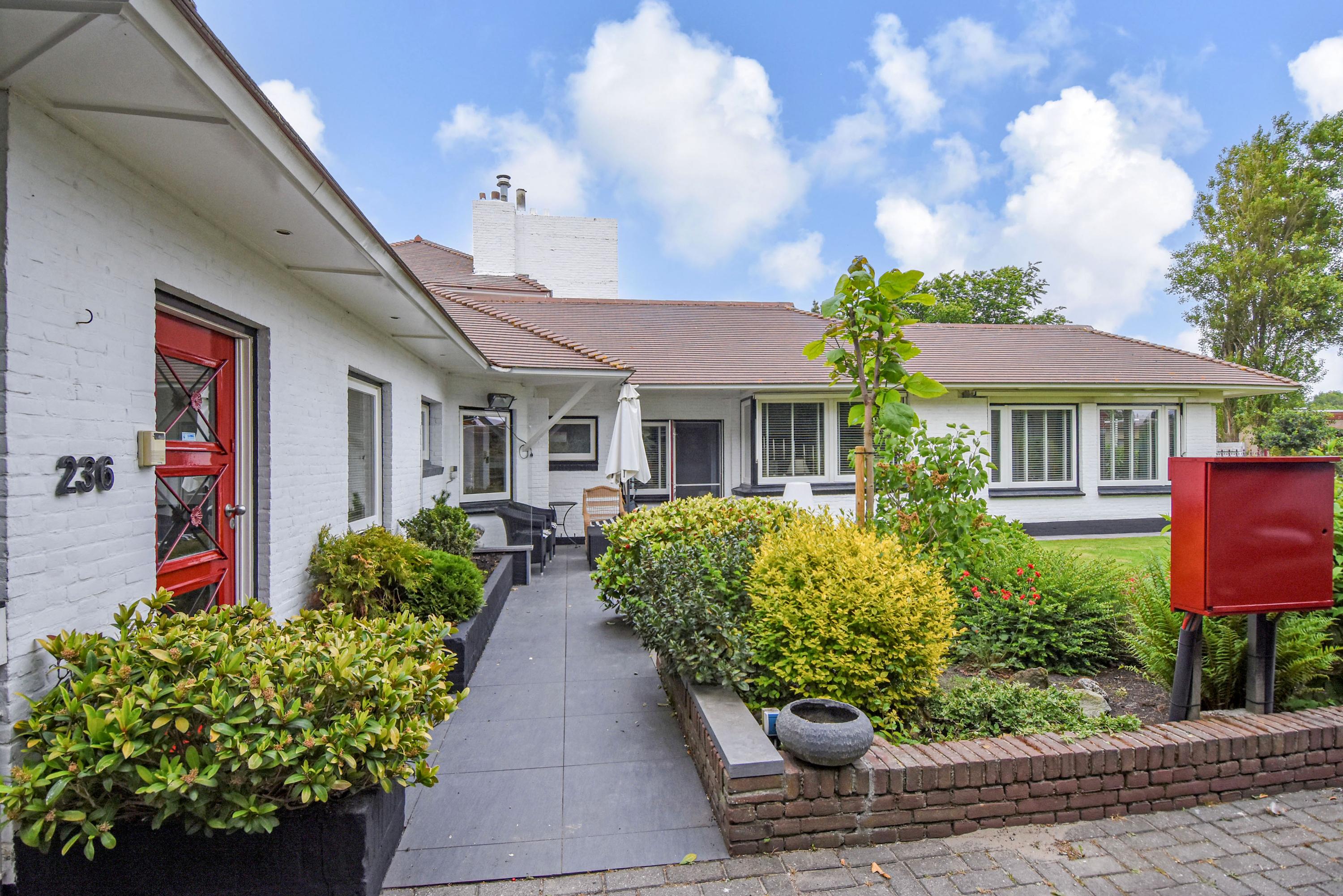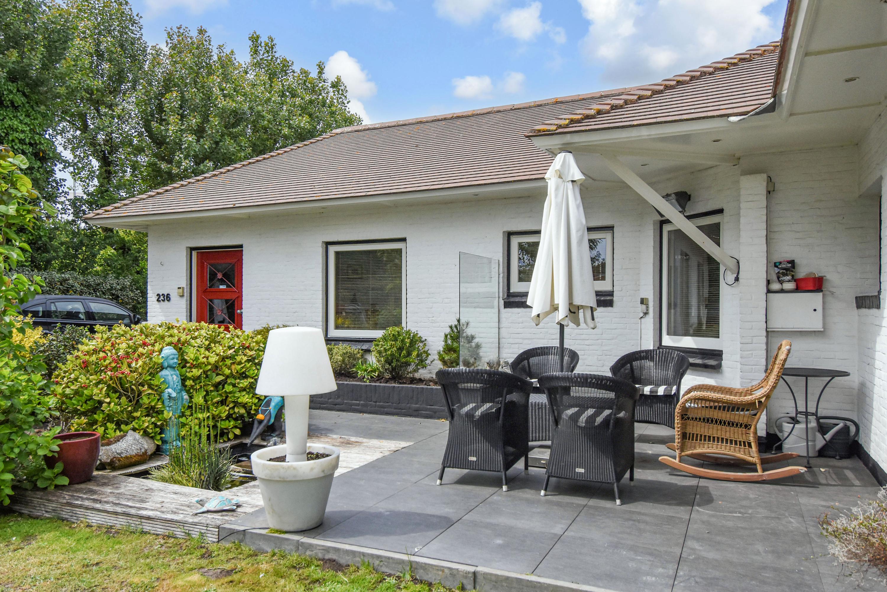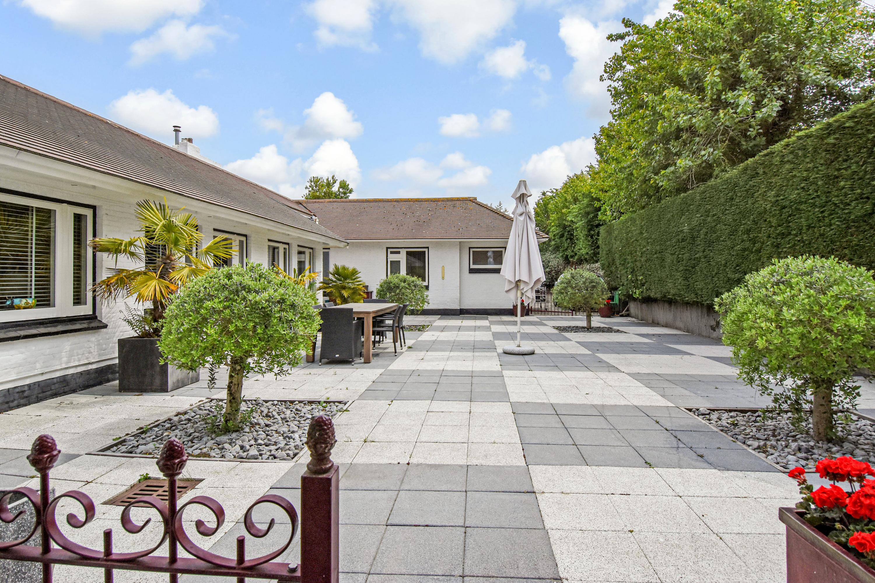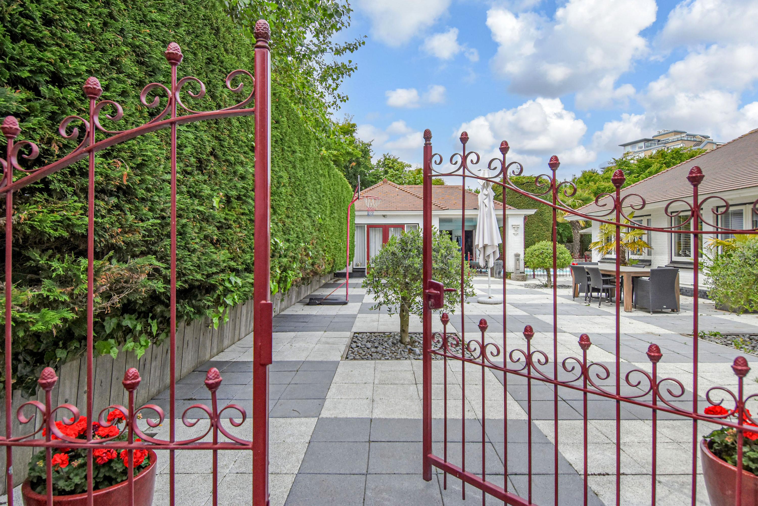 De buitenruimte is bijzonder royaal en veelzijdig. De voortuin is aangelegd met een gazon, een sierlijke vijver en een ruim terras dat ideaal is om te genieten van de ochtend- en middagzon. De zijtuin biedt een zeer groot terras dat gunstig is gelegen voor middag- en avondzon, perfect voor lange zomerse diners en ontspanning in de zon. De achtertuin is fraai aangelegd met meerdere terrassen, een zwembad en een overdekt zitgedeelte. Achter in de tuin bevindt zich een multifunctioneel bijgebouw, de voormalige garage, die dienst kan doen als gastenverblijf of berging, en beschikt over een eigen badkamer met douche, toilet en wastafel.