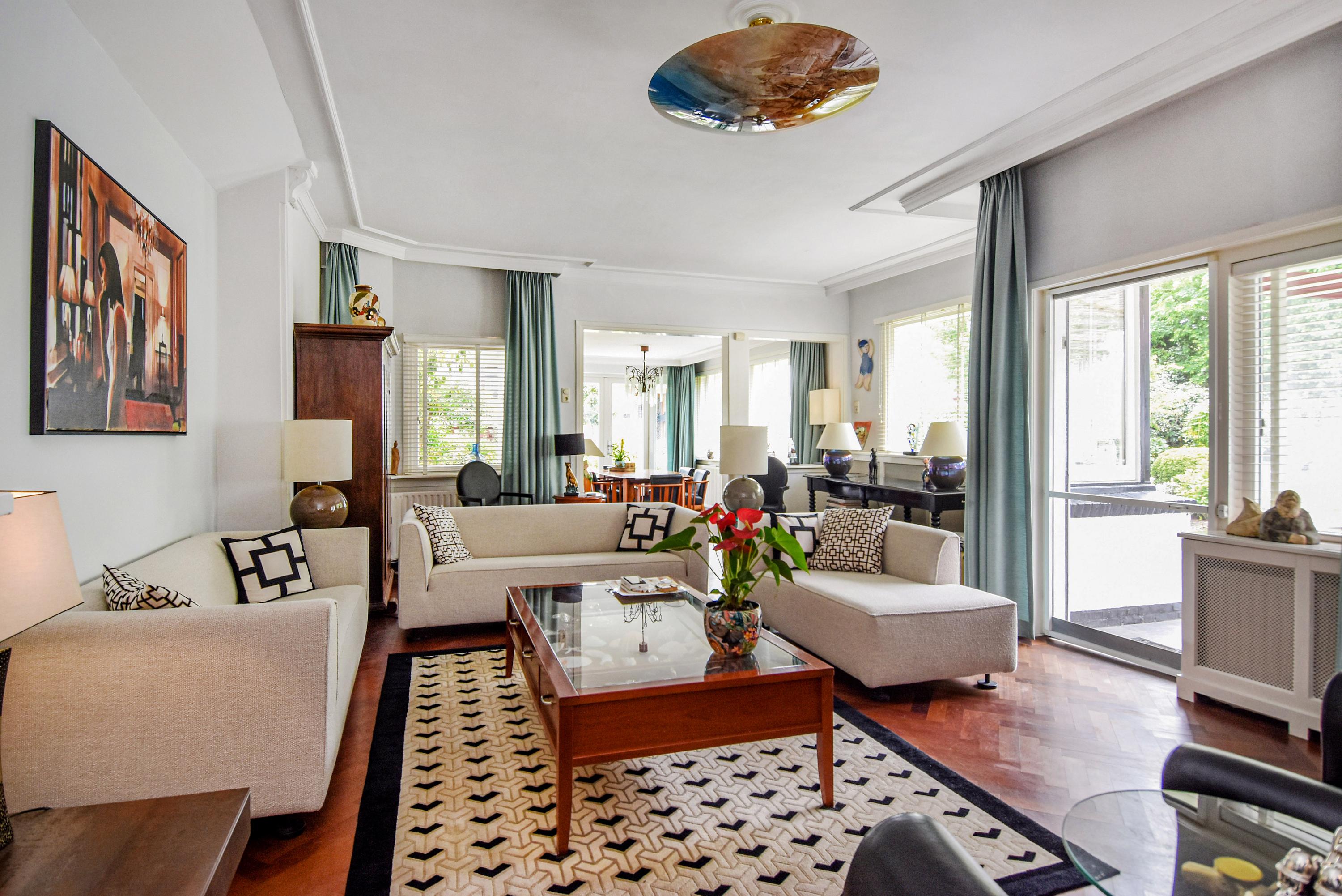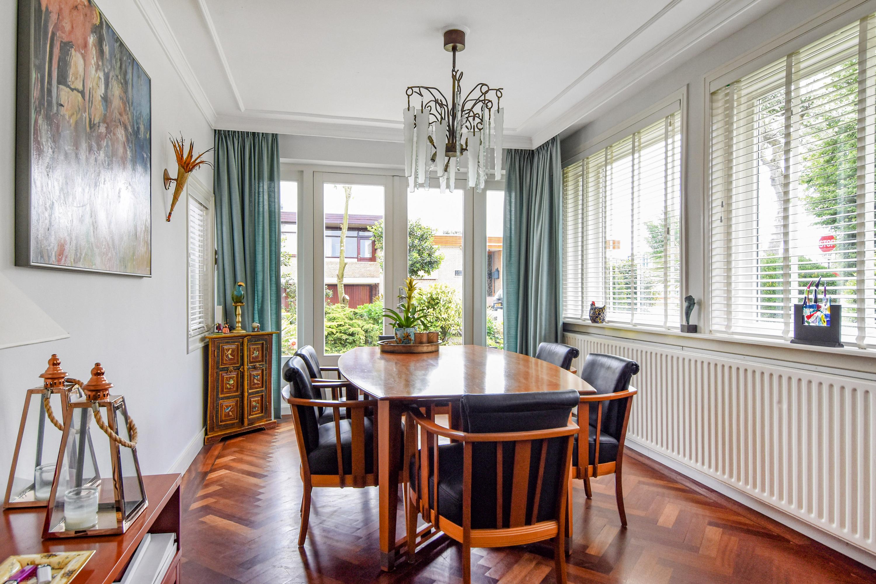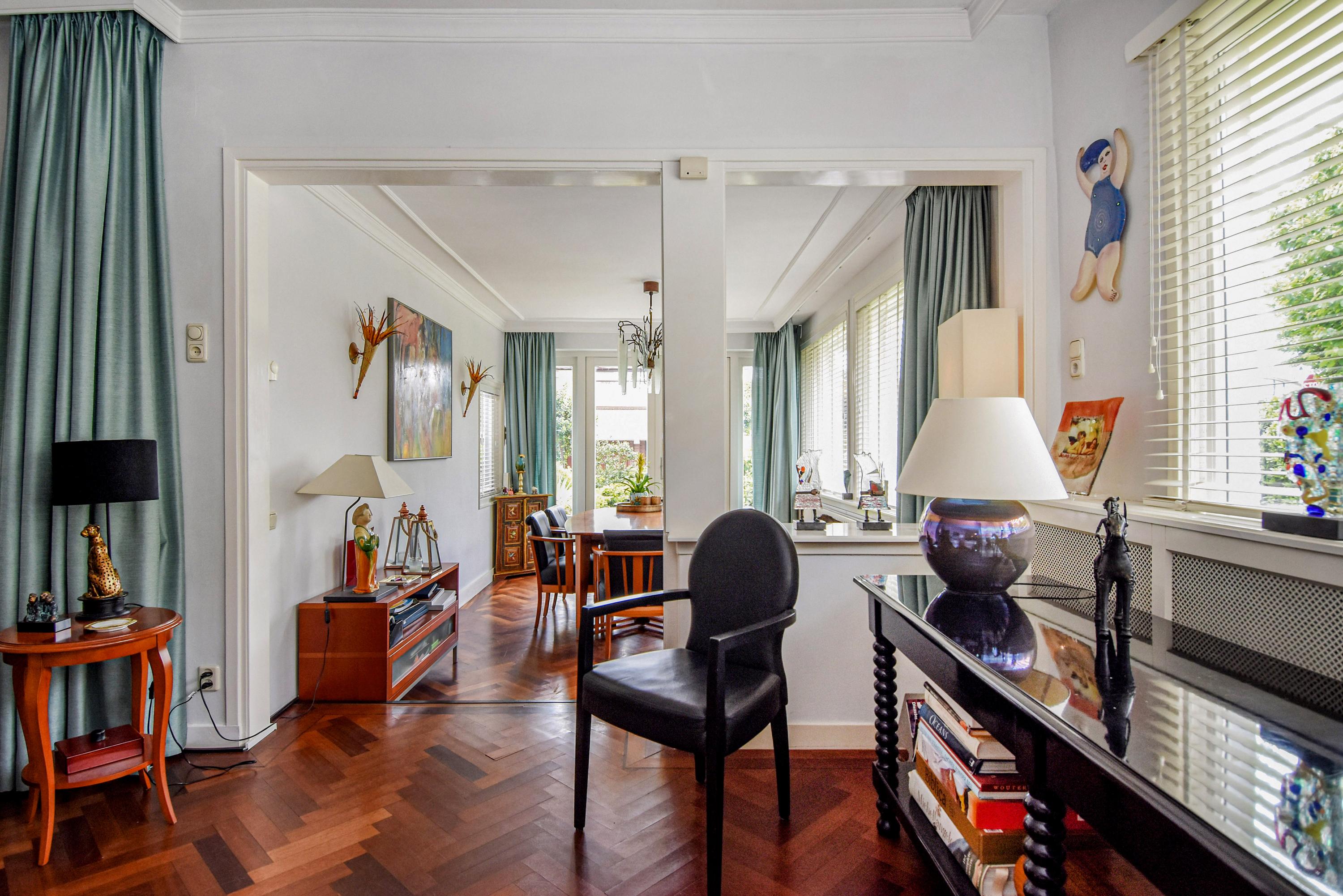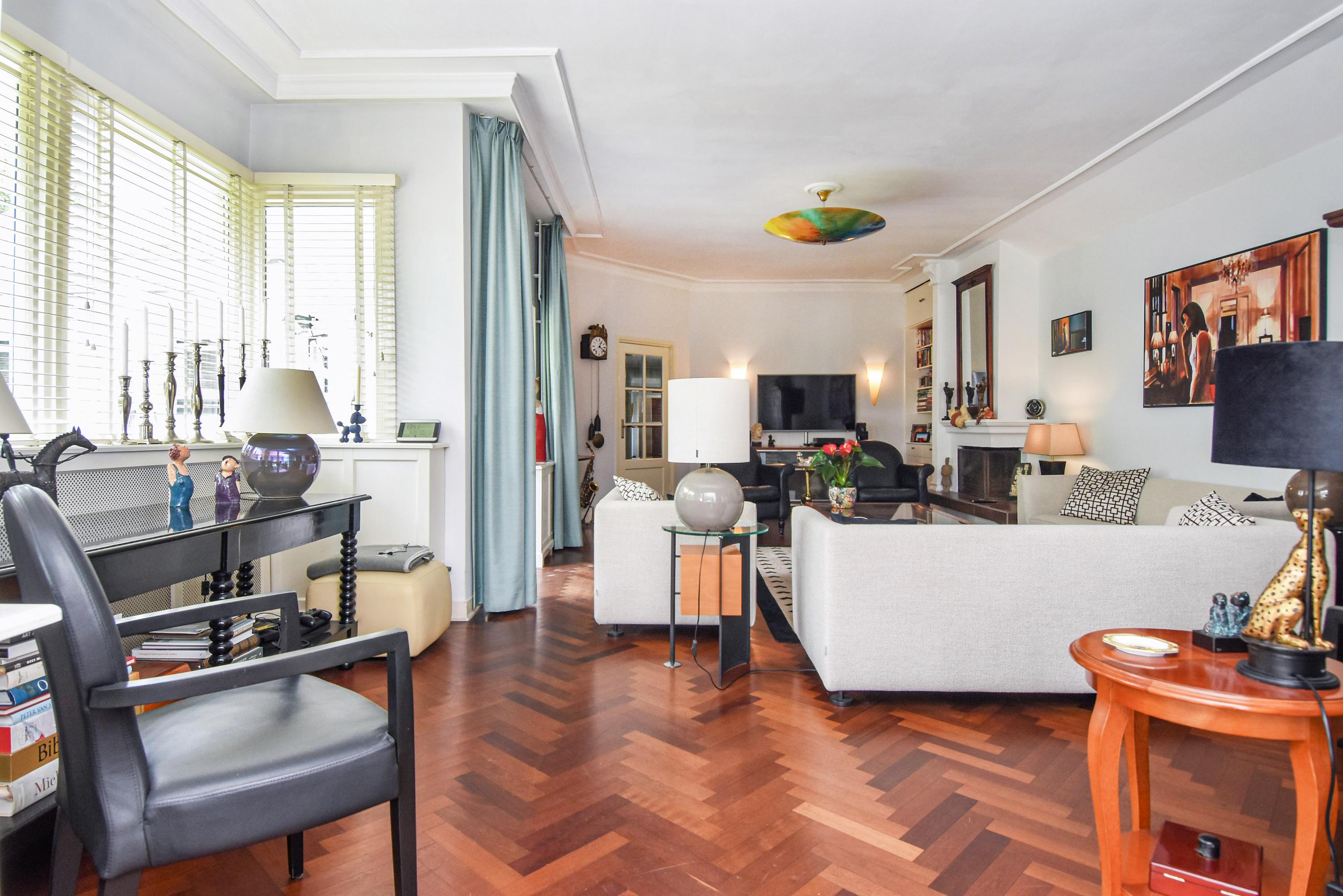 Aan de voorzijde bevindt zich een lichte studeerkamer/ slaapkamer. De woonkamer is voorzien van een klassiek visgraatparket, een open haard en openslaande deuren naar de zijtuin met terras. De eetkamer aan de voorzijde beschikt eveneens over visgraatparket en openslaande deuren naar de voortuin.