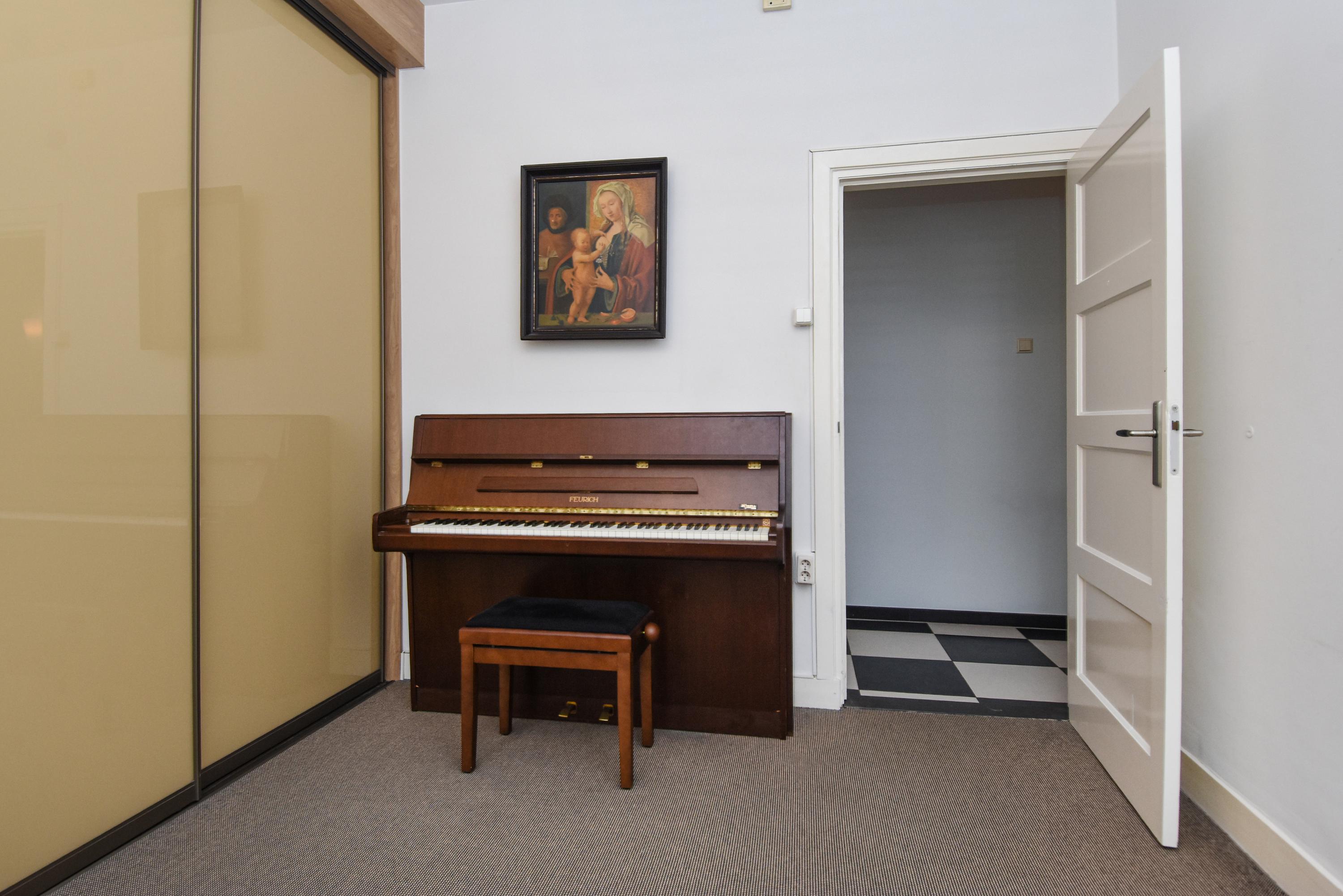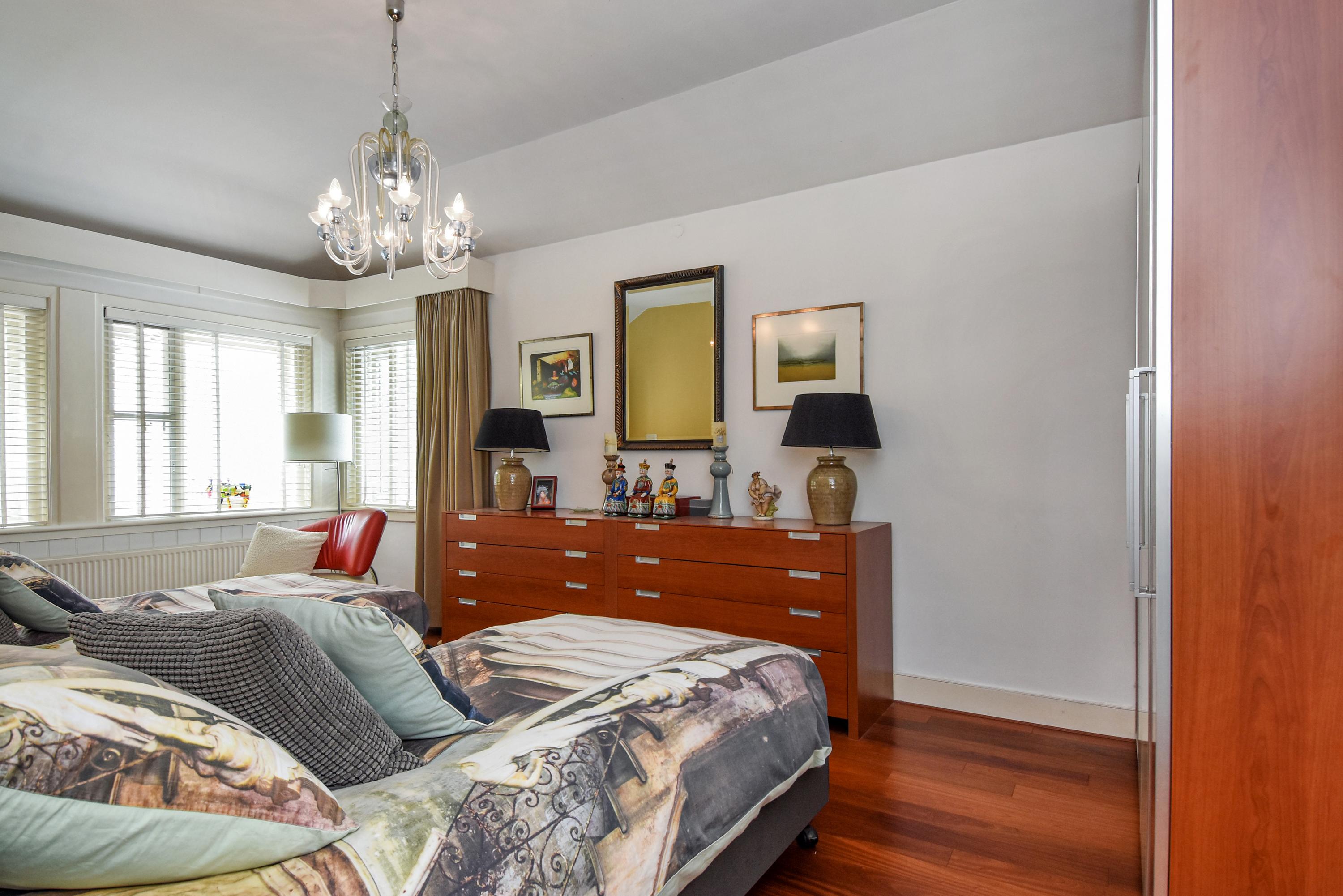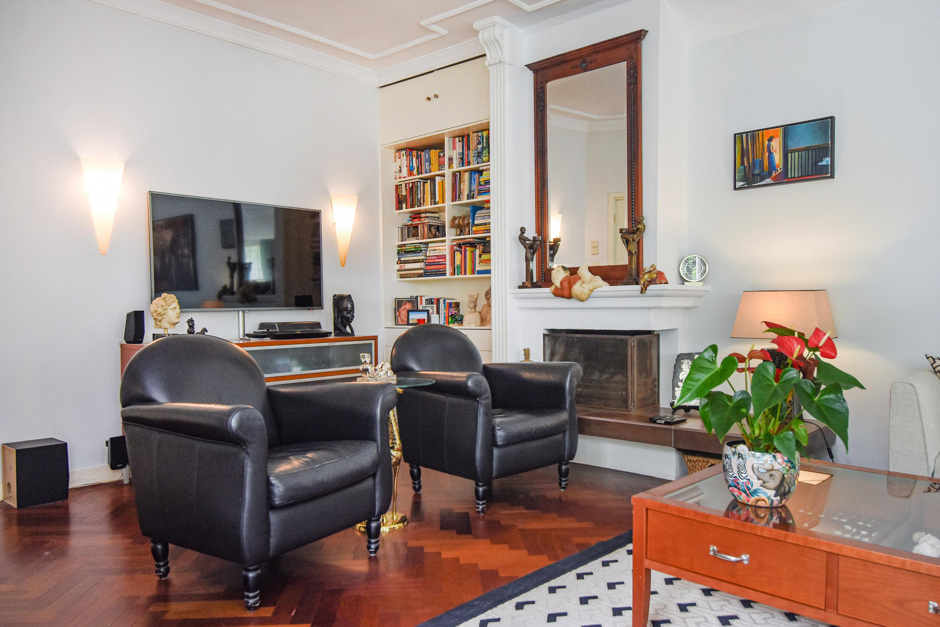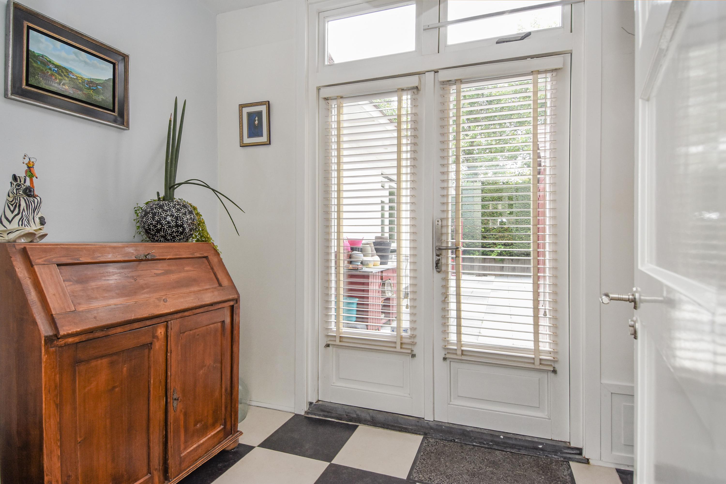 Aan de voorzijde bevindt zich een lichte studeerkamer/ slaapkamer. De woonkamer is voorzien van een klassiek visgraatparket, een open haard en openslaande deuren naar de zijtuin met terras. De eetkamer aan de voorzijde beschikt eveneens over visgraatparket en openslaande deuren naar de voortuin.