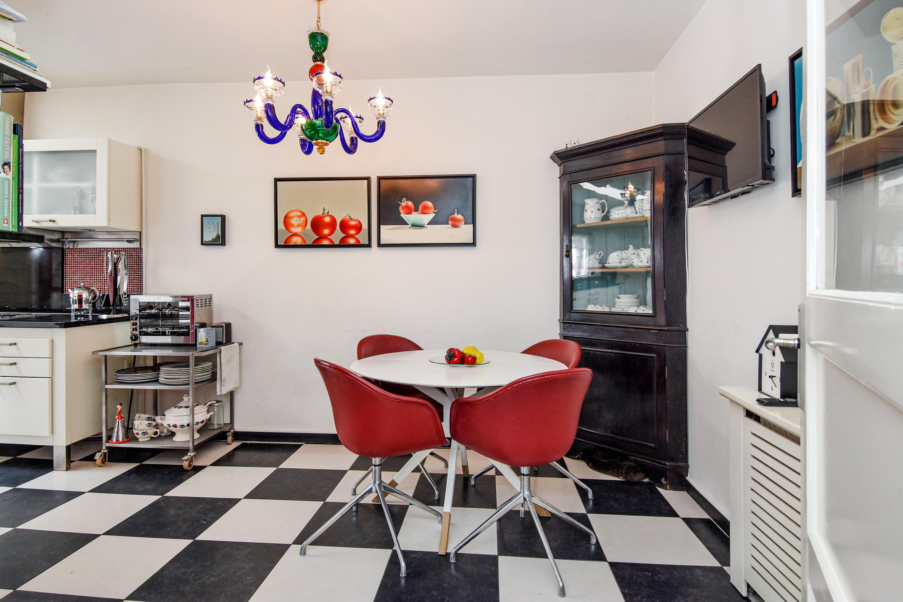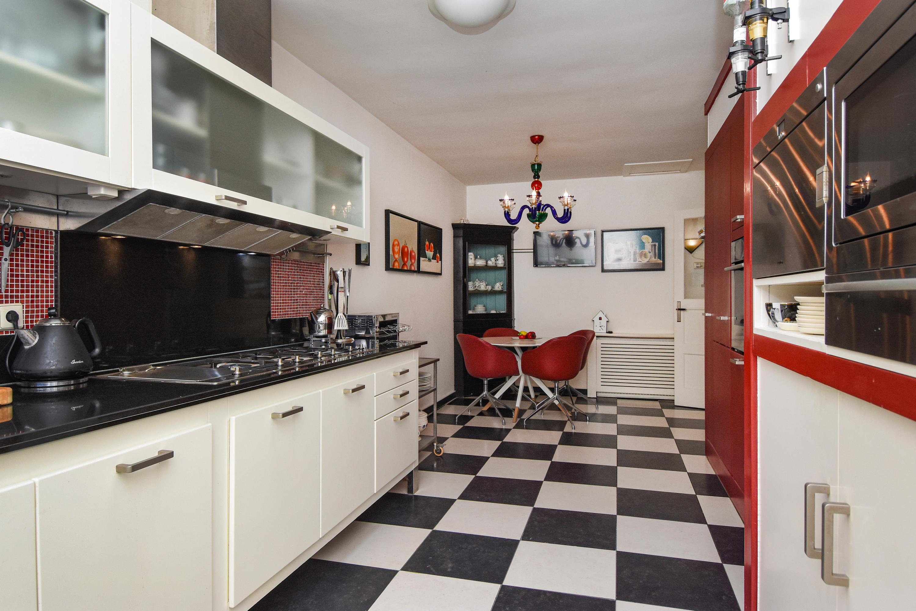 De ruime keuken is uitgerust met een dakraam, zwart-witte vloertegels, vaste kasten en diverse inbouwapparatuur, waaronder een oven, koelkast, vriezer en een aparte kast met de CV-ketel. Het stenen aanrecht beschikt over vijf gaspitten en een kookplaat, met een brede afzuigkap erboven.